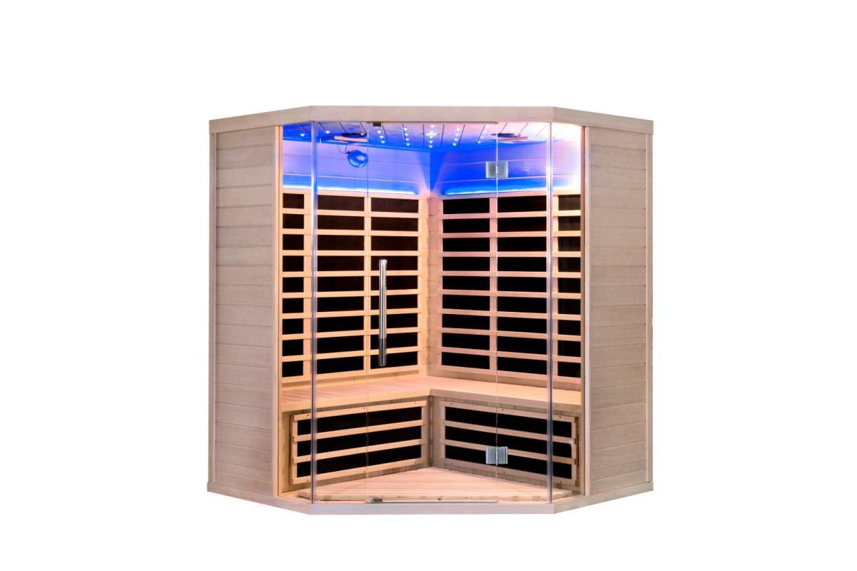 LM-N3G, Houtsoort: voor 3~4 personen, 2850W in totaal, Bluetooth LCD controle paneel, 7 kleuren therapy verlichting, led strip, Tempered Glass, zuurstof ionizer, bekerhouder, boekenplank, luidspreker, 11 Stralers afmeting: (1500x650x1200x1900mm)