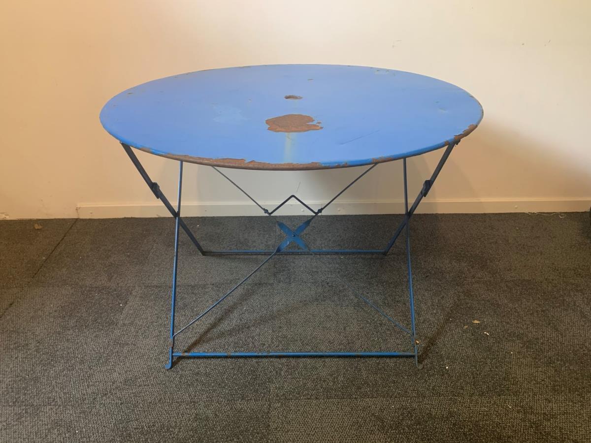 metalen ronde tafel, plooibaar, met parasolgat, diam. 97 x H 71 cm