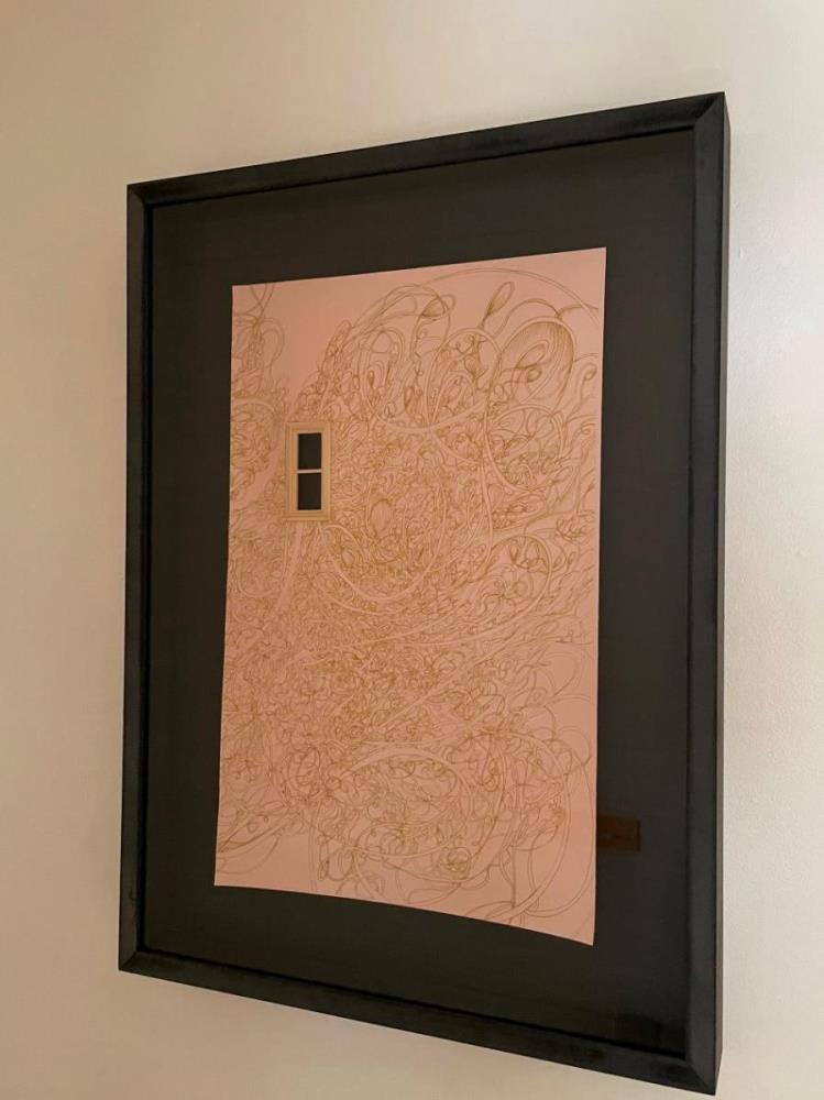 Het werk refereert door het materiaalgebruik roze skaileer en houten raampje aan het werk Hutte van Vansteenkiste. Joke Raes tekende via laser een prachtige tekening over het geheel waardoor beide beeldtalen van de kunstenaars vermengen tot een nieuw geheel een nieuwe dialoog.