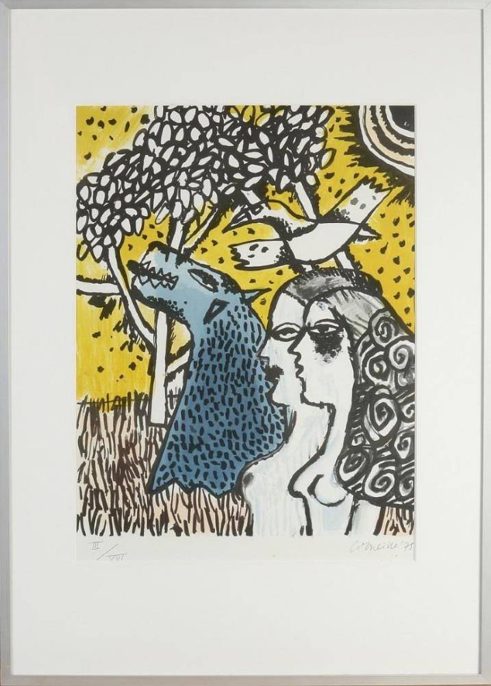 Corneille<br/z> Women with horse and pigeon <br/z> Litho <br/z> Editie op 21, dit is nummer 3 <br/z> 48*36 cm, met kader 72*51 cm <br/z> 1975 <br/z> Ingekaderd (kleine basrt in glas, werk is zelf in perfecte staat)