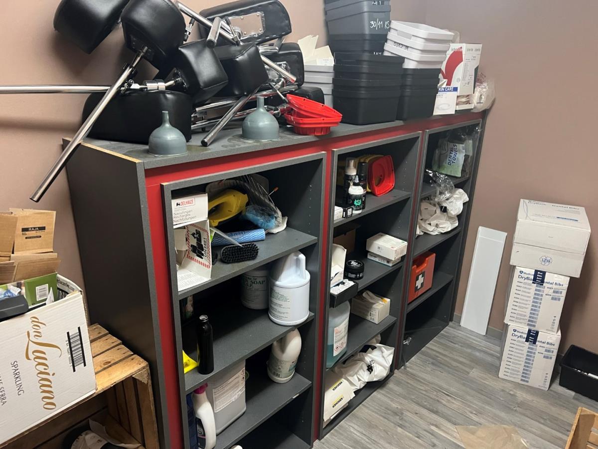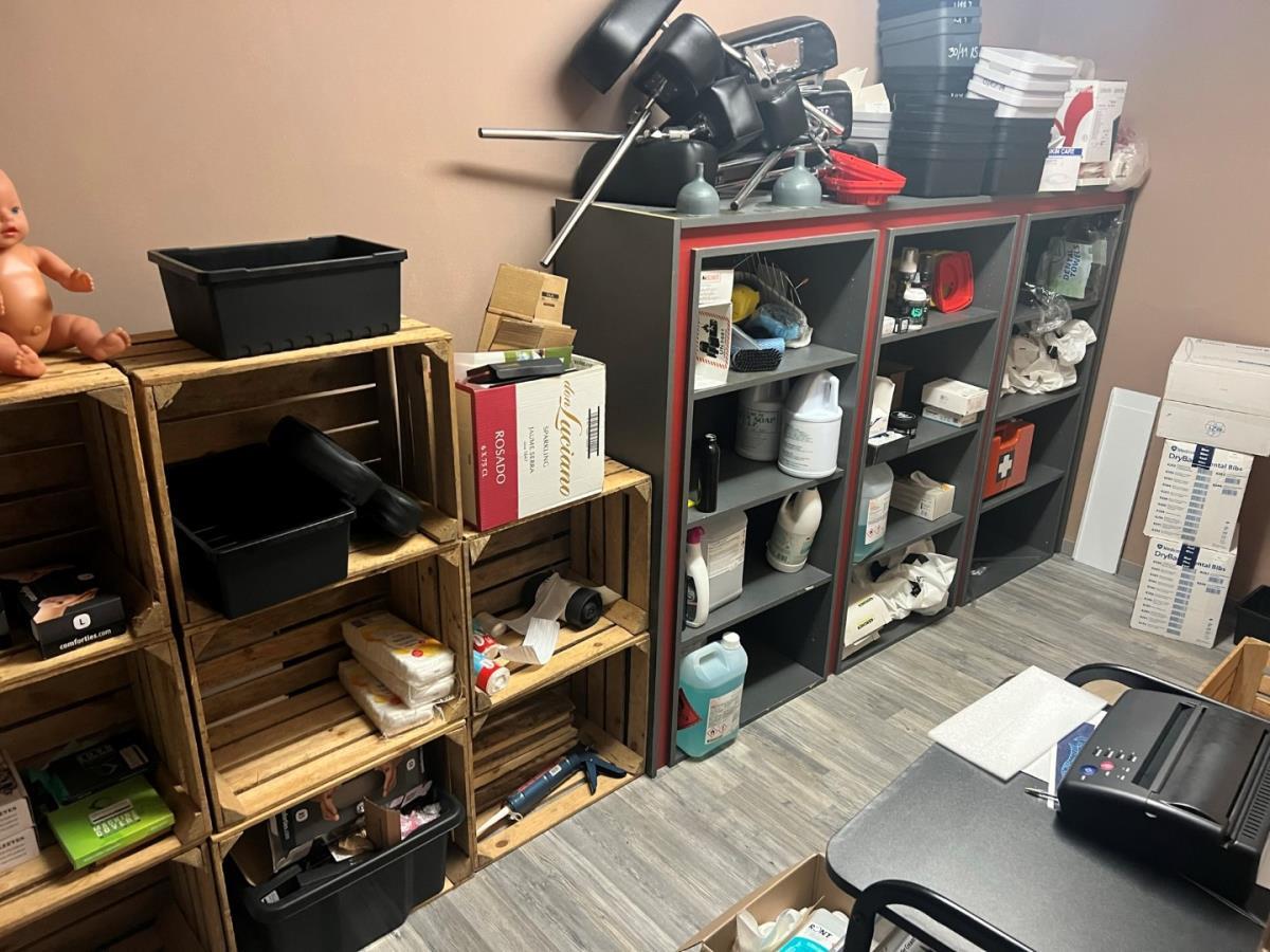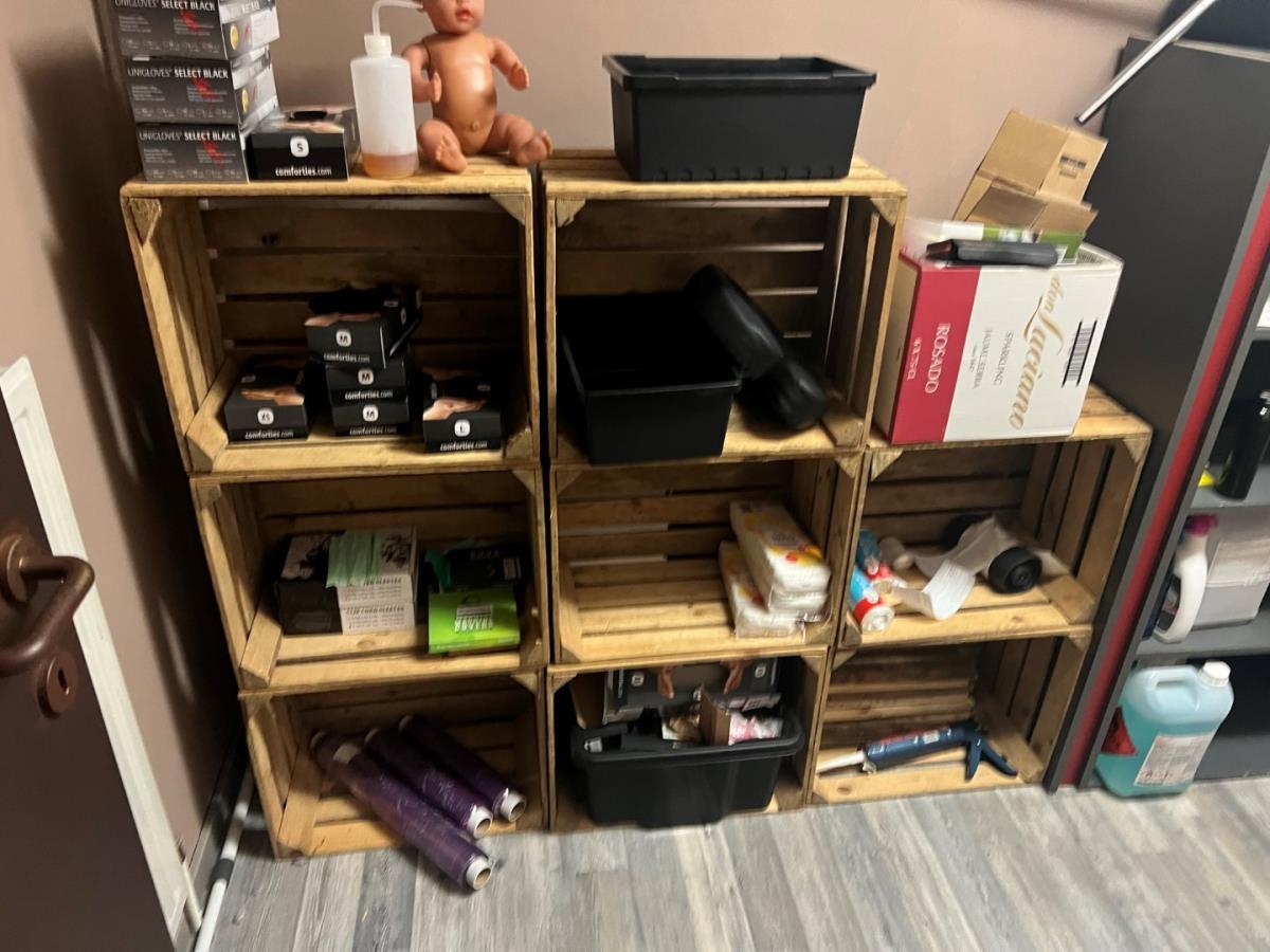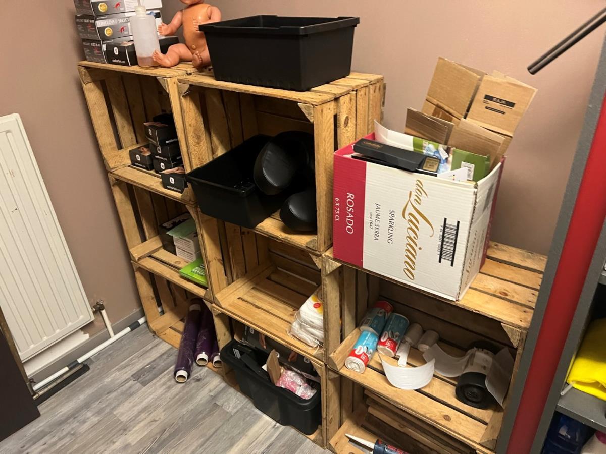 Bestaande uit: plastificeer machine, latex handschoenen, naverzorgings producten, lederen hoofdsteunen, 12 houten fruitmandjes, sorteerbakjes, zeep en andere