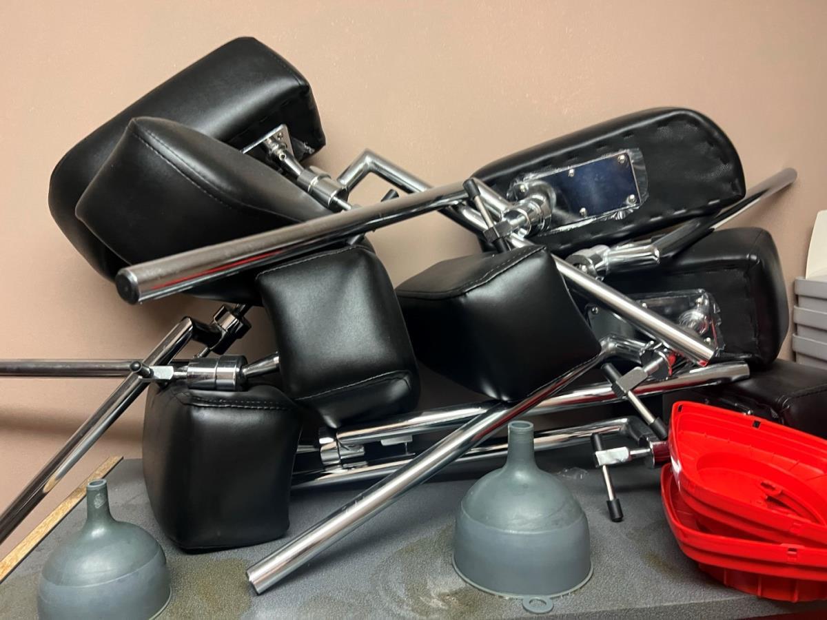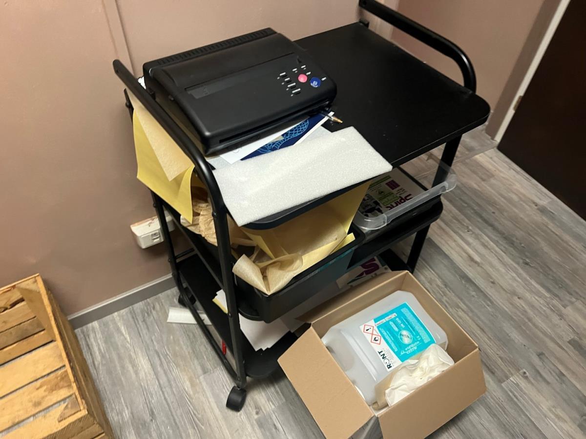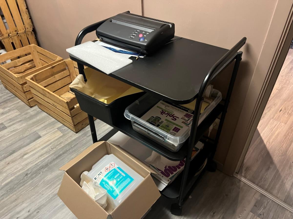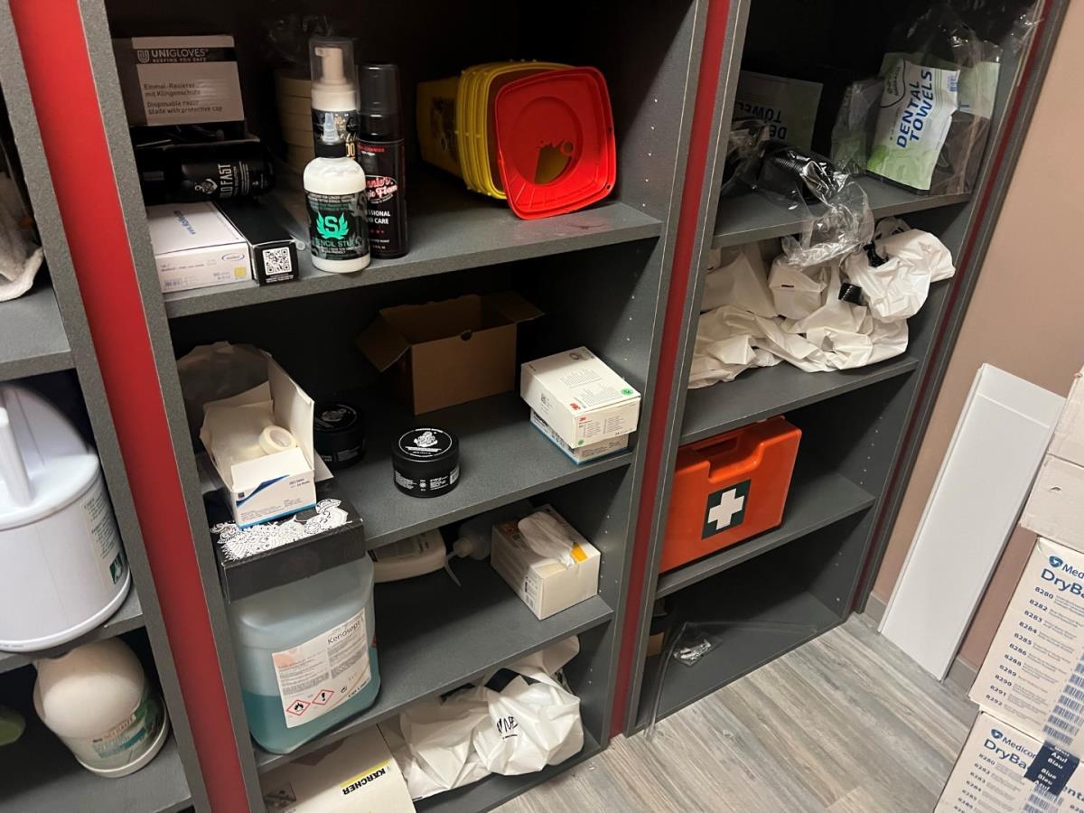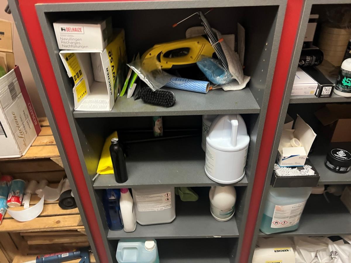 Bestaande uit: plastificeer machine, latex handschoenen, naverzorgings producten, lederen hoofdsteunen, 12 houten fruitmandjes, sorteerbakjes, zeep en andere