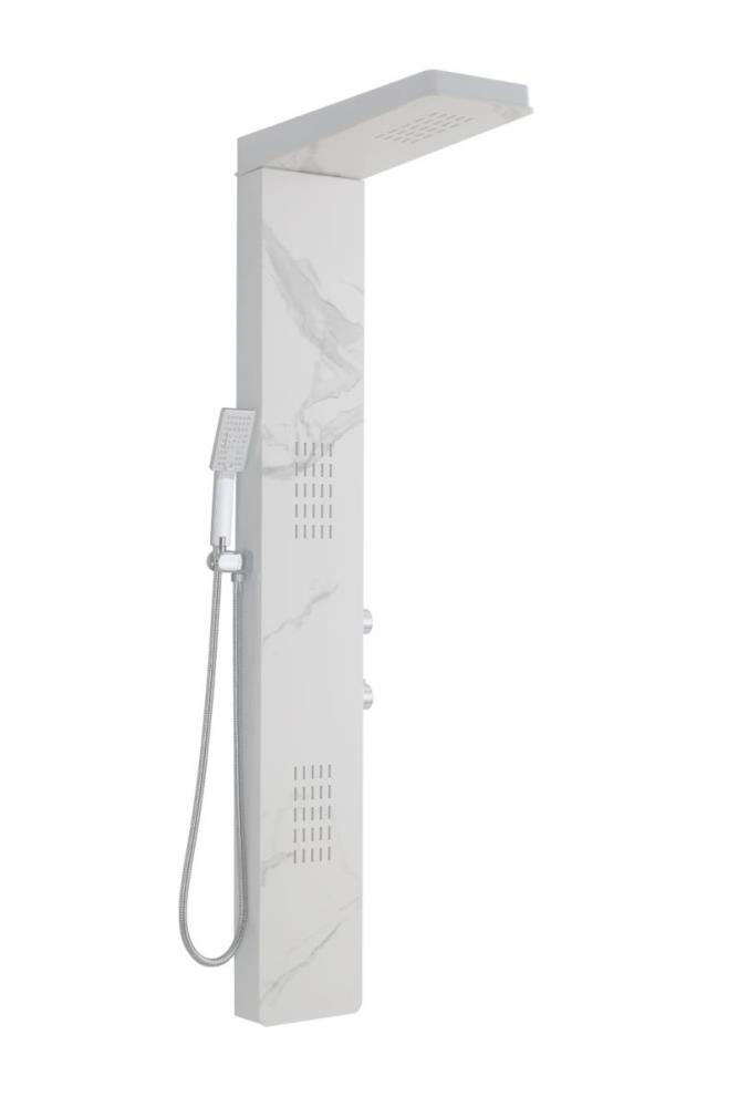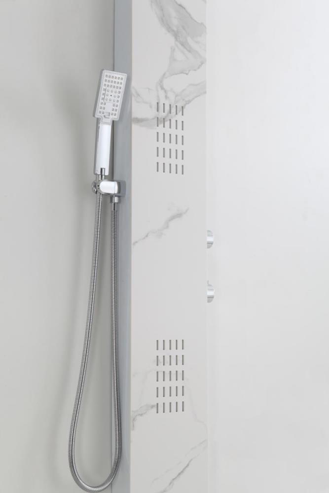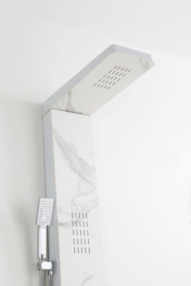 1x rvs douchepaneel, model: 5616 marmer wit matt , functies: 1xbodyjets, 1xhoofddouche, 1xhanddouche, mengkraan, flexibele slang 150cm, afm. 150x22cm (hxb), dit betreft een nieuw product in doos.