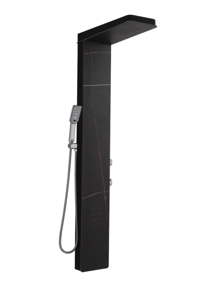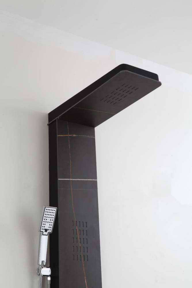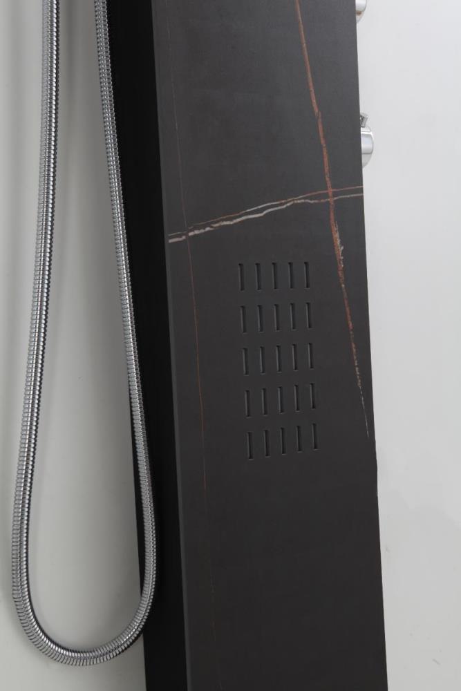 1x rvs douchepaneel, model: 5616 marmer zwart matt , functies: 1xbodyjets, 1xhoofddouche, 1xhanddouche, mengkraan, flexibele slang 150cm, afm. 150x22cm (hxb), dit betreft een nieuw product in doos.