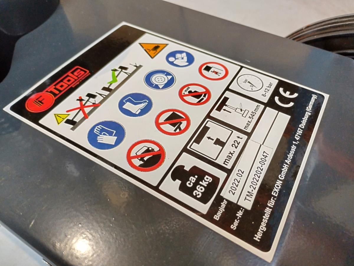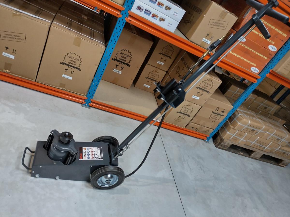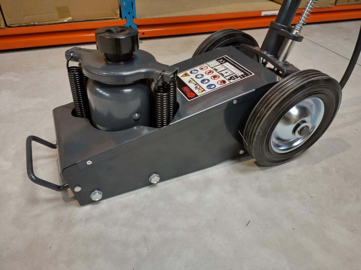 Werkplaats krik 22 ton, Pneumatisch aangedreven hydraulische krik voor het zware werk, min hoogte 22,5cm, max hoogte 43,5cm, 4 hulp opzetstukken, luchtkoppeling 1/4", werkdruk 6,9-8,3 bar