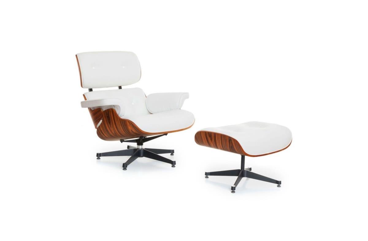 1x design fauteuil met bijhorende voetbank wit, afmeting fauteuil: circa 93x88x70cm, afmeting voetbank: circa 65x55x45, eigenschappent: echt leder, romp in rose wood, alu frame, sterpoot met verstelbare poten; goed om te weten: ongebruikt en in verpakking