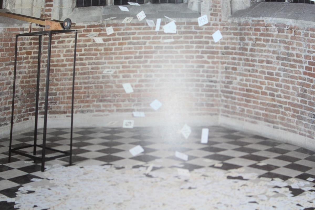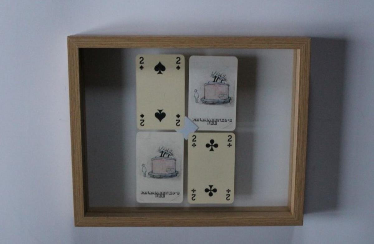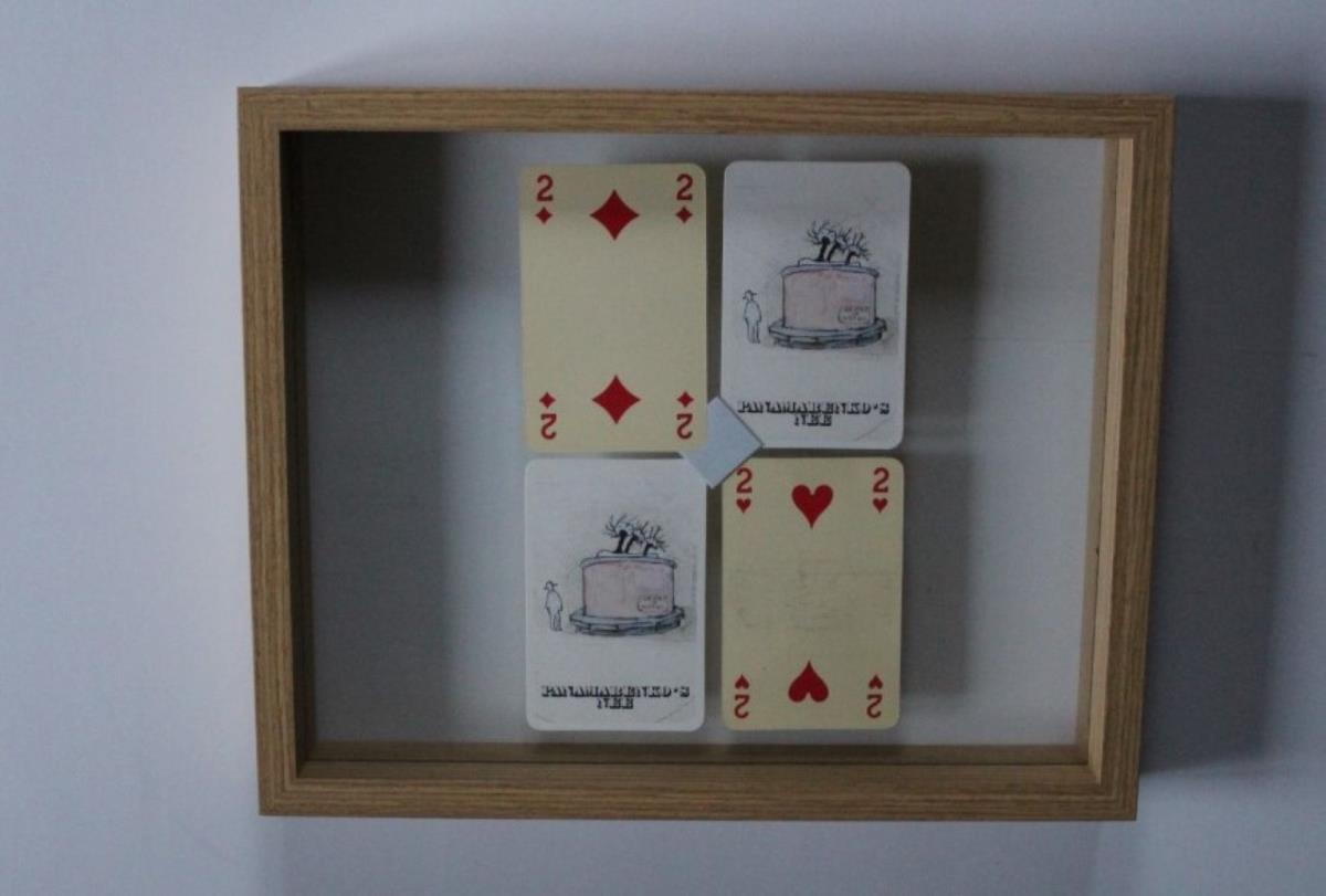 Speelkaarten uit object ‘kaart-verdeler’ - achterkant le siècle de Kafka - ongelijmde montage in zwevend kader 27x22 - laatste foto is sfeerbeeld van object kaartverdeler (niet behorende tot dit kavel)