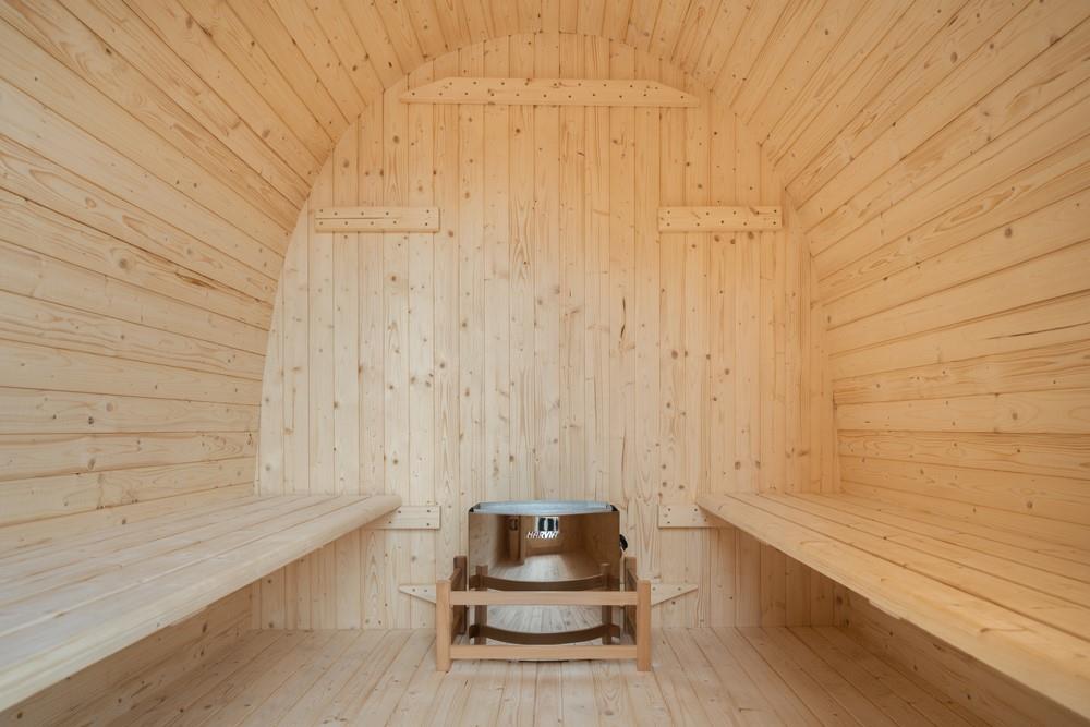 1x Pod sauna met getint glas, houtsoort: Finland Pine; geschikt voor 4-5 personen; inclusief: thermometer, hygrometer, glazen zandloper, hoofdsteun, glazen sauna deur, 6KW kachel 'Harvia', afmetingen: 2100x2100mm