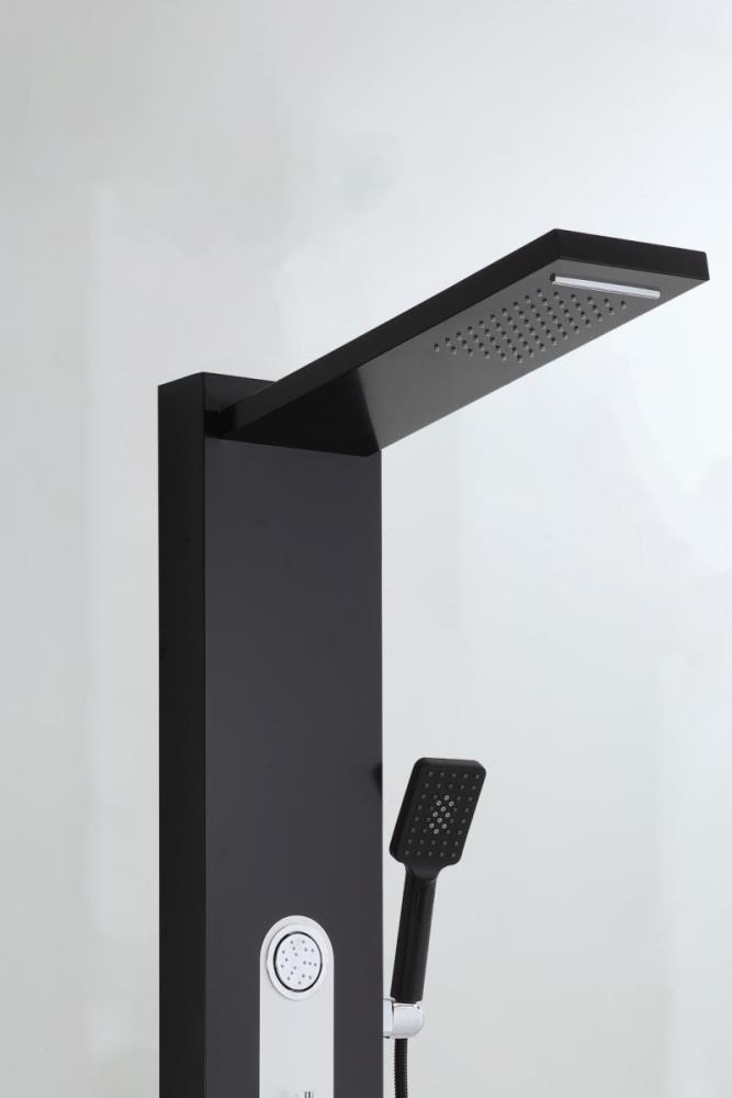 1x rvs douchepaneel, model: 5618 zwart matt, functies: 1xbodyjets, 1xhoofddouche, 1xhanddouche, 1x voetwaterval, 1x hoofdwaterval, mengkraan, flexibele slang 150cm, afm. 150x22cm (hxb), dit betreft een nieuw product in doos.