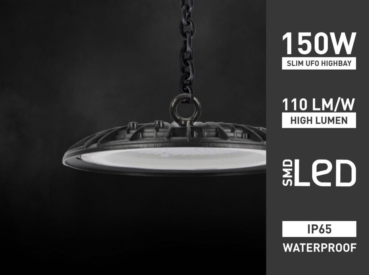 5 x 150 watt LED UFO Highbay SLIM Design Waterdicht 6000K - lichtstroom 16500 lumen SMD LED - lumen/watt 110 hoog lumen - lichtkleur daglicht 6000K - waterdicht IP65 - Lineaire IC driver inbegrepen - stralingshoek 90° - product kleur zand zwart - diam Ø 312 x 41mm - materiaal aluminum - bevestigingsset niet inclusief - levensduur 30.000 uren - voltage 200-240V - PF >0.9 - CRI >80 - SKU 00875 - het kan in watt en lumen 5% verschil tonen