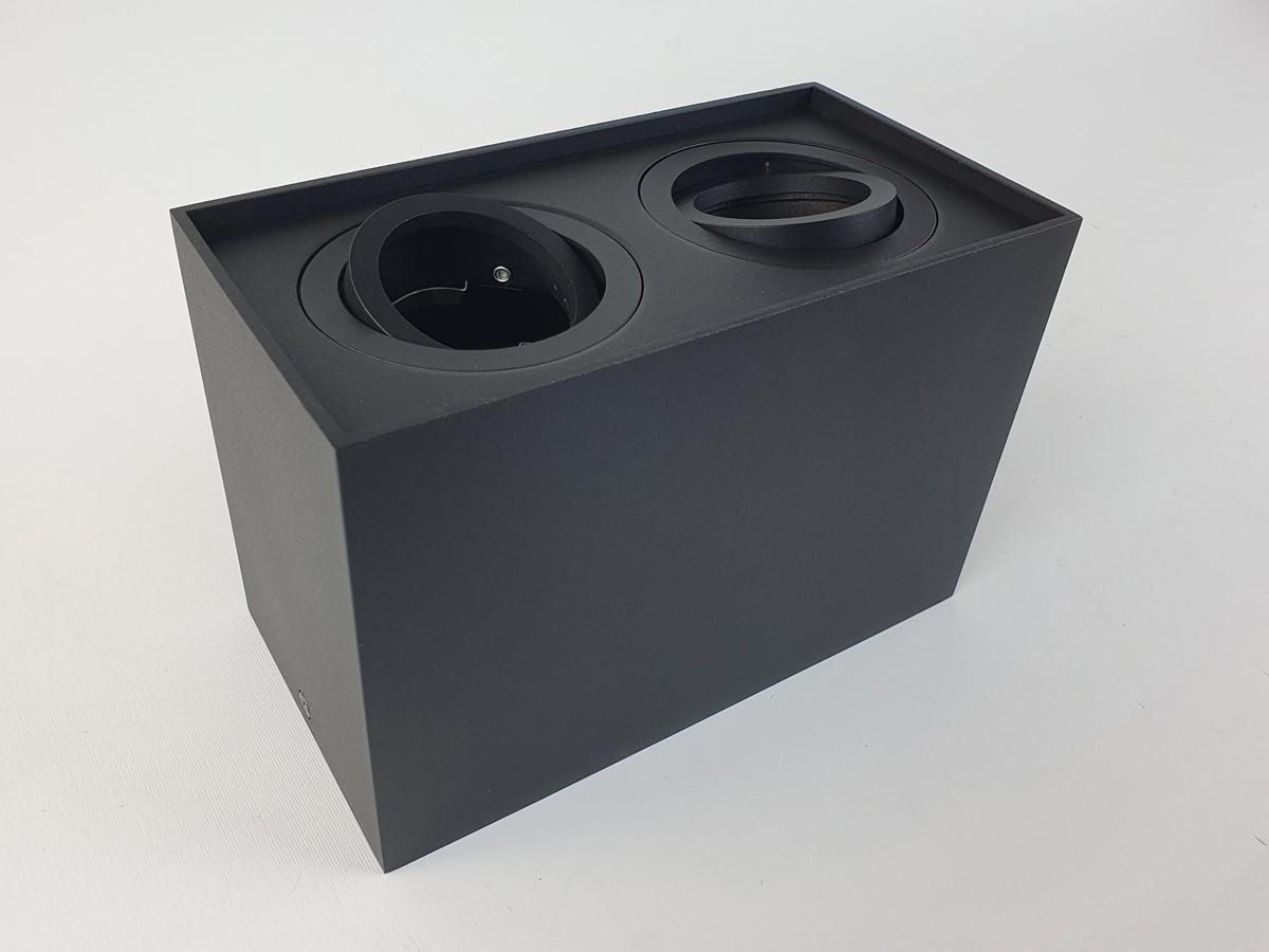20 x GU10 Opbouwspot Armatuur rechthoekig dual fittingen zand zwart kantelbaar - afdichting IP20 - product kleur zand zwart - afm. 180 x 96 x 125mm - bevestiging inclusief - materiaal aluminium - fitting GU10 - bulb niet inbegrepen - geschikt voor binnen - 2 x bulb invoer - voltage 220-240V - SKU 00345