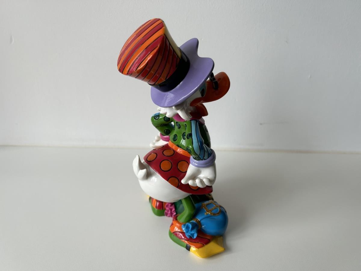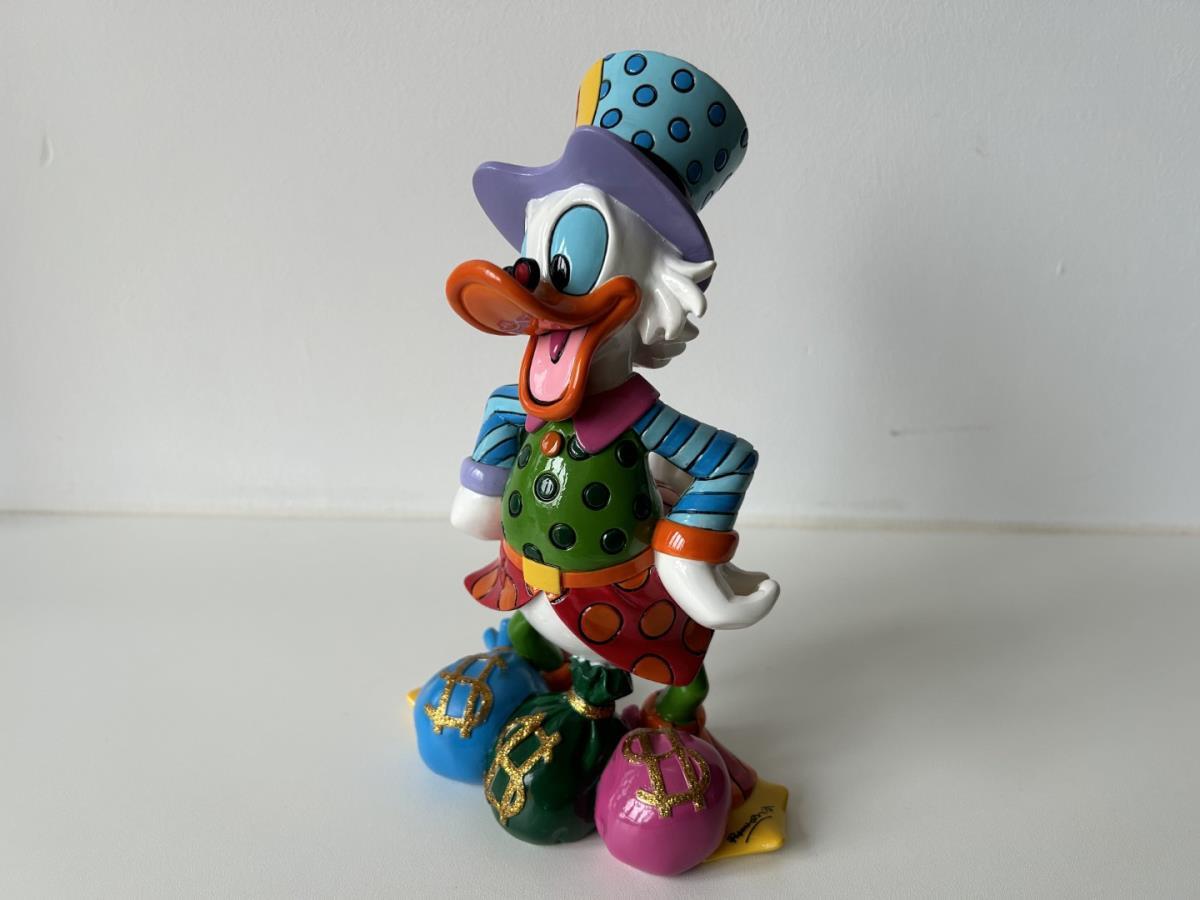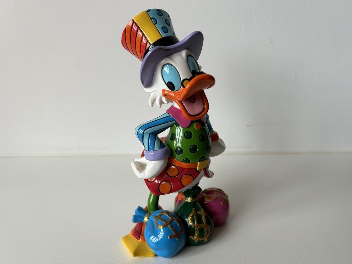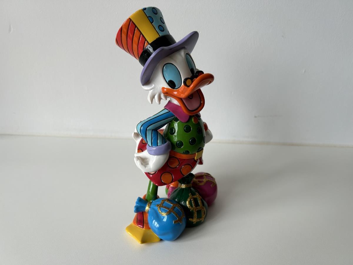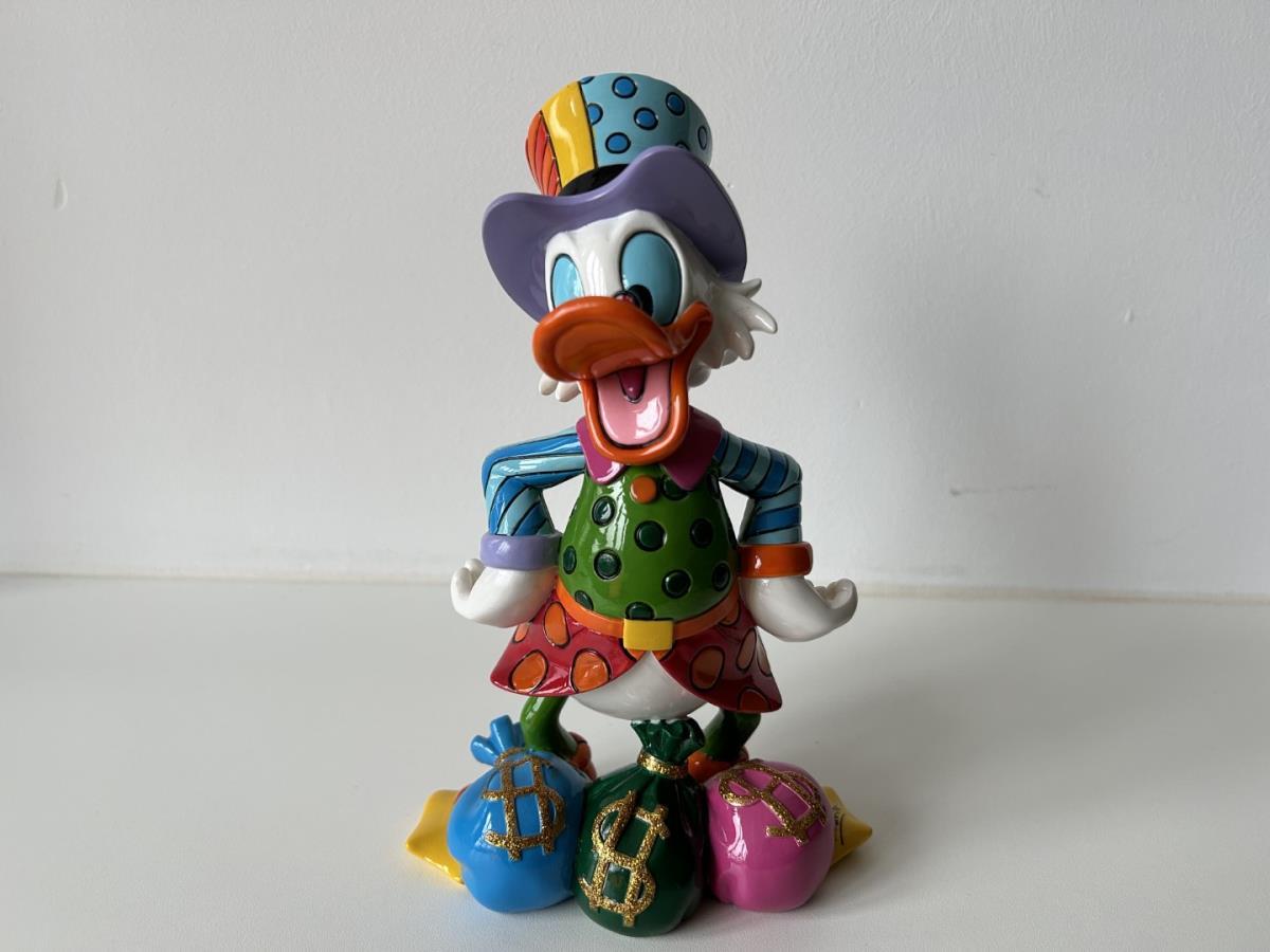 Origineel keramiek Disney-beeld en verzamelobject van Dagobert Duck uit de Walt Disney tekenfilm DuckTales, vervaardigd uit hoogwaardige polyresin steenhars door kunstenaar Romero Britto. Afmeting: 21.59cm X 12.70cm. Staat/conditie: Perfecte nieuwstaat, zonder originele verpakking en verpakkingsdoos. Uitgever: Enesco/Romero Britto. Reeks/collectie: Disney by Britto uit Popshop Gallery (shopbritto.com) - Showcase collection. Authenticiteitszegel onderaan het beeld (zie foto's) en handtekening in beeld gegraveerd (zie foto). Galerijprijs: 875 dollar (zie shopbritto.com). Beelden nemen in waarde toe, vermits ze gelimiteerd worden geproduceerd en momenteel niet meer worden vervaardigd. Braziliaans kunstenaar Romero Britto staat bekend om zijn vrolijke en bonte gebruik van kleuren en patronen. Hij combineert klassieke Disney-figuren met pop-art-designs, De beeldjes zijn stuk voor stuk herkenbare Disney-karakters, maar gezien door de ogen van Britto. Een lust voor het oog en een kleurrijke eyecatcher in je interieur. De beelden worden handbeschilderd, dus minimale afwijkingen in kleur en/of afwerking kunnen voorkomen.