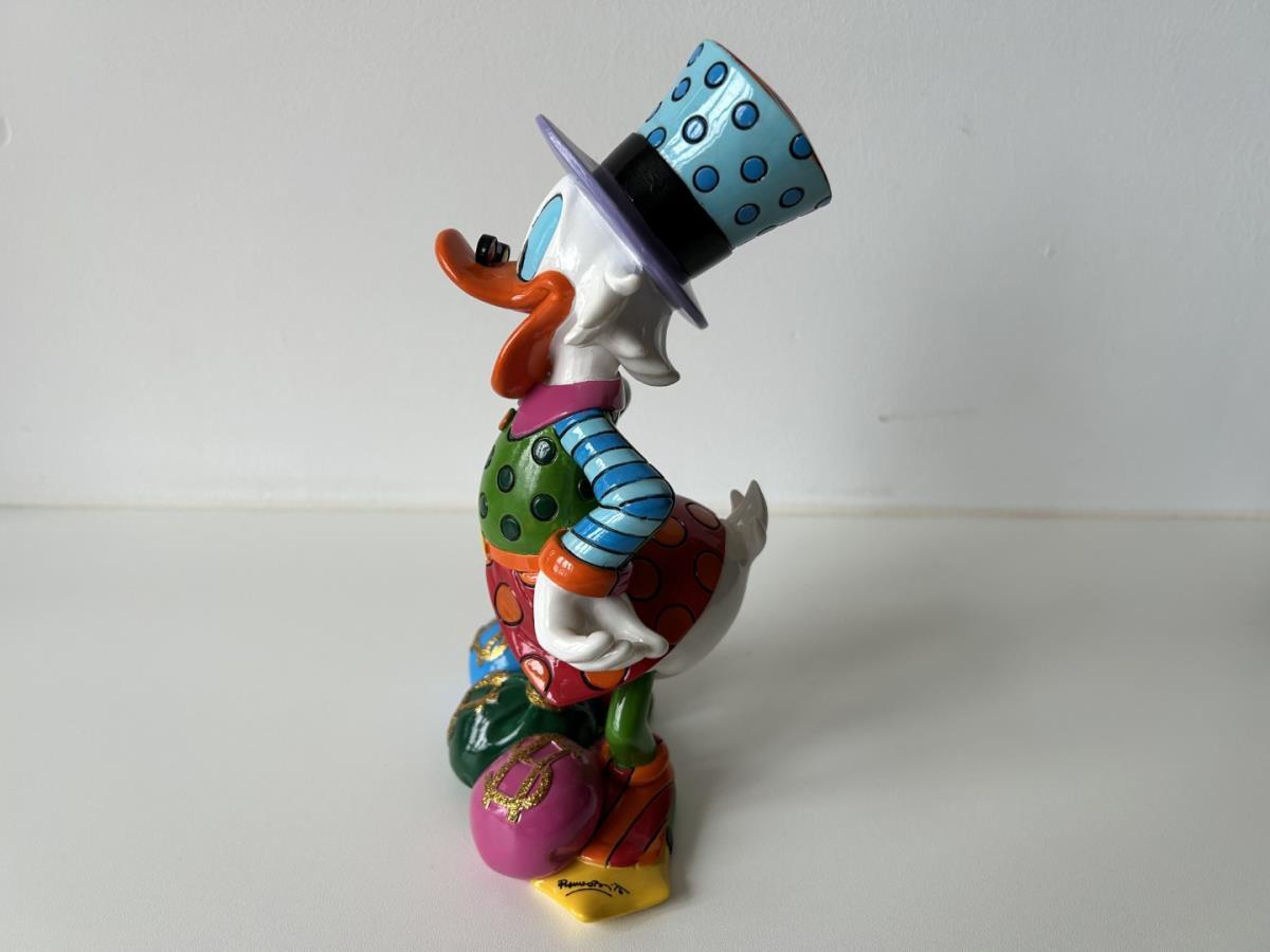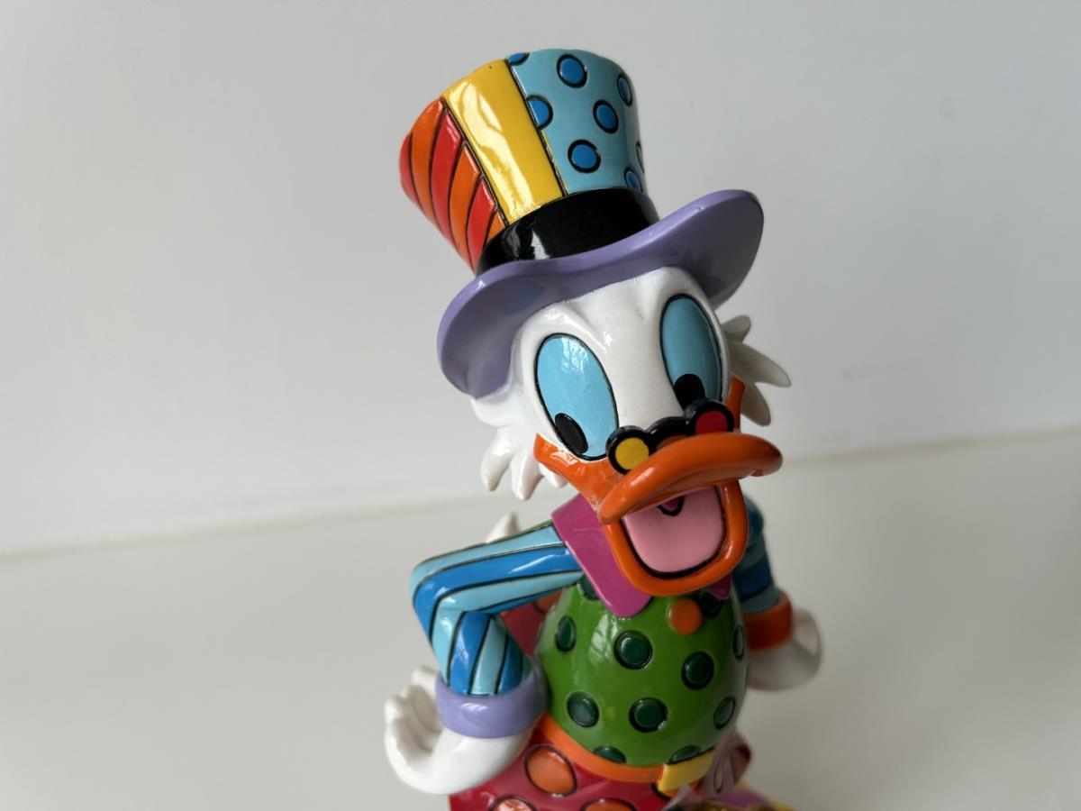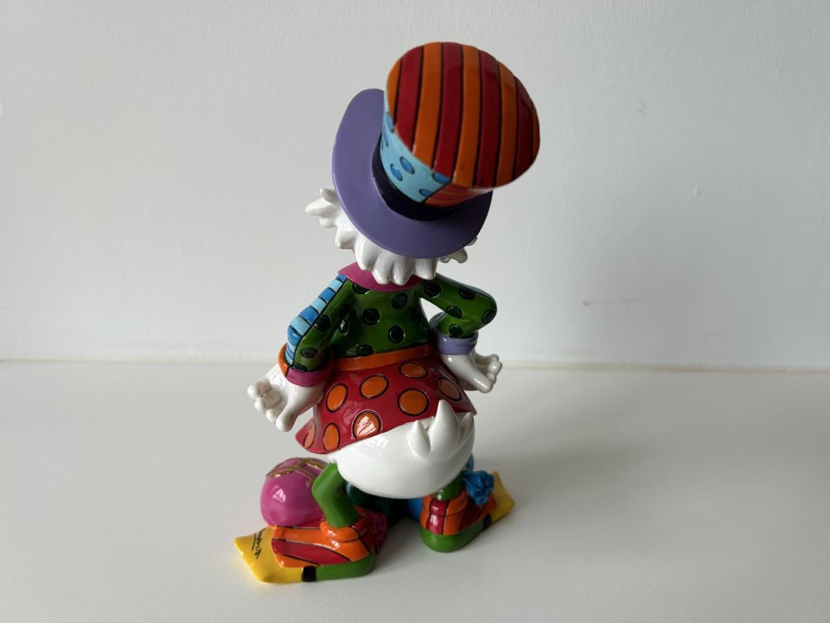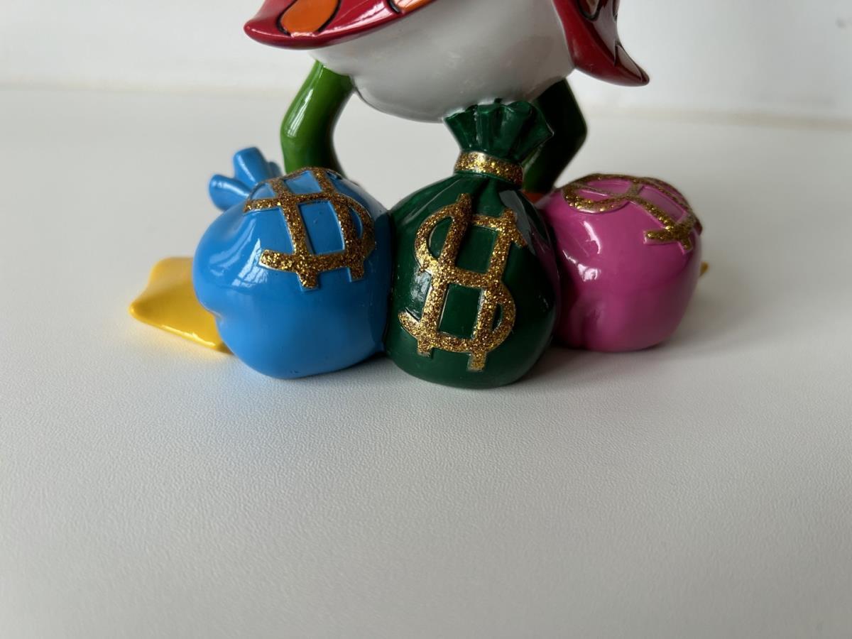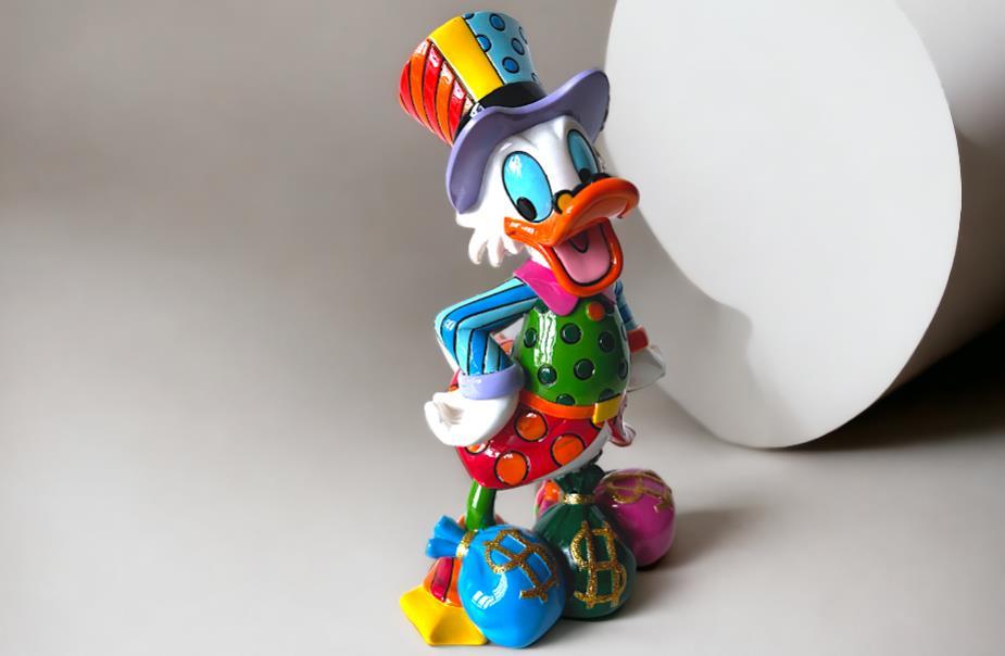 Origineel keramiek Disney-beeld en verzamelobject van Dagobert Duck uit de Walt Disney tekenfilm DuckTales, vervaardigd uit hoogwaardige polyresin steenhars door kunstenaar Romero Britto. Afmeting: 21.59cm X 12.70cm. Staat/conditie: Perfecte nieuwstaat, zonder originele verpakking en verpakkingsdoos. Uitgever: Enesco/Romero Britto. Reeks/collectie: Disney by Britto uit Popshop Gallery (shopbritto.com) - Showcase collection. Authenticiteitszegel onderaan het beeld (zie foto's) en handtekening in beeld gegraveerd (zie foto). Galerijprijs: 875 dollar (zie shopbritto.com). Beelden nemen in waarde toe, vermits ze gelimiteerd worden geproduceerd en momenteel niet meer worden vervaardigd. Braziliaans kunstenaar Romero Britto staat bekend om zijn vrolijke en bonte gebruik van kleuren en patronen. Hij combineert klassieke Disney-figuren met pop-art-designs, De beeldjes zijn stuk voor stuk herkenbare Disney-karakters, maar gezien door de ogen van Britto. Een lust voor het oog en een kleurrijke eyecatcher in je interieur. De beelden worden handbeschilderd, dus minimale afwijkingen in kleur en/of afwerking kunnen voorkomen.