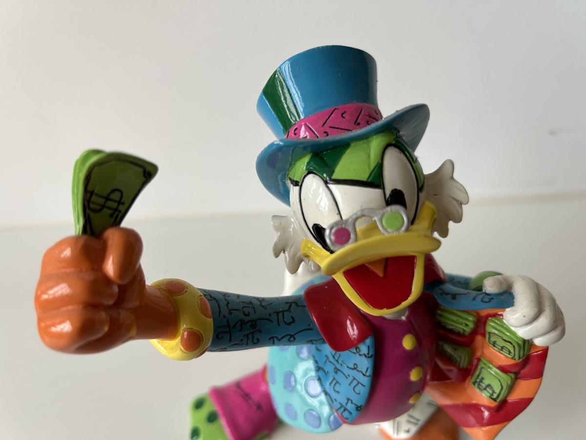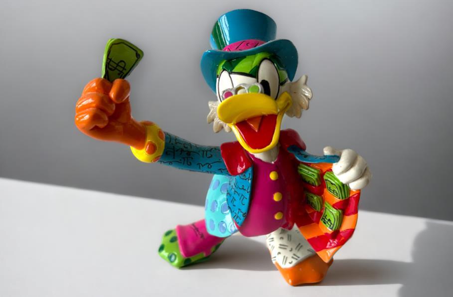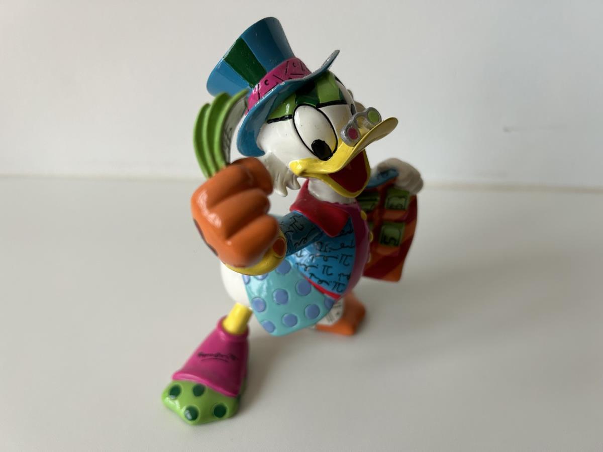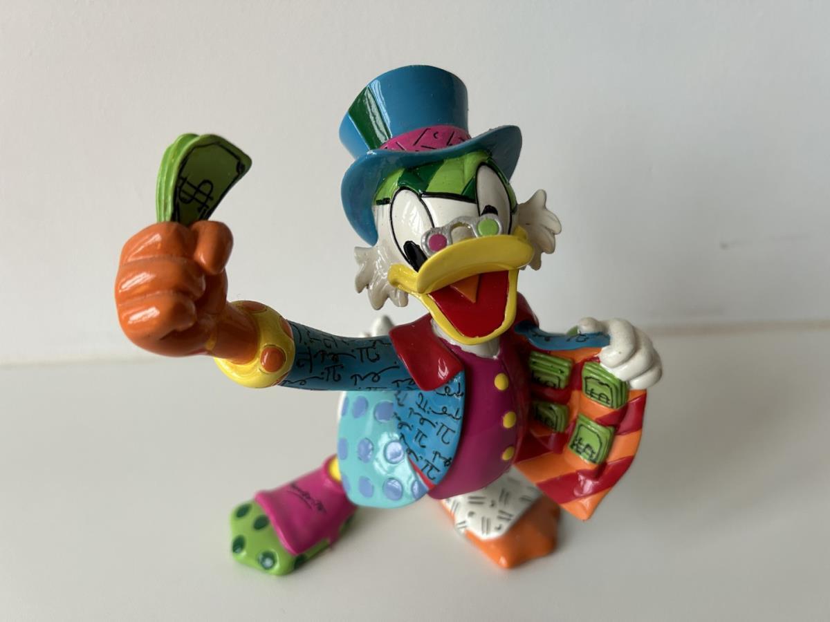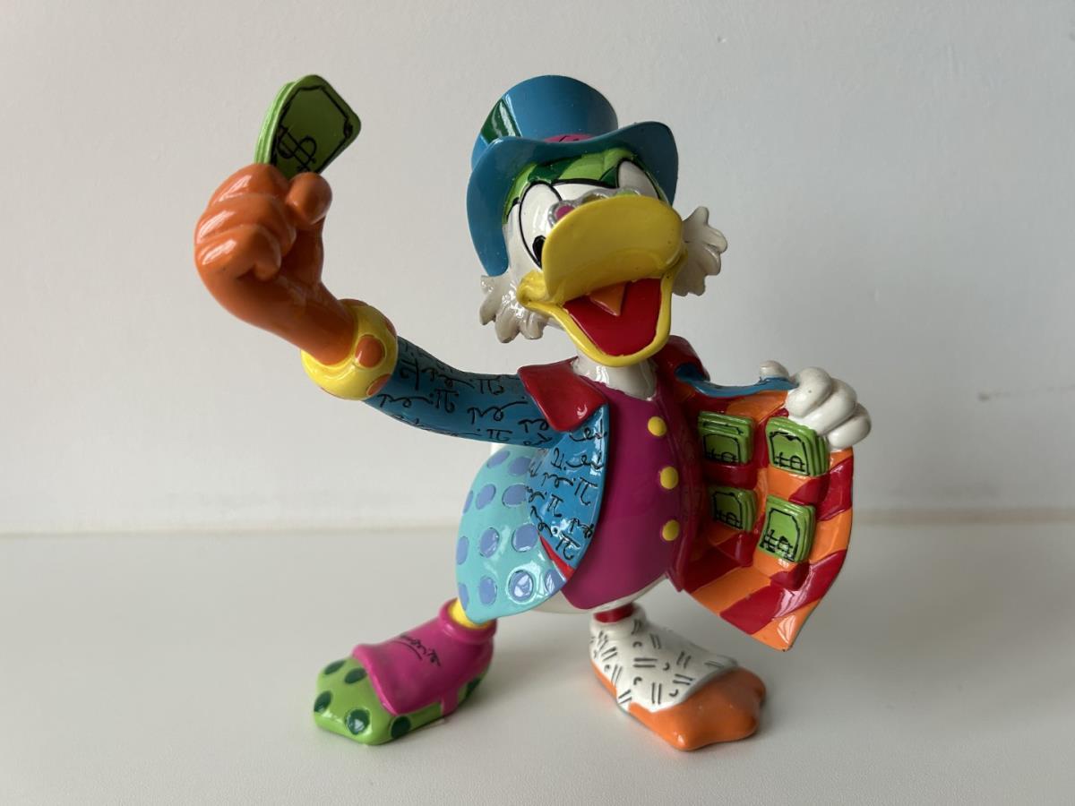 Origineel keramiek Disney-beeld en verzamelobject van Dagobert Duck uit de Walt Disney tekenfilm DuckTales, vervaardigd uit hoogwaardige polyresin steenhars door kunstenaar Romero Britto. Afmeting: +/- 15cm. Staat/conditie: Perfecte nieuwstaat, zonder originele verpakking en verpakkingsdoos. Uitgever: Enesco/Romero Britto. Reeks/collectie: Disney by Britto uit Popshop Gallery (shopbritto.com) - Showcase collection. Authenticiteitszegel onderaan het beeld (zie foto's) en handtekening in beeld gegraveerd (zie foto). Galerijprijs: 500 dollar (zie shopbritto.com). Beelden nemen in waarde toe, vermits ze gelimiteerd worden geproduceerd en momenteel niet meer worden vervaardigd. Braziliaans kunstenaar Romero Britto staat bekend om zijn vrolijke en bonte gebruik van kleuren en patronen. Hij combineert klassieke Disney-figuren met pop-art-designs, De beeldjes zijn stuk voor stuk herkenbare Disney-karakters, maar gezien door de ogen van Britto. Een lust voor het oog en een kleurrijke eyecatcher in je interieur. De beelden worden handbeschilderd, dus minimale afwijkingen in kleur en/of afwerking kunnen voorkomen.