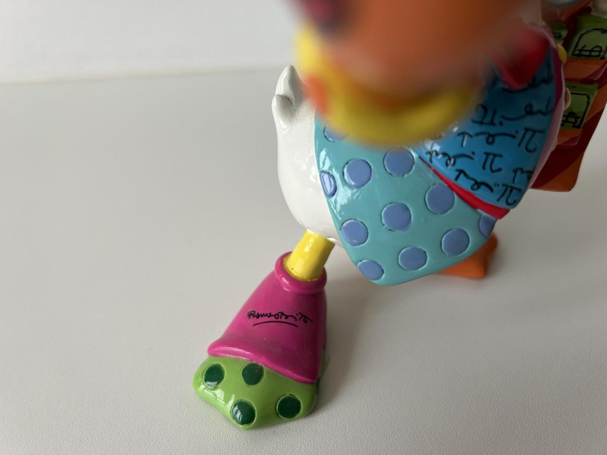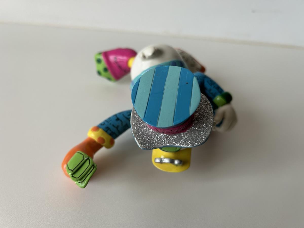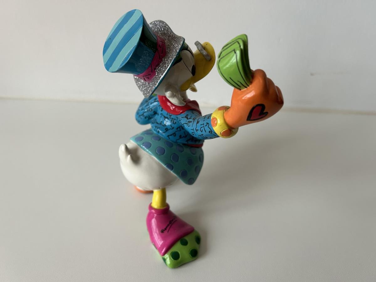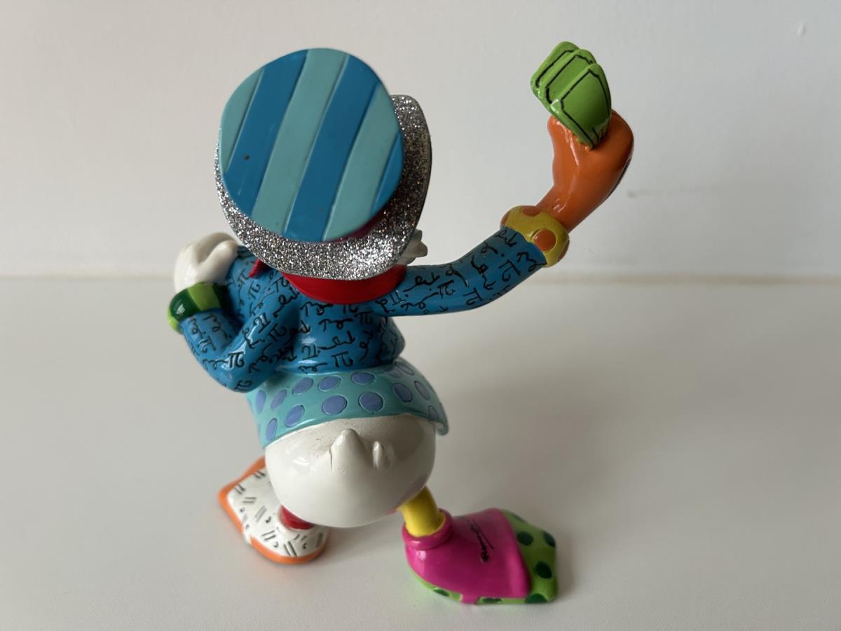 Origineel keramiek Disney-beeld en verzamelobject van Dagobert Duck uit de Walt Disney tekenfilm DuckTales, vervaardigd uit hoogwaardige polyresin steenhars door kunstenaar Romero Britto. Afmeting: +/- 15cm. Staat/conditie: Perfecte nieuwstaat, zonder originele verpakking en verpakkingsdoos. Uitgever: Enesco/Romero Britto. Reeks/collectie: Disney by Britto uit Popshop Gallery (shopbritto.com) - Showcase collection. Authenticiteitszegel onderaan het beeld (zie foto's) en handtekening in beeld gegraveerd (zie foto). Galerijprijs: 500 dollar (zie shopbritto.com). Beelden nemen in waarde toe, vermits ze gelimiteerd worden geproduceerd en momenteel niet meer worden vervaardigd. Braziliaans kunstenaar Romero Britto staat bekend om zijn vrolijke en bonte gebruik van kleuren en patronen. Hij combineert klassieke Disney-figuren met pop-art-designs, De beeldjes zijn stuk voor stuk herkenbare Disney-karakters, maar gezien door de ogen van Britto. Een lust voor het oog en een kleurrijke eyecatcher in je interieur. De beelden worden handbeschilderd, dus minimale afwijkingen in kleur en/of afwerking kunnen voorkomen.