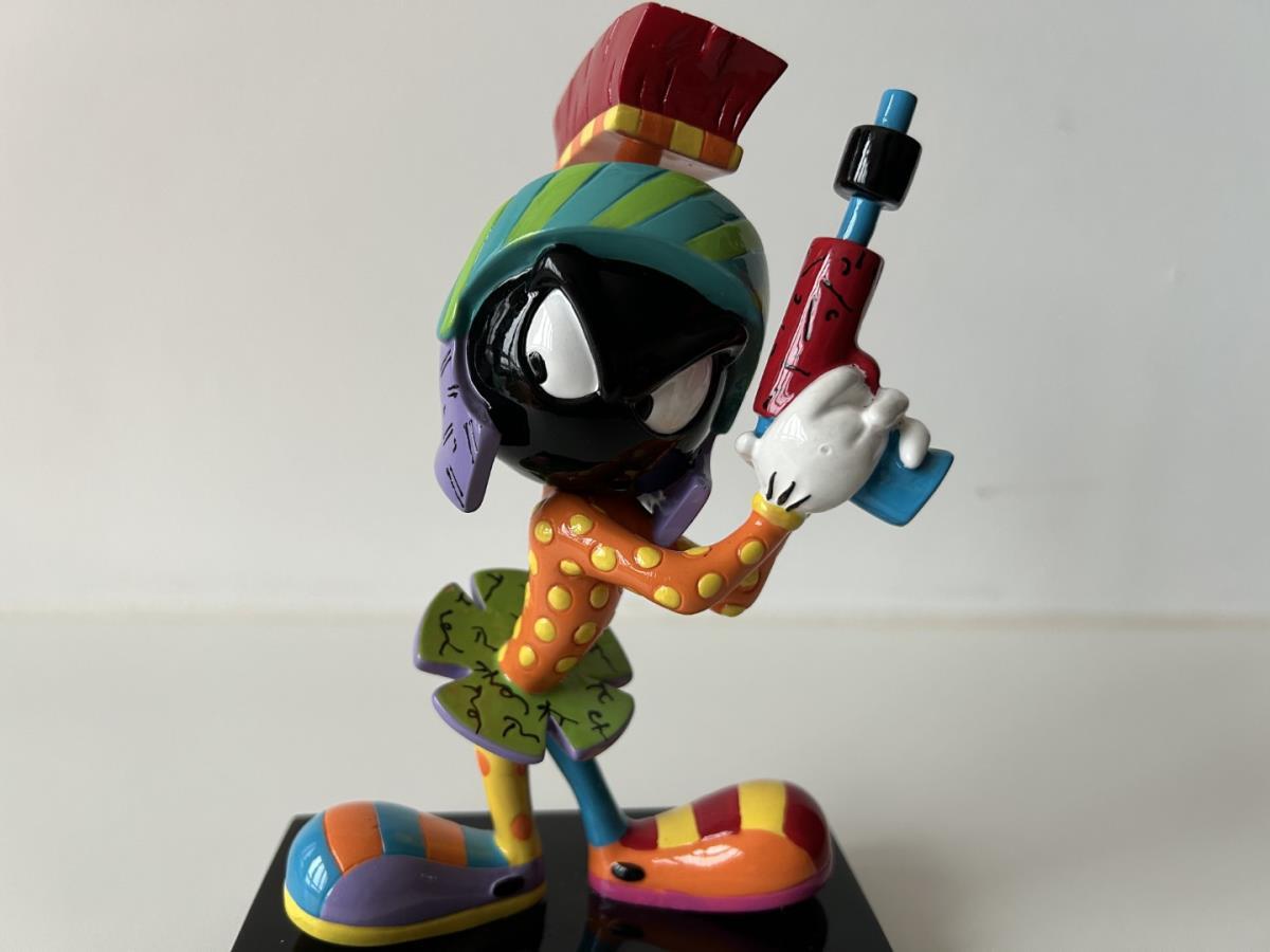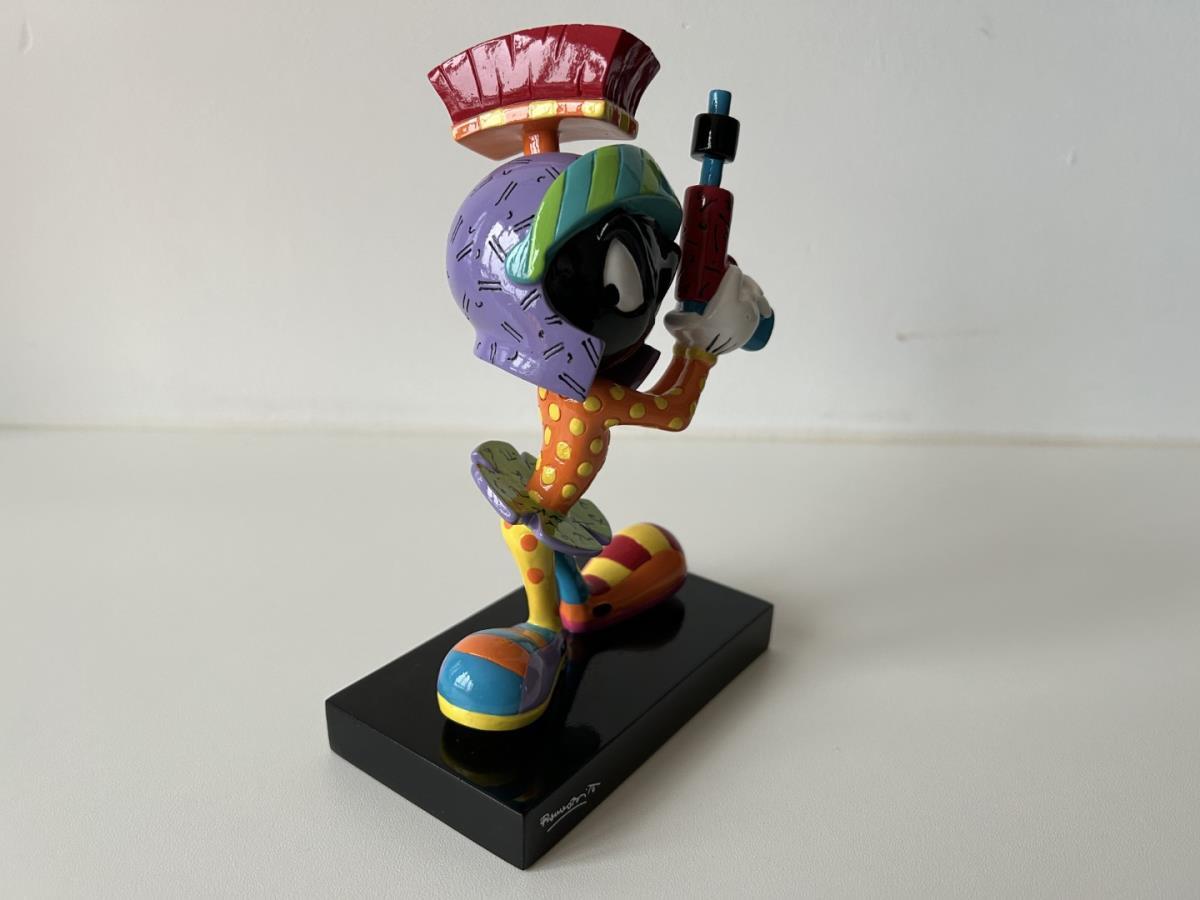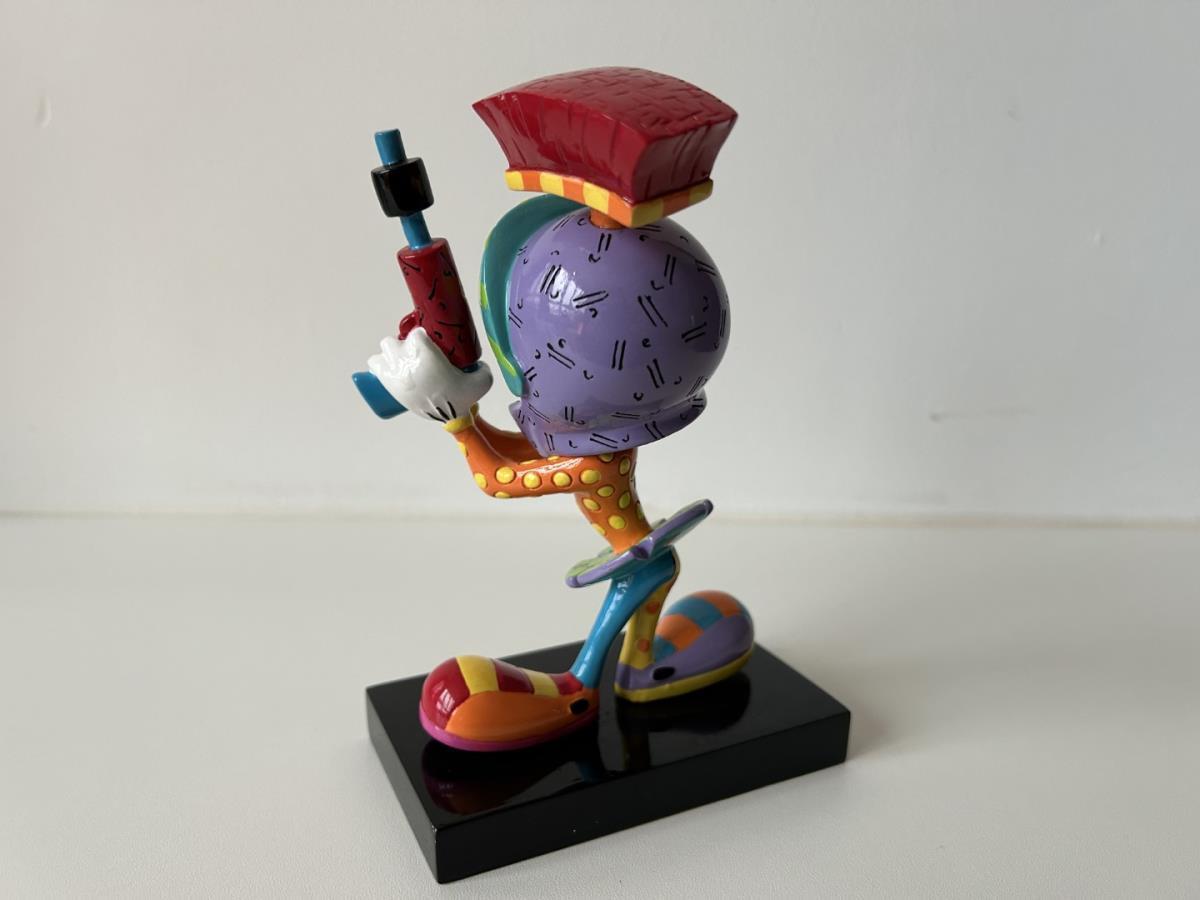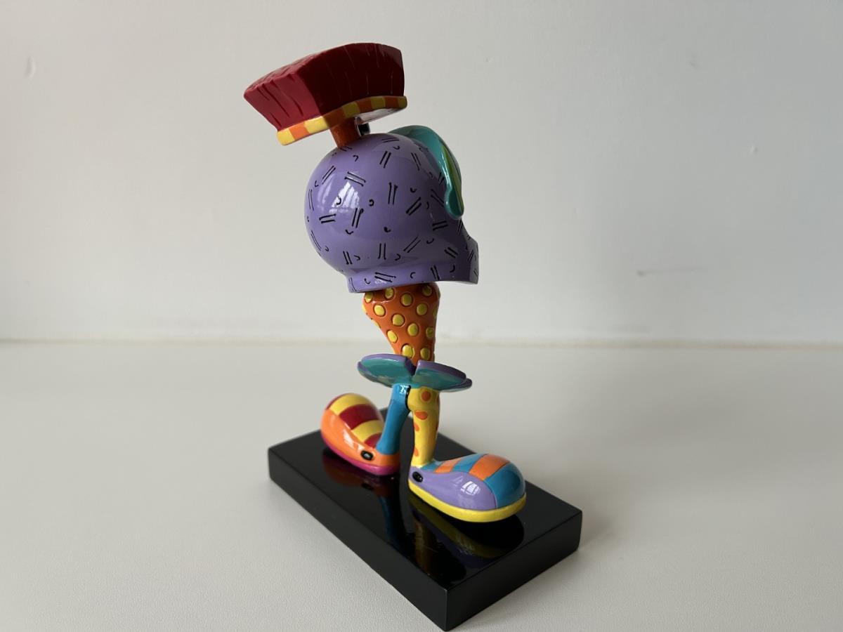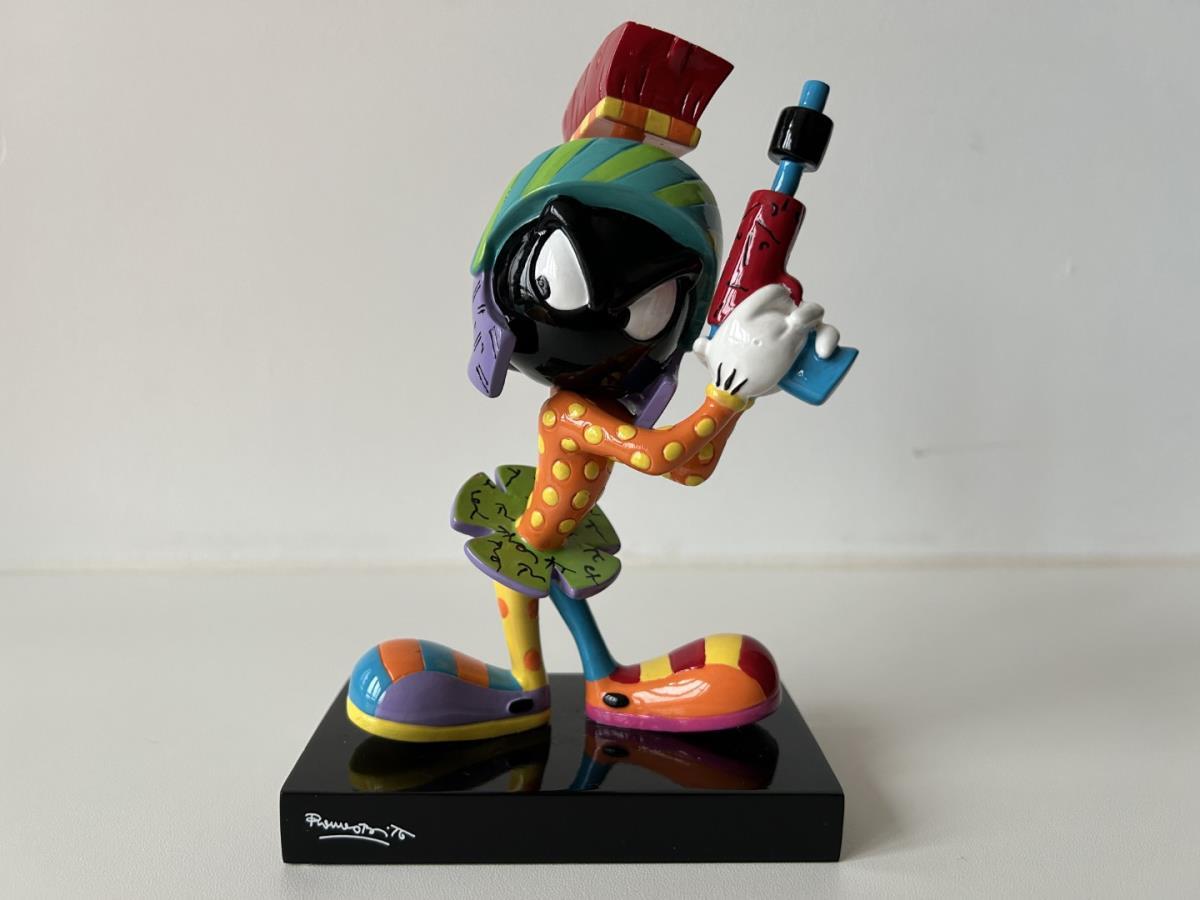 Origineel keramiek Disney-beeld en verzamelobject van Marvin the Martian uit Looney Tunes, vervaardigd uit hoogwaardige polyresin steenhars door kunstenaar Romero Britto. Afmeting: +/- 17cm. Staat/conditie: Perfecte nieuwstaat, zonder originele verpakking en verpakkingsdoos. Uitgever: Enesco/Romero Britto. Reeks/collectie: Disney by Britto uit Popshop Gallery (shopbritto.com) - Showcase collection. Authenticiteitszegel onderaan het beeld (zie foto's) en handtekening in beeld gegraveerd (zie foto). Galerijprijs: 350 dollar (zie shopbritto.com). Beelden nemen in waarde toe, vermits ze gelimiteerd worden geproduceerd en momenteel niet meer worden vervaardigd. Braziliaans kunstenaar Romero Britto staat bekend om zijn vrolijke en bonte gebruik van kleuren en patronen. Hij combineert klassieke Disney-figuren met pop-art-designs, De beeldjes zijn stuk voor stuk herkenbare Disney-karakters, maar gezien door de ogen van Britto. Een lust voor het oog en een kleurrijke eyecatcher in je interieur. De beelden worden handbeschilderd, dus minimale afwijkingen in kleur en/of afwerking kunnen voorkomen.