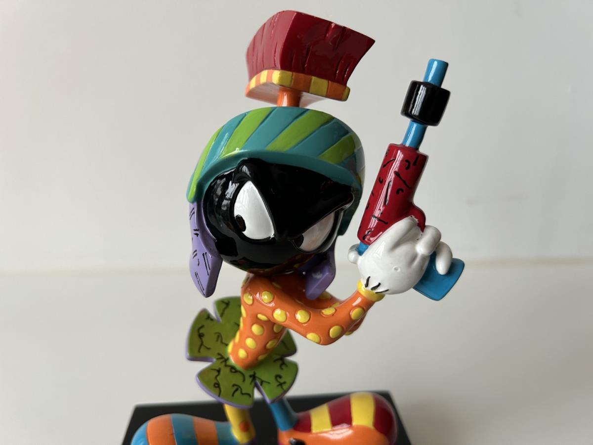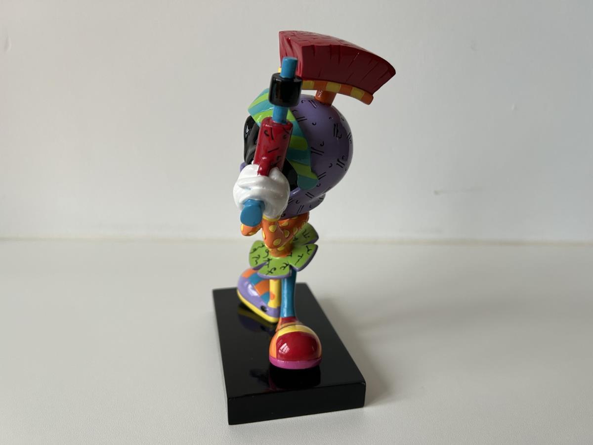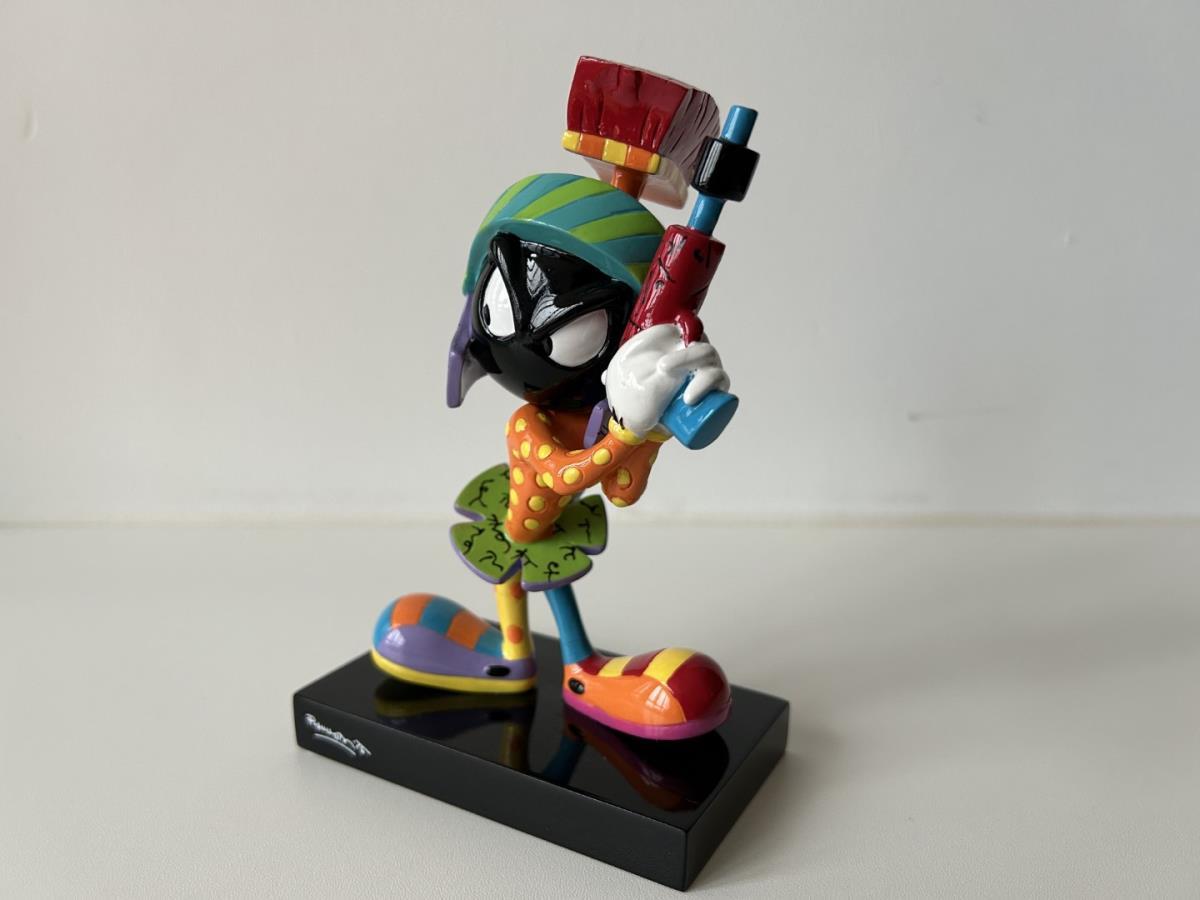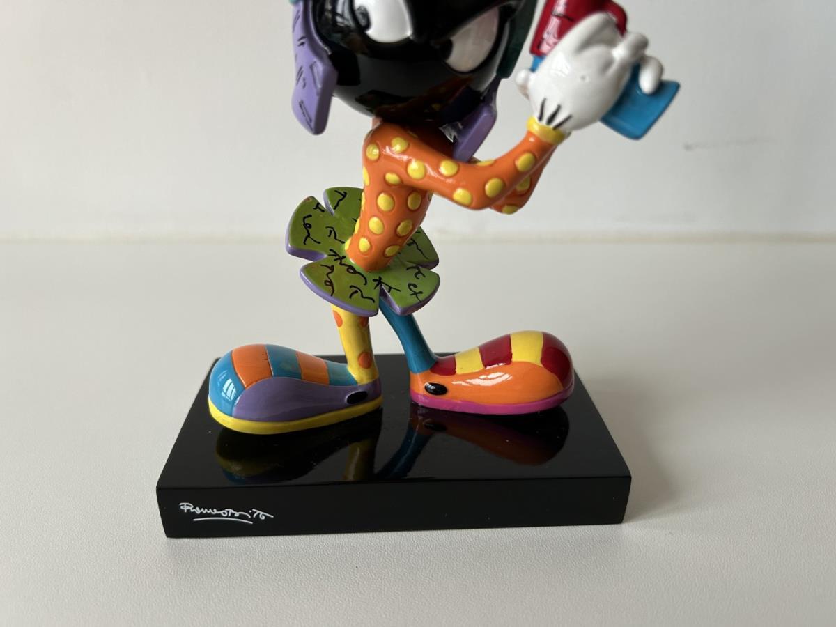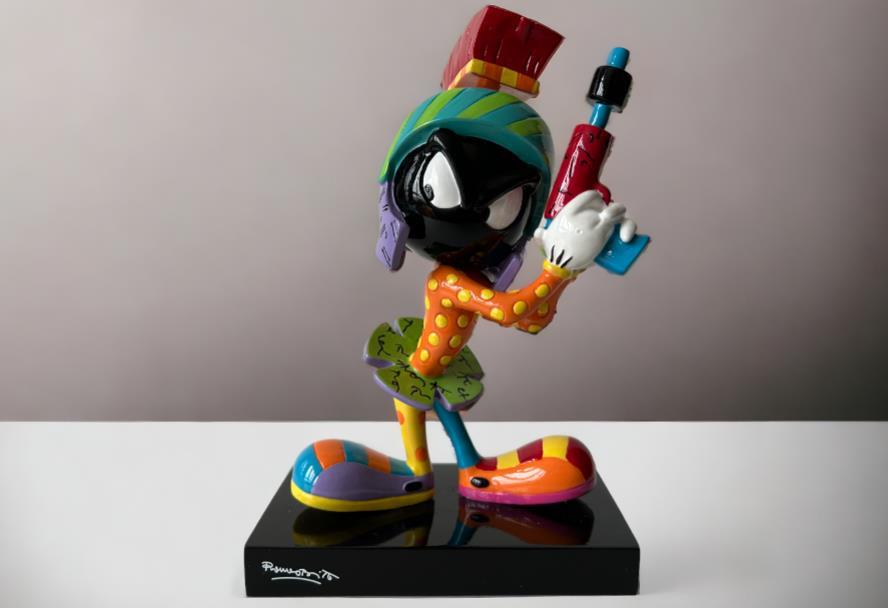 Origineel keramiek Disney-beeld en verzamelobject van Marvin the Martian uit Looney Tunes, vervaardigd uit hoogwaardige polyresin steenhars door kunstenaar Romero Britto. Afmeting: +/- 17cm. Staat/conditie: Perfecte nieuwstaat, zonder originele verpakking en verpakkingsdoos. Uitgever: Enesco/Romero Britto. Reeks/collectie: Disney by Britto uit Popshop Gallery (shopbritto.com) - Showcase collection. Authenticiteitszegel onderaan het beeld (zie foto's) en handtekening in beeld gegraveerd (zie foto). Galerijprijs: 350 dollar (zie shopbritto.com). Beelden nemen in waarde toe, vermits ze gelimiteerd worden geproduceerd en momenteel niet meer worden vervaardigd. Braziliaans kunstenaar Romero Britto staat bekend om zijn vrolijke en bonte gebruik van kleuren en patronen. Hij combineert klassieke Disney-figuren met pop-art-designs, De beeldjes zijn stuk voor stuk herkenbare Disney-karakters, maar gezien door de ogen van Britto. Een lust voor het oog en een kleurrijke eyecatcher in je interieur. De beelden worden handbeschilderd, dus minimale afwijkingen in kleur en/of afwerking kunnen voorkomen.