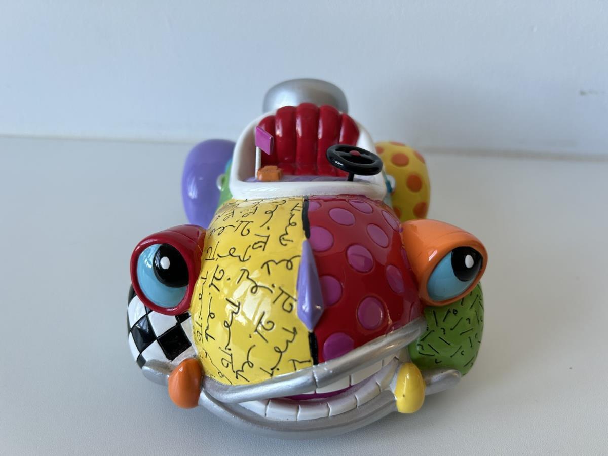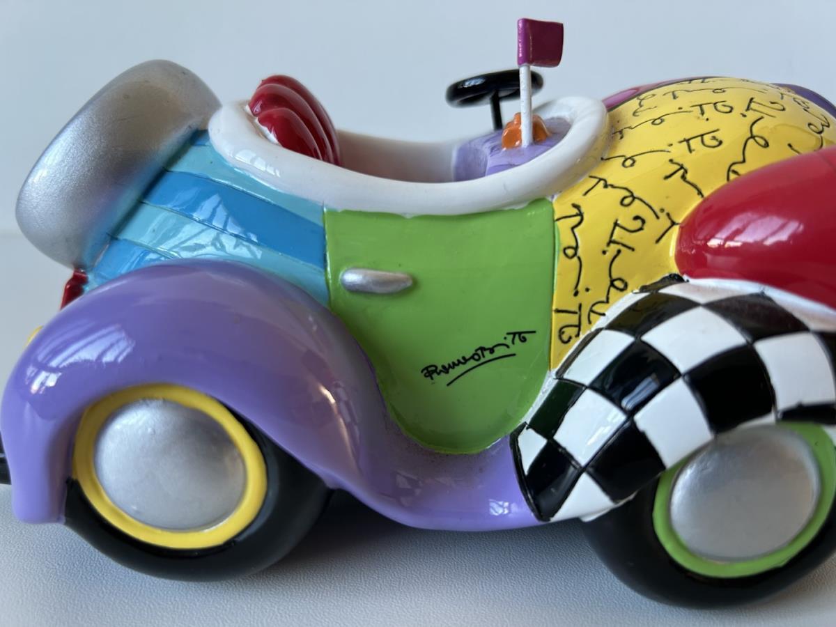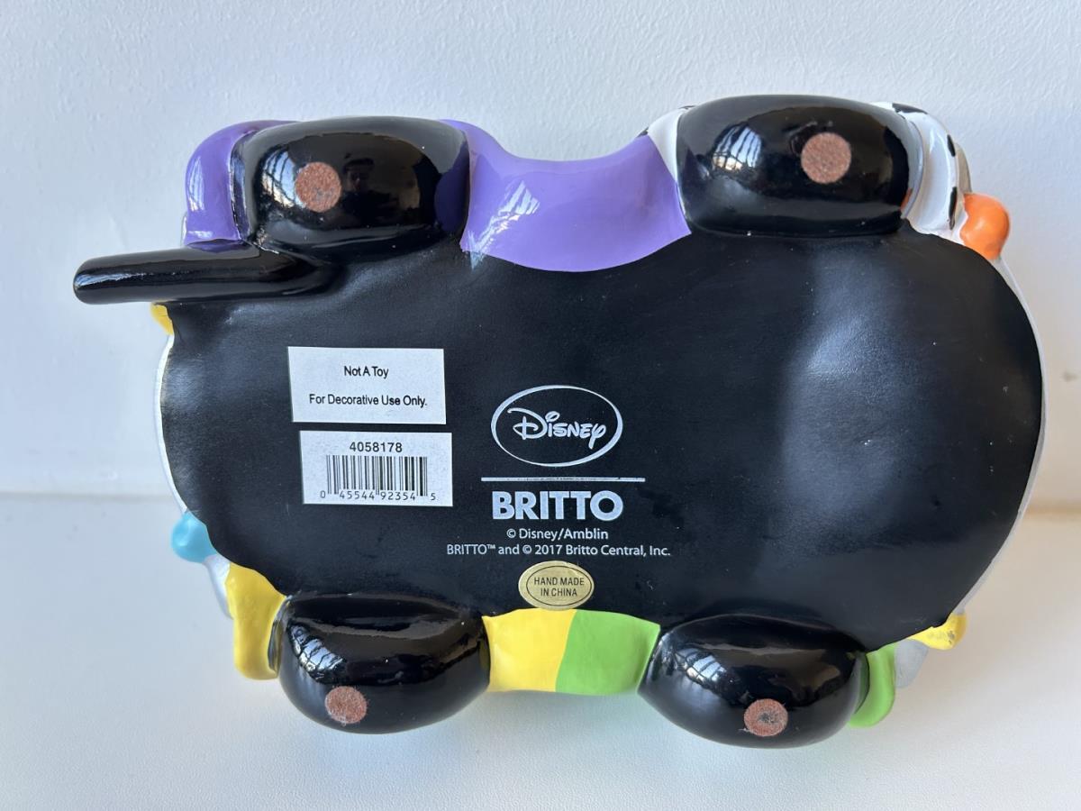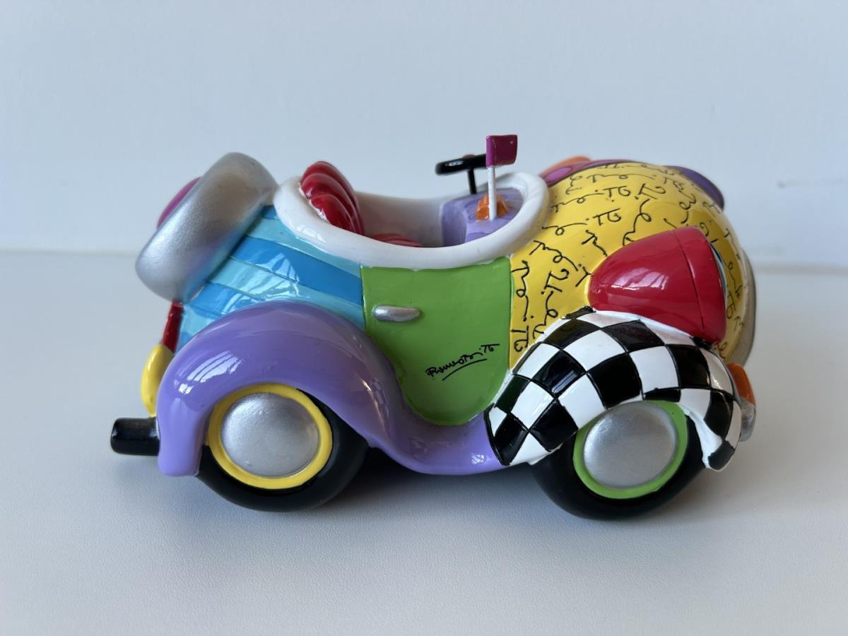 Origineel keramiek Disney-beeld en verzamelobject van Benny the Cab uit Roger Rabit, vervaardigd uit hoogwaardige polyresin steenhars door kunstenaar Romero Britto. Afmeting: 18cm x 13cm x 6cm. Staat/conditie: Perfecte nieuwstaat, zonder originele verpakking en verpakkingsdoos. Uitgever: Enesco/Romero Britto. Reeks/collectie: Disney by Britto uit Popshop Gallery (shopbritto.com) - Showcase collection. Authenticiteitszegel onderaan het beeld (zie foto's) en handtekening in beeld gegraveerd (zie foto). Galerijprijs: 850 dollar (zie shopbritto.com) . Beelden nemen in waarde toe, vermits ze gelimiteerd worden geproduceerd en momenteel niet meer worden vervaardigd. Braziliaans kunstenaar Romero Britto staat bekend om zijn vrolijke en bonte gebruik van kleuren en patronen. Hij combineert klassieke Disney-figuren met pop-art-designs, De beeldjes zijn stuk voor stuk herkenbare Disney-karakters, maar gezien door de ogen van Britto. Een lust voor het oog en een kleurrijke eyecatcher in je interieur. De beelden worden handbeschilderd, dus minimale afwijkingen in kleur en/of afwerking kunnen voorkomen.