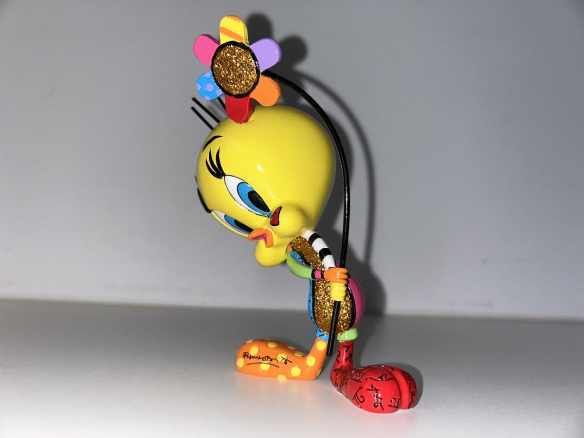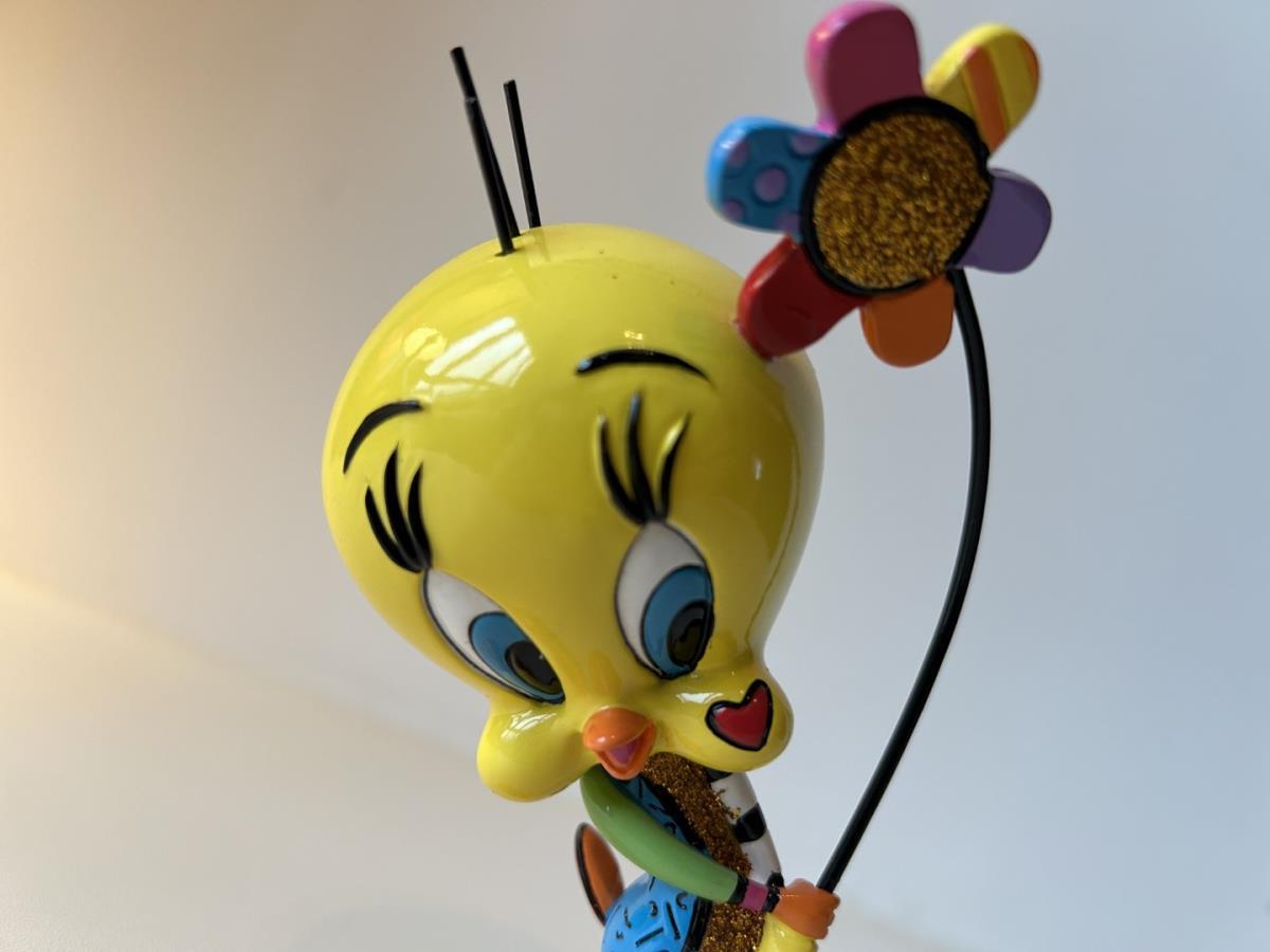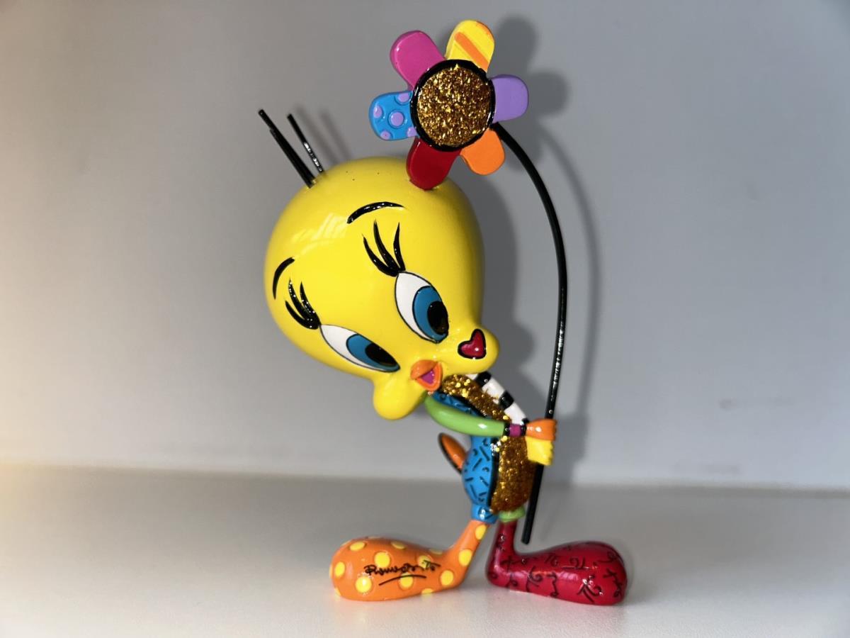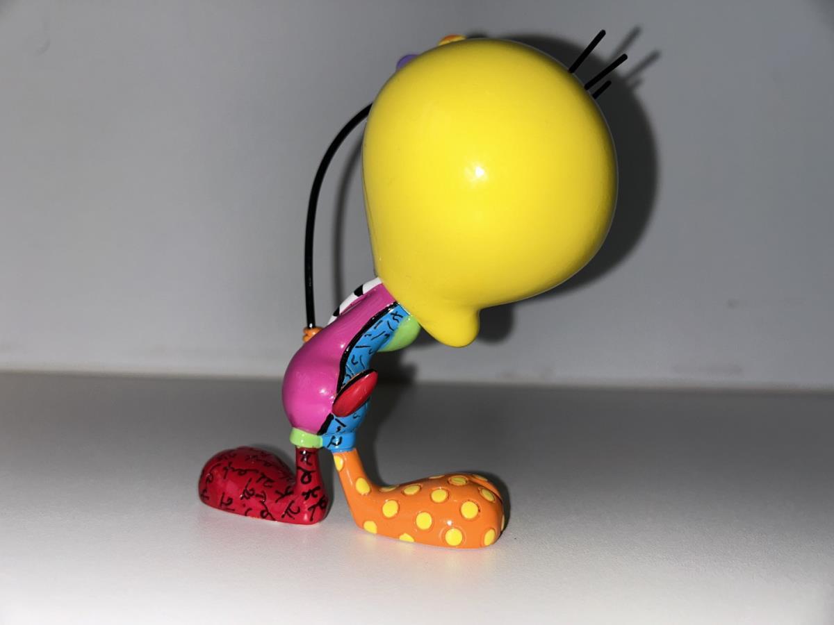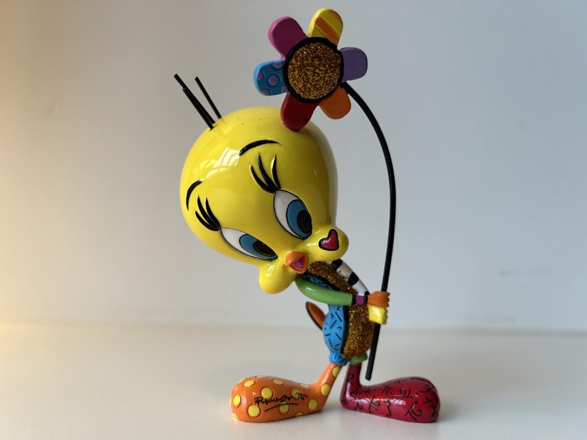 Origineel keramiek Disney-beeld en verzamelobject van Tweety uit de Looney Tunes, vervaardigd uit hoogwaardige polyresin steenhars door kunstenaar Romero Britto. Afmeting: +/- 15cm. Staat/conditie: Perfecte nieuwstaat, zonder originele verpakking en verpakkingsdoos. Uitgever: Enesco/Romero Britto. Reeks/collectie: Disney by Britto uit Popshop Gallery (shopbritto.com) - Showcase collection. Authenticiteitszegel onderaan het beeld (zie foto's) en handtekening in beeld gegraveerd (zie foto). Galerijprijs: 150 dollar (zie shopbritto.com). Beelden nemen in waarde toe, vermits ze gelimiteerd worden geproduceerd en momenteel niet meer worden vervaardigd. Braziliaans kunstenaar Romero Britto staat bekend om zijn vrolijke en bonte gebruik van kleuren en patronen. Hij combineert klassieke Disney-figuren met pop-art-designs, De beeldjes zijn stuk voor stuk herkenbare Disney-karakters, maar gezien door de ogen van Britto. Een lust voor het oog en een kleurrijke eyecatcher in je interieur. De beelden worden handbeschilderd, dus minimale afwijkingen in kleur en/of afwerking kunnen voorkomen.