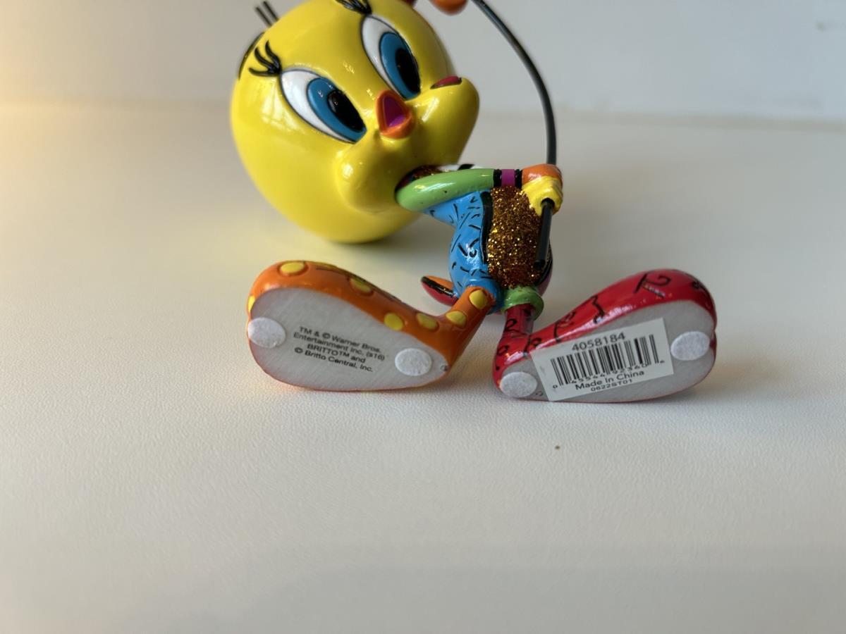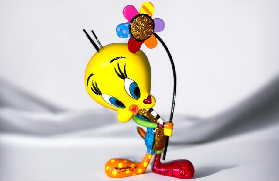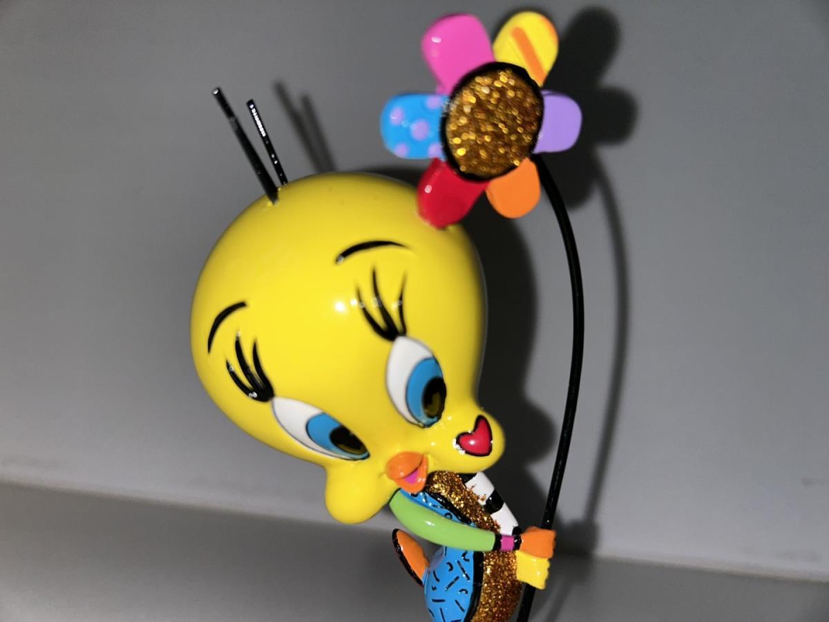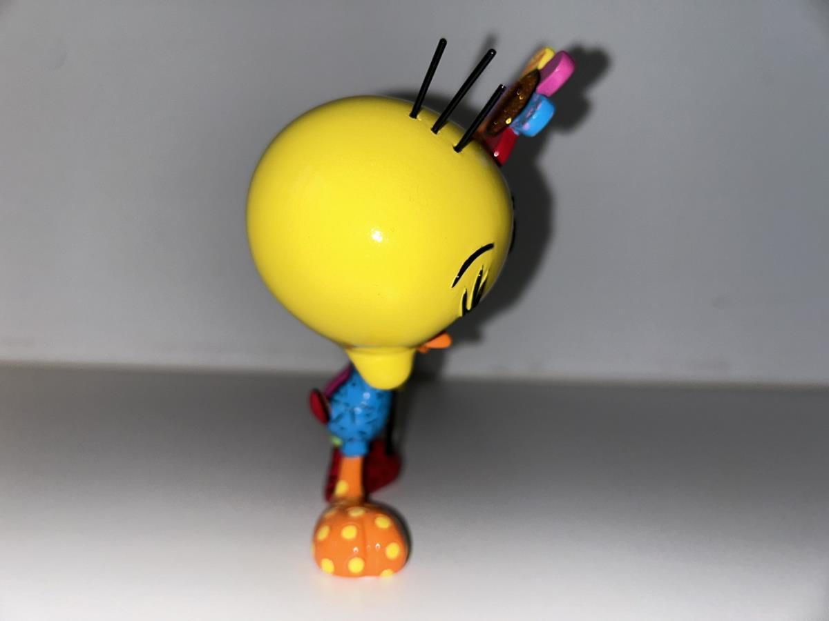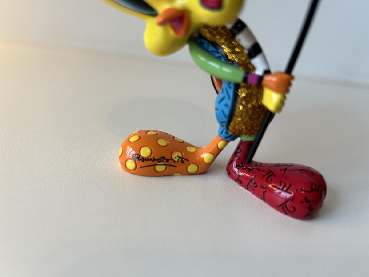 Origineel keramiek Disney-beeld en verzamelobject van Tweety uit de Looney Tunes, vervaardigd uit hoogwaardige polyresin steenhars door kunstenaar Romero Britto. Afmeting: +/- 15cm. Staat/conditie: Perfecte nieuwstaat, zonder originele verpakking en verpakkingsdoos. Uitgever: Enesco/Romero Britto. Reeks/collectie: Disney by Britto uit Popshop Gallery (shopbritto.com) - Showcase collection. Authenticiteitszegel onderaan het beeld (zie foto's) en handtekening in beeld gegraveerd (zie foto). Galerijprijs: 150 dollar (zie shopbritto.com). Beelden nemen in waarde toe, vermits ze gelimiteerd worden geproduceerd en momenteel niet meer worden vervaardigd. Braziliaans kunstenaar Romero Britto staat bekend om zijn vrolijke en bonte gebruik van kleuren en patronen. Hij combineert klassieke Disney-figuren met pop-art-designs, De beeldjes zijn stuk voor stuk herkenbare Disney-karakters, maar gezien door de ogen van Britto. Een lust voor het oog en een kleurrijke eyecatcher in je interieur. De beelden worden handbeschilderd, dus minimale afwijkingen in kleur en/of afwerking kunnen voorkomen.