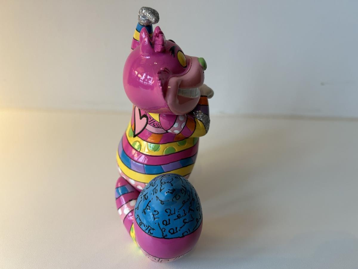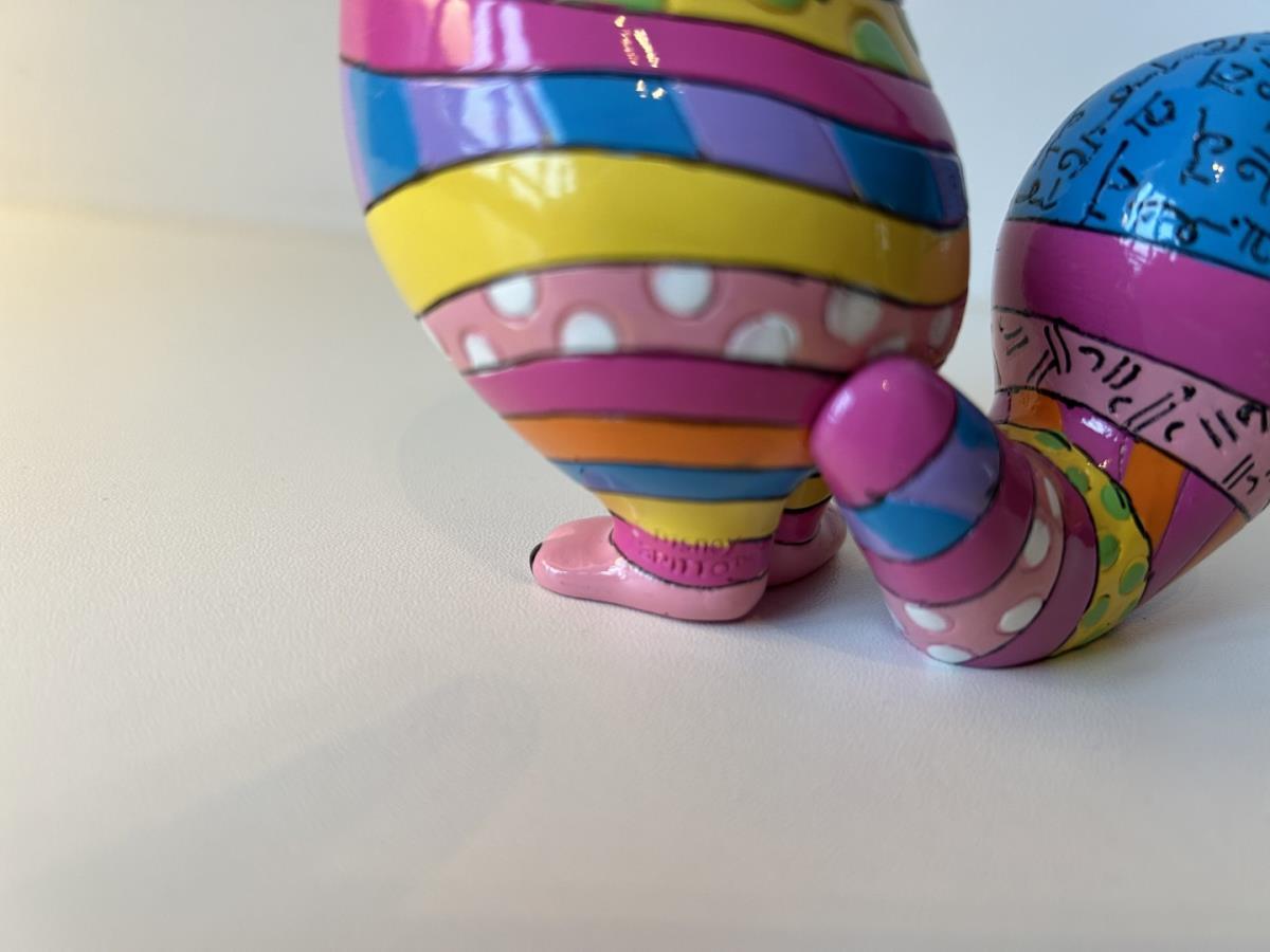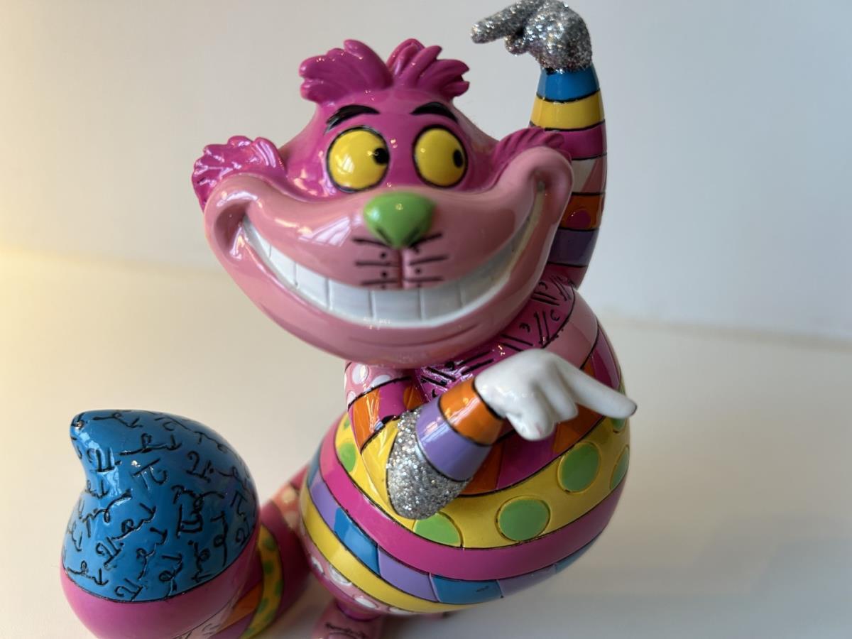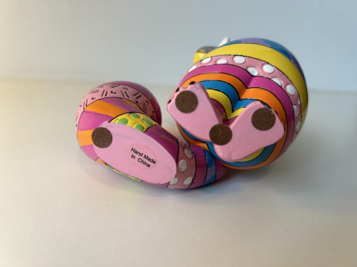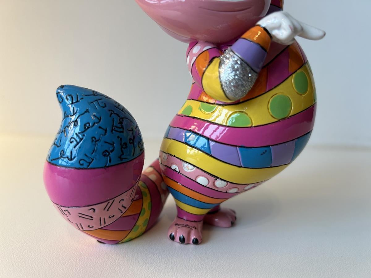 Origineel keramiek Disney-beeld en verzamelobject van de kat (Cheshire Cat) uit Alice in Wonderland, vervaardigd uit hoogwaardige polyresin steenhars door kunstenaar Romero Britto. Afmeting: 12.7cm X 7.62cm. Staat/conditie: Perfecte nieuwstaat, zonder originele verpakking en verpakkingsdoos. Uitgever: Enesco/Romero Britto. Reeks/collectie: Disney by Britto uit Popshop Gallery (shopbritto.com) - Showcase collection. Authenticiteitszegel onderaan het beeld (zie foto's) en handtekening in beeld gegraveerd (zie foto). Galerijprijs: 700 dollar (zie shopbritto.com). Beelden nemen in waarde toe, vermits ze gelimiteerd worden geproduceerd en momenteel niet meer worden vervaardigd. Braziliaans kunstenaar Romero Britto staat bekend om zijn vrolijke en bonte gebruik van kleuren en patronen. Hij combineert klassieke Disney-figuren met pop-art-designs, De beeldjes zijn stuk voor stuk herkenbare Disney-karakters, maar gezien door de ogen van Britto. Een lust voor het oog en een kleurrijke eyecatcher in je interieur. De beelden worden handbeschilderd, dus minimale afwijkingen in kleur en/of afwerking kunnen voorkomen.