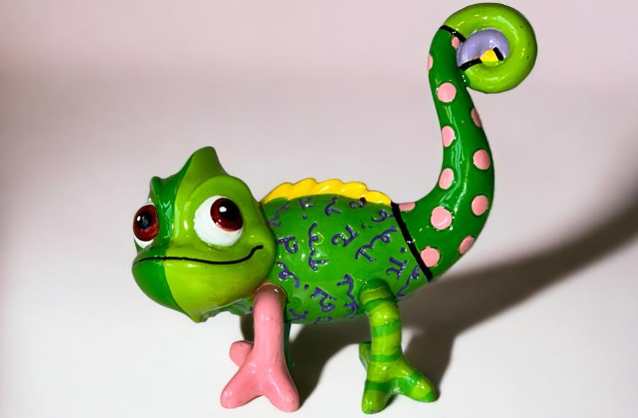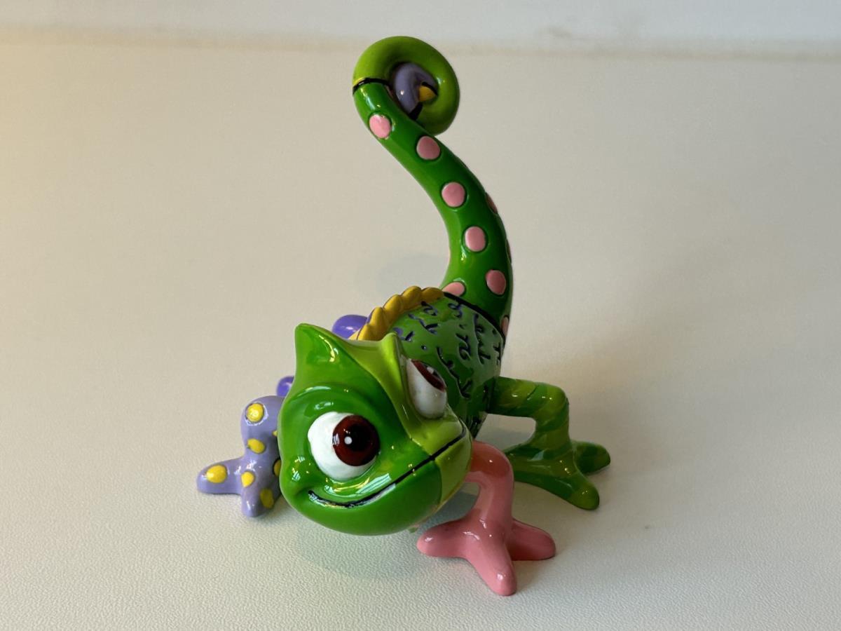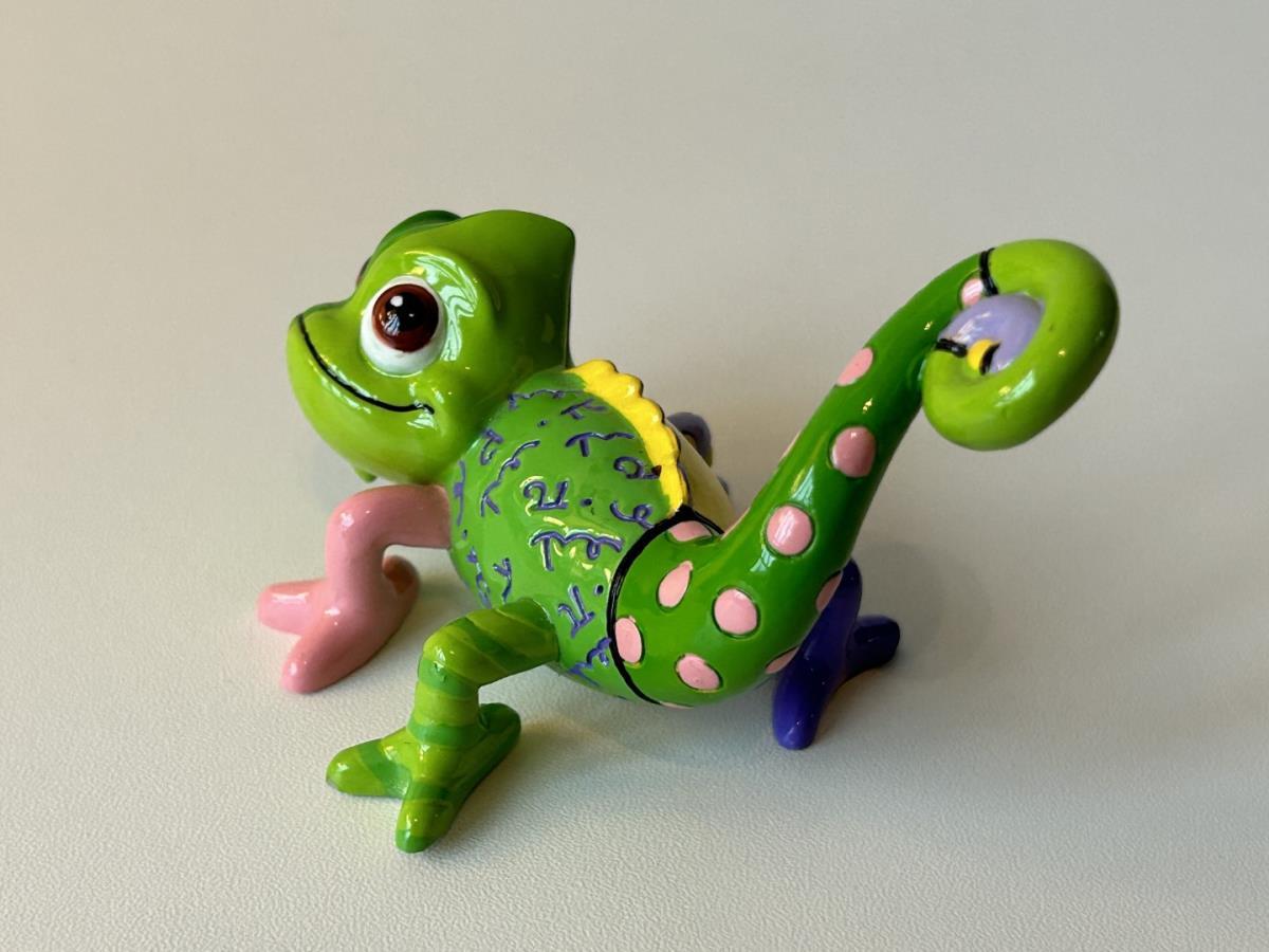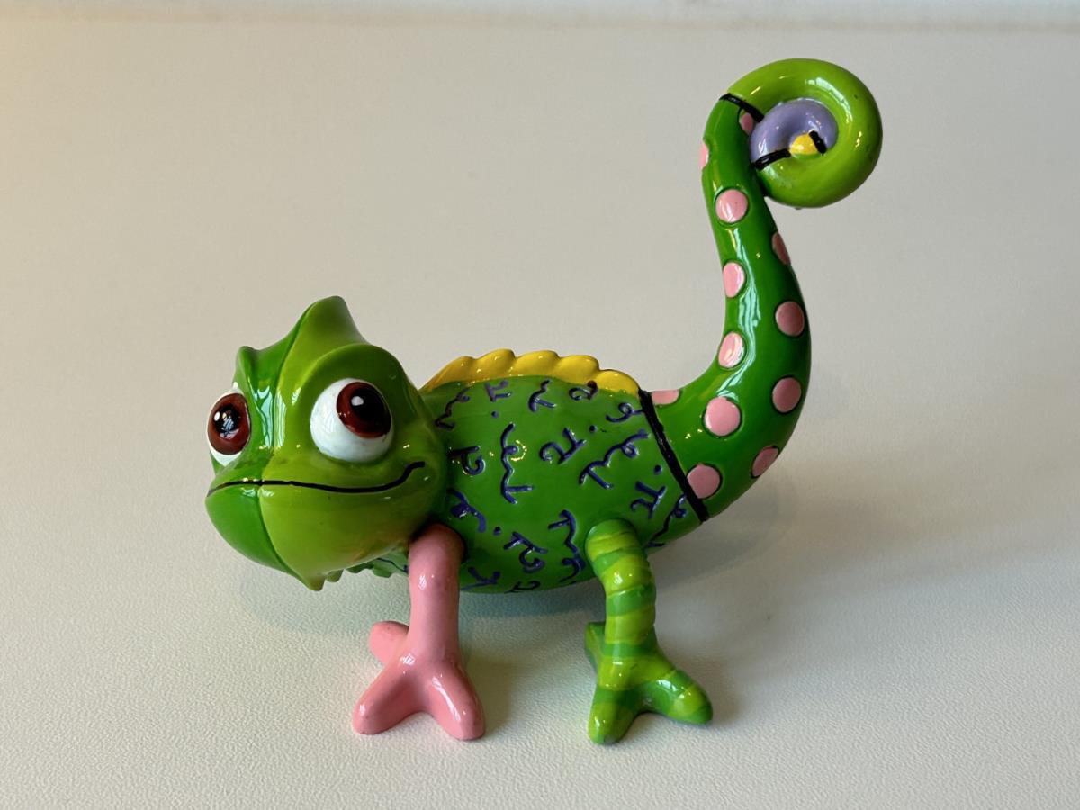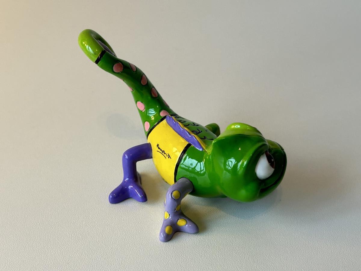 Origineel keramiek Disney-beeld en verzamelobject van de Chameleon uit Rapunzel, vervaardigd uit hoogwaardige polyresin steenhars door kunstenaar Romero Britto. Afmeting: H: 5.99cm X W: 6.5cm X D: 9.5cm. Staat/conditie: Perfecte nieuwstaat, zonder originele verpakking en verpakkingsdoos. Uitgever: Enesco/Romero Britto. Reeks/collectie: Disney by Britto uit Popshop Gallery (shopbritto.com) - Showcase collection. Authenticiteitszegel onderaan het beeld (zie foto's) en handtekening in beeld gegraveerd (zie foto). Galerijprijs: 100 dollar (zie shopbritto.com). Beelden nemen in waarde toe, vermits ze gelimiteerd worden geproduceerd en momenteel niet meer worden vervaardigd. Braziliaans kunstenaar Romero Britto staat bekend om zijn vrolijke en bonte gebruik van kleuren en patronen. Hij combineert klassieke Disney-figuren met pop-art-designs, De beeldjes zijn stuk voor stuk herkenbare Disney-karakters, maar gezien door de ogen van Britto. Een lust voor het oog en een kleurrijke eyecatcher in je interieur. De beelden worden handbeschilderd, dus minimale afwijkingen in kleur en/of afwerking kunnen voorkomen.
