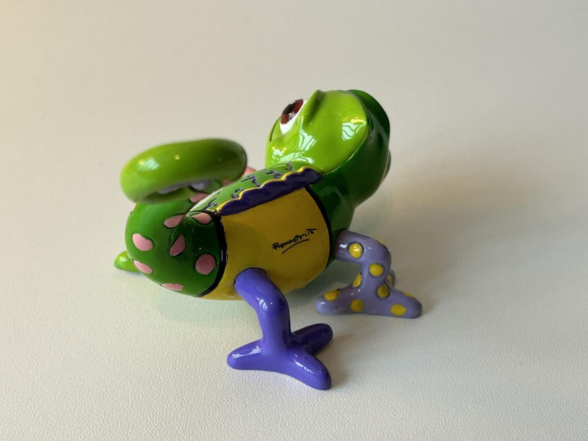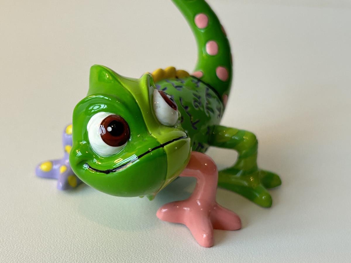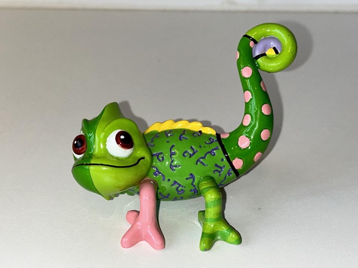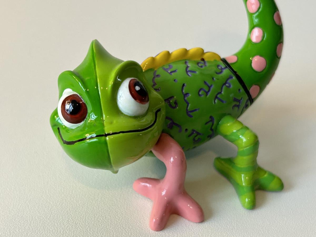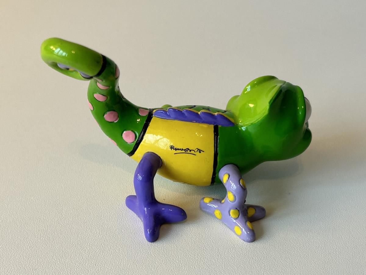 Origineel keramiek Disney-beeld en verzamelobject van de Chameleon uit Rapunzel, vervaardigd uit hoogwaardige polyresin steenhars door kunstenaar Romero Britto. Afmeting: H: 5.99cm X W: 6.5cm X D: 9.5cm. Staat/conditie: Perfecte nieuwstaat, zonder originele verpakking en verpakkingsdoos. Uitgever: Enesco/Romero Britto. Reeks/collectie: Disney by Britto uit Popshop Gallery (shopbritto.com) - Showcase collection. Authenticiteitszegel onderaan het beeld (zie foto's) en handtekening in beeld gegraveerd (zie foto). Galerijprijs: 100 dollar (zie shopbritto.com). Beelden nemen in waarde toe, vermits ze gelimiteerd worden geproduceerd en momenteel niet meer worden vervaardigd. Braziliaans kunstenaar Romero Britto staat bekend om zijn vrolijke en bonte gebruik van kleuren en patronen. Hij combineert klassieke Disney-figuren met pop-art-designs, De beeldjes zijn stuk voor stuk herkenbare Disney-karakters, maar gezien door de ogen van Britto. Een lust voor het oog en een kleurrijke eyecatcher in je interieur. De beelden worden handbeschilderd, dus minimale afwijkingen in kleur en/of afwerking kunnen voorkomen.