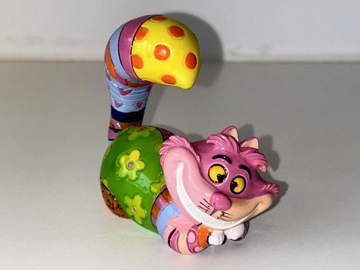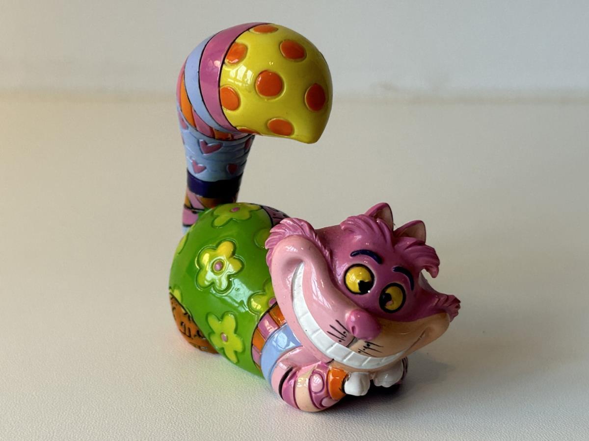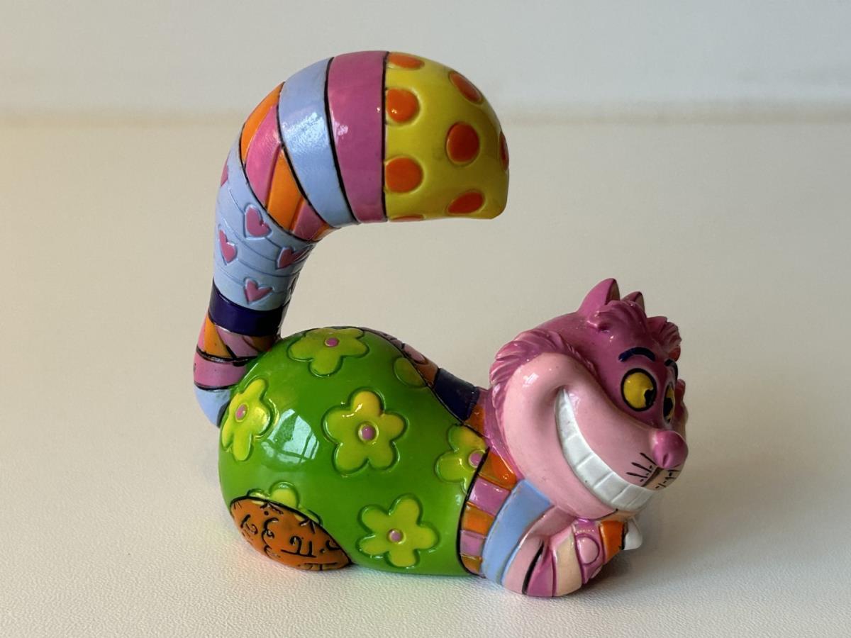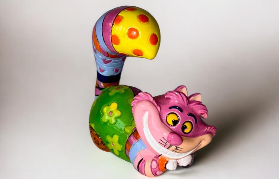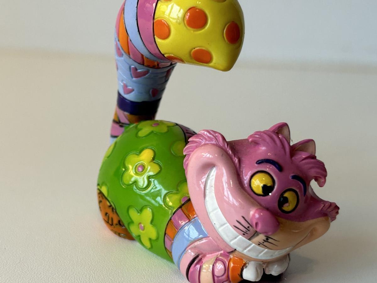 Origineel keramiek Disney-beeld en verzamelobject van de kat (Cheshire Cat) uit Alice in Wonderland, vervaardigd uit hoogwaardige polyresin steenhars door kunstenaar Romero Britto. Afmeting: +/- 9 à 10 cm. Staat/conditie: Perfecte nieuwstaat, zonder originele verpakking en verpakkingsdoos. Uitgever: Enesco/Romero Britto. Reeks/collectie: Disney by Britto uit Popshop Gallery (shopbritto.com) - Showcase collection. Authenticiteitszegel onderaan het beeld (zie foto's) en handtekening in beeld gegraveerd (zie foto). Galerijprijs: 100 dollar (zie shopbritto.com). Beelden nemen in waarde toe, vermits ze gelimiteerd worden geproduceerd en momenteel niet meer worden vervaardigd. Braziliaans kunstenaar Romero Britto staat bekend om zijn vrolijke en bonte gebruik van kleuren en patronen. Hij combineert klassieke Disney-figuren met pop-art-designs, De beeldjes zijn stuk voor stuk herkenbare Disney-karakters, maar gezien door de ogen van Britto. Een lust voor het oog en een kleurrijke eyecatcher in je interieur. De beelden worden handbeschilderd, dus minimale afwijkingen in kleur en/of afwerking kunnen voorkomen.
