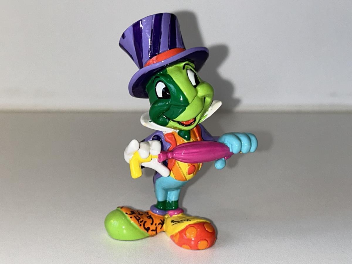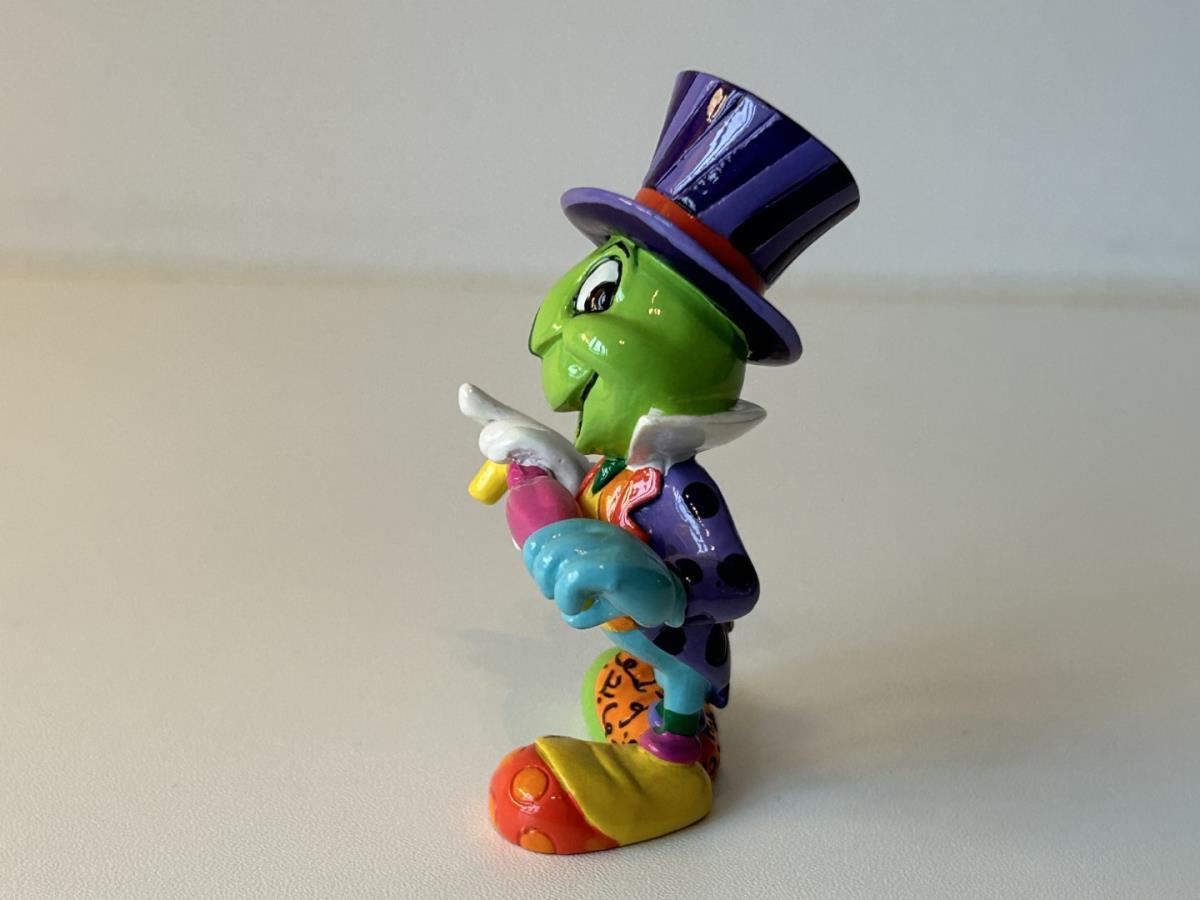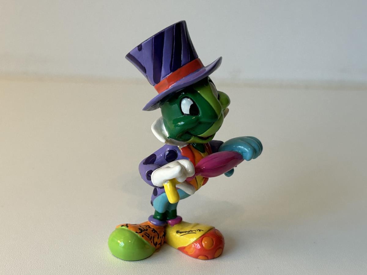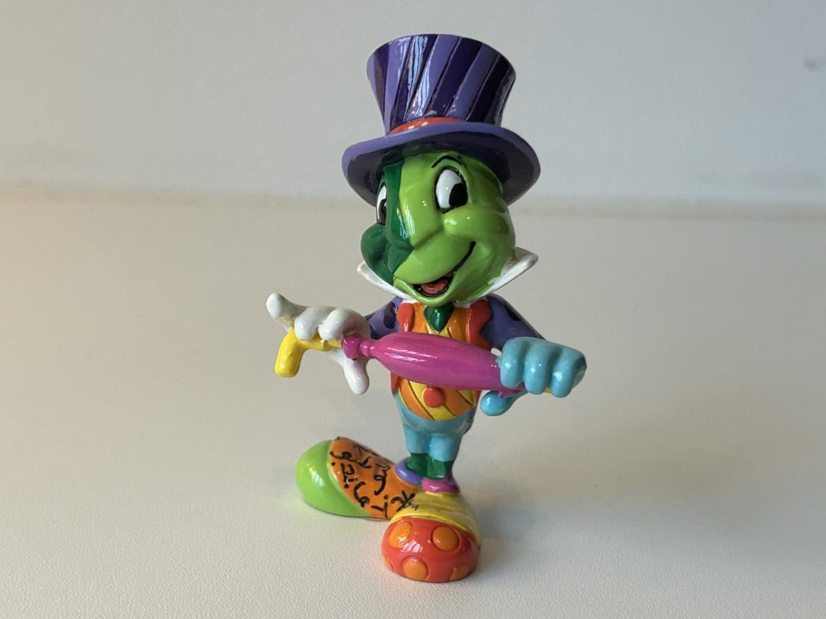 Origineel keramiek Disney-beeld en verzamelobject van Japie Krekel uit Pinokkio, vervaardigd uit hoogwaardige polyresin steenhars door kunstenaar Romero Britto. Afmeting: 8.99cm X 3.81cm. Staat/conditie: Perfecte nieuwstaat, zonder originele verpakking en verpakkingsdoos. Uitgever: Enesco/Romero Britto. Reeks/collectie: Disney by Britto uit Popshop Gallery (shopbritto.com) - Showcase collection. Authenticiteitszegel onderaan het beeld (zie foto's) en handtekening in beeld gegraveerd (zie foto). Galerijprijs: 100 dollar (zie shopbritto.com). Beelden nemen in waarde toe, vermits ze gelimiteerd worden geproduceerd en momenteel niet meer worden vervaardigd. Braziliaans kunstenaar Romero Britto staat bekend om zijn vrolijke en bonte gebruik van kleuren en patronen. Hij combineert klassieke Disney-figuren met pop-art-designs, De beeldjes zijn stuk voor stuk herkenbare Disney-karakters, maar gezien door de ogen van Britto. Een lust voor het oog en een kleurrijke eyecatcher in je interieur. De beelden worden handbeschilderd, dus minimale afwijkingen in kleur en/of afwerking kunnen voorkomen.