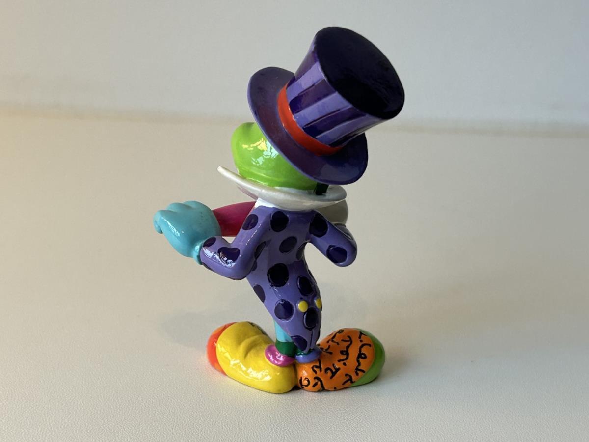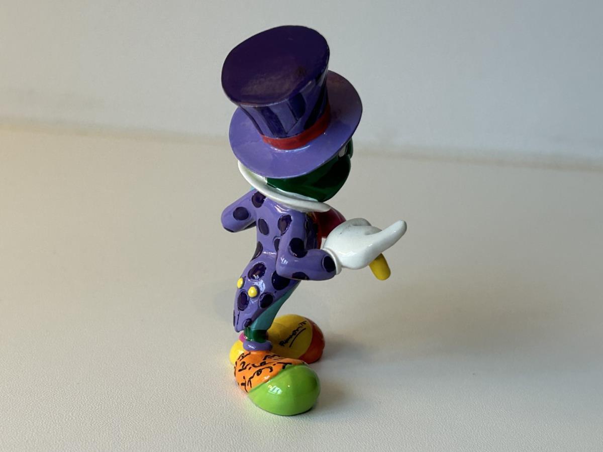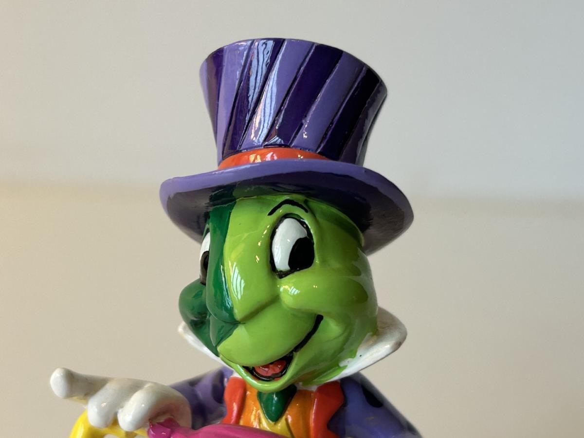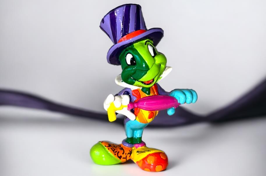 Origineel keramiek Disney-beeld en verzamelobject van Japie Krekel uit Pinokkio, vervaardigd uit hoogwaardige polyresin steenhars door kunstenaar Romero Britto. Afmeting: 8.99cm X 3.81cm. Staat/conditie: Perfecte nieuwstaat, zonder originele verpakking en verpakkingsdoos. Uitgever: Enesco/Romero Britto. Reeks/collectie: Disney by Britto uit Popshop Gallery (shopbritto.com) - Showcase collection. Authenticiteitszegel onderaan het beeld (zie foto's) en handtekening in beeld gegraveerd (zie foto). Galerijprijs: 100 dollar (zie shopbritto.com). Beelden nemen in waarde toe, vermits ze gelimiteerd worden geproduceerd en momenteel niet meer worden vervaardigd. Braziliaans kunstenaar Romero Britto staat bekend om zijn vrolijke en bonte gebruik van kleuren en patronen. Hij combineert klassieke Disney-figuren met pop-art-designs, De beeldjes zijn stuk voor stuk herkenbare Disney-karakters, maar gezien door de ogen van Britto. Een lust voor het oog en een kleurrijke eyecatcher in je interieur. De beelden worden handbeschilderd, dus minimale afwijkingen in kleur en/of afwerking kunnen voorkomen.