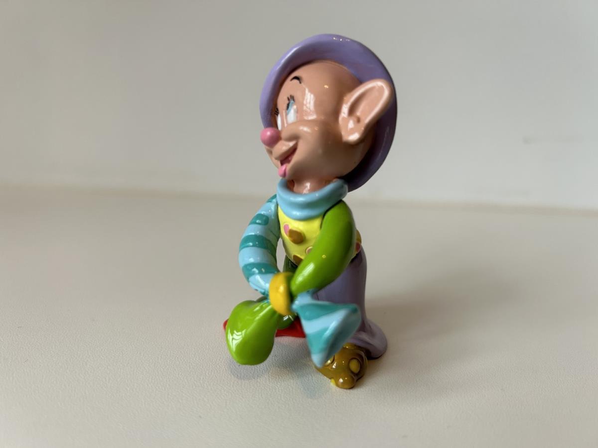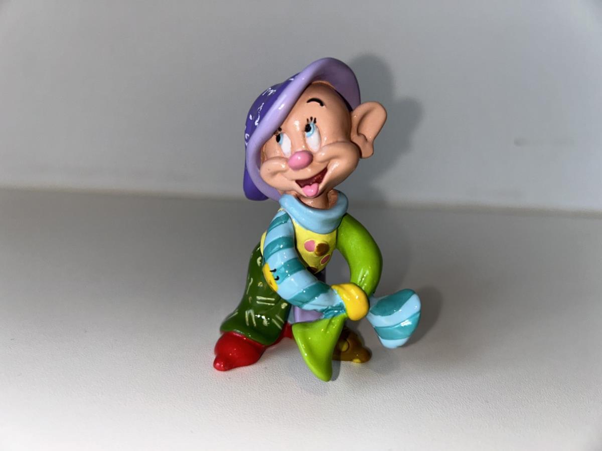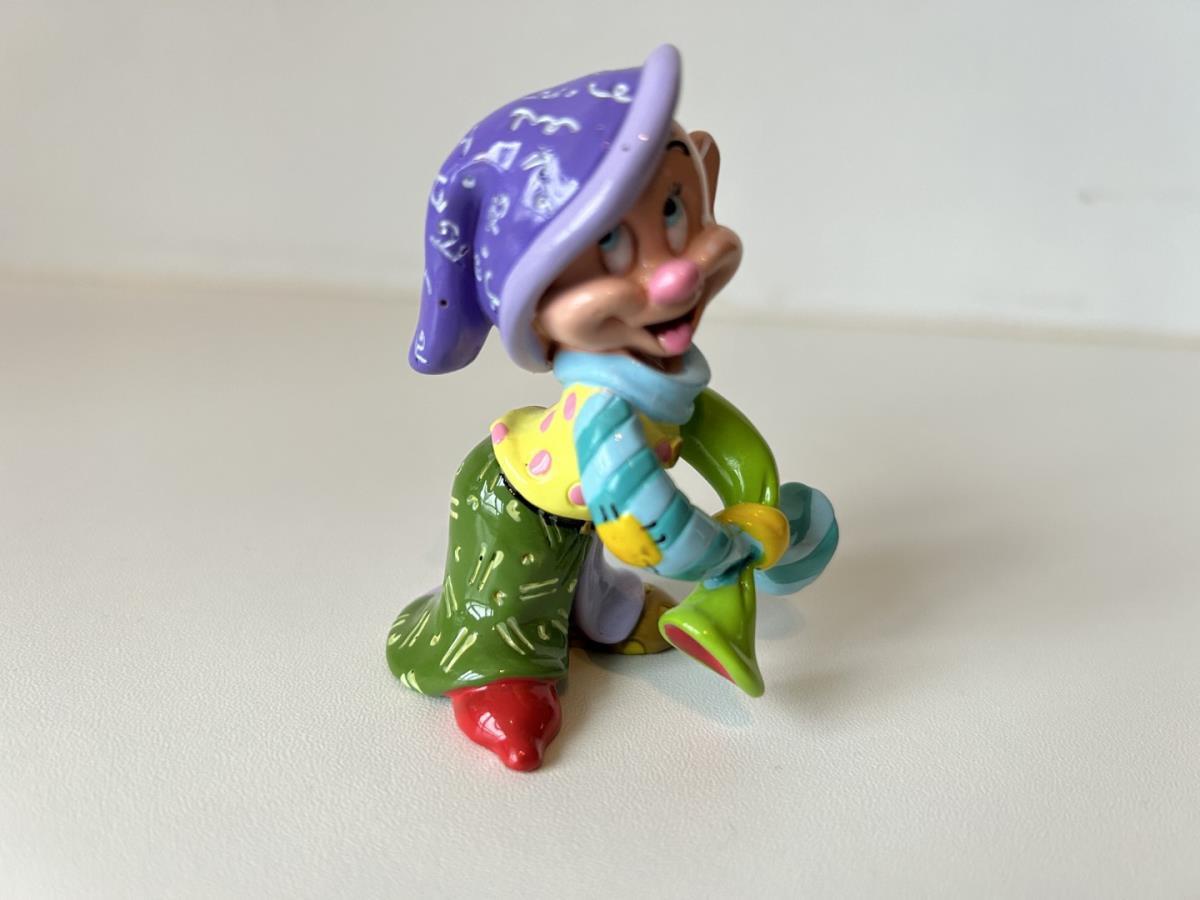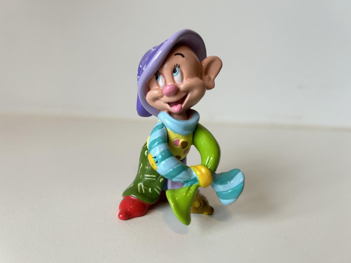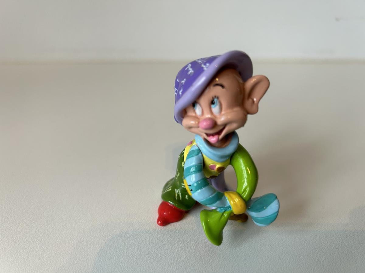 Origineel keramiek Disney-beeld en verzamelobject van Sleepy kabouter uit Sneeuwwitje en de zeven dwergen, vervaardigd uit hoogwaardige polyresin steenhars door kunstenaar Romero Britto. Afmeting: H: 11.94cm X W: 3.99cm X D: 5.49cm. Staat/conditie: Perfecte nieuwstaat, zonder originele verpakking en verpakkingsdoos. Uitgever: Enesco/Romero Britto. Reeks/collectie: Disney by Britto uit Popshop Gallery (shopbritto.com) - Showcase collection. Authenticiteitszegel onderaan het beeld (zie foto's) en handtekening in beeld gegraveerd (zie foto). Galerijprijs: 50 dollar (zie shopbritto.com). Beelden nemen in waarde toe, vermits ze gelimiteerd worden geproduceerd en momenteel niet meer worden vervaardigd. Braziliaans kunstenaar Romero Britto staat bekend om zijn vrolijke en bonte gebruik van kleuren en patronen. Hij combineert klassieke Disney-figuren met pop-art-designs, De beeldjes zijn stuk voor stuk herkenbare Disney-karakters, maar gezien door de ogen van Britto. Een lust voor het oog en een kleurrijke eyecatcher in je interieur. De beelden worden handbeschilderd, dus minimale afwijkingen in kleur en/of afwerking kunnen voorkomen.