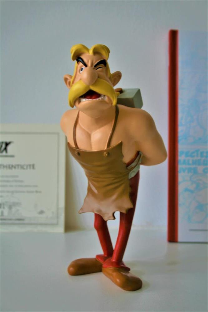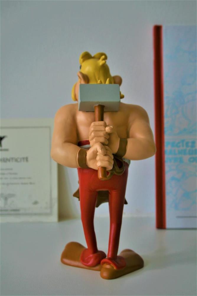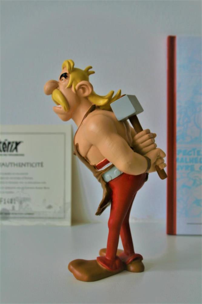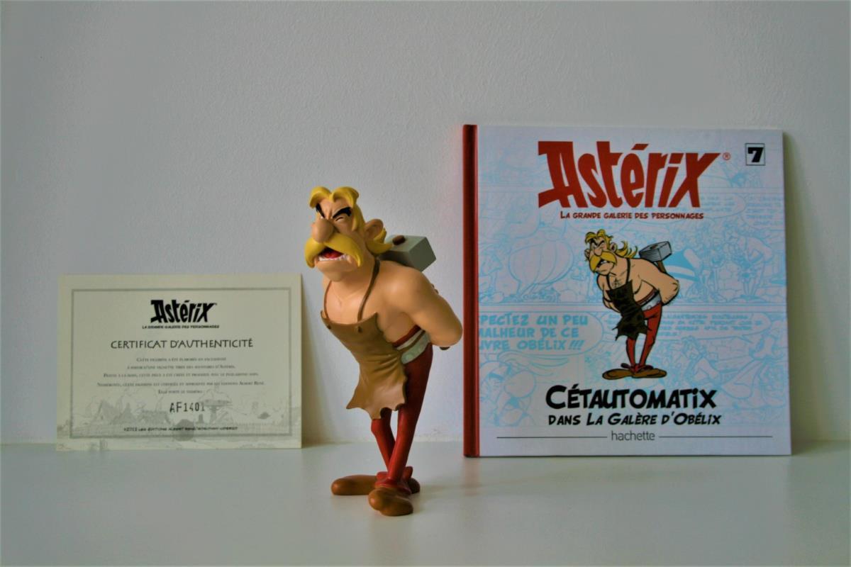 Asterix en Obelix Beeldje uit kwalitatief geverfde kunsthars van "Hoefnix/Cétautomatix" (nr. 7) uit het album "De beproeving van Obelix (1996)". Verzamelfiguur uitgegeven door Hachette in 2012 in de serie "La Grande Galerie des personages d'Asterix". Editie: Albert René/Goscinny-Uderzo. Figuur bevat een Franstalig echtheidscertificaat (zie foto) en een 32-bladige Franstalige monografie over personage (zie foto). Verkoopsstaat: nieuwstaat, niet in originele verpakking. De personages uit de serie/editie hebben een hoogte ca. 8 tot 18 cm, afhankelijk van het individuele personage. De uitgave van het figuur uit kunsthars kent een beperkte oplage vanwege het unieke echtheidscertificaat, waardoor het zeer zelden op veilingen aangeboden wordt. Extra info over personage: De smid van het dorp. Hij is nooit te beroerd om zijn mening te onderstrepen met zijn vuist of met zijn hamer. Hij is niet erg gesteld op de zangkunst van de bard Kakofonix of van de geur van de vis van Kostunrix.
