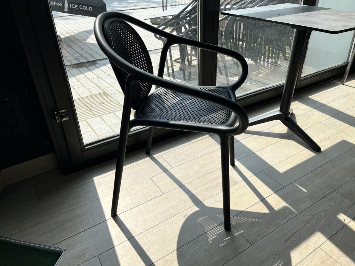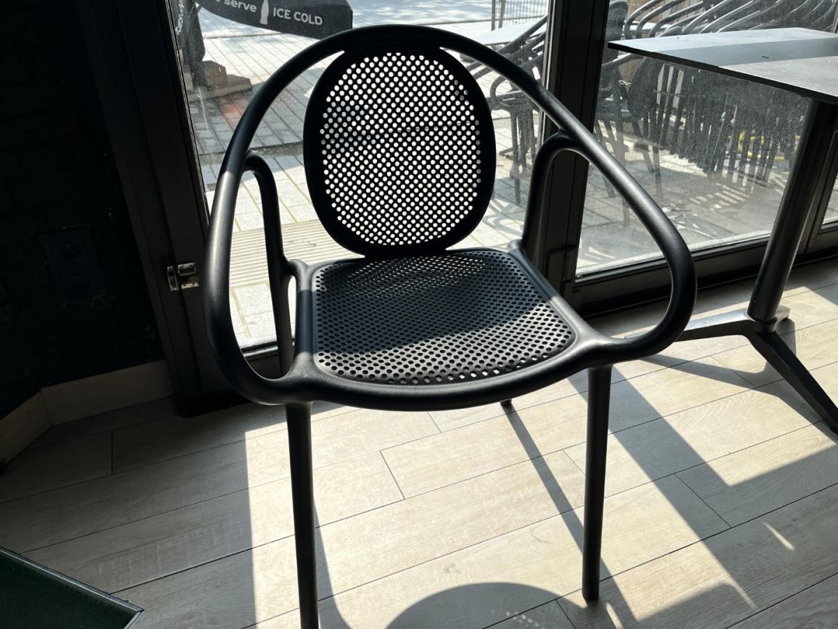 Stoelen zijn van pvc en tafels vv stalen voet