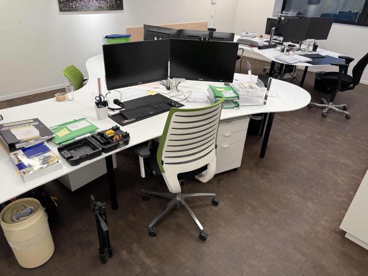 vv 2 div verrijbdare typistestoelen en 1 bijzetstoel, incl div klein bureaumaterialen + ladeblokken