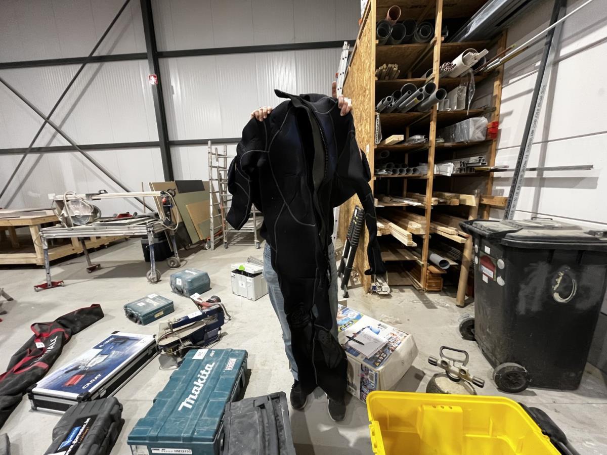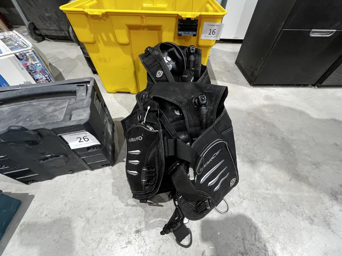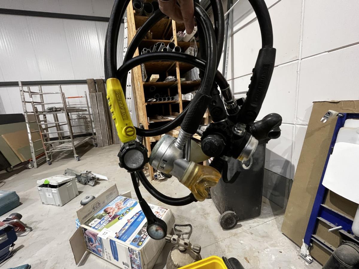 ligt in PVC bak, wo T-FORCE SCUBAPRO duikvesten, duikpak, handshoenen, schoenen, duiklood, gevulde duikfles…