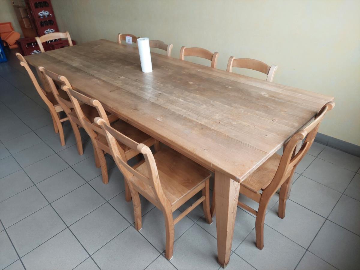 Lot number 29: 1 Grenenhouten tafel met 10 houten stoelen