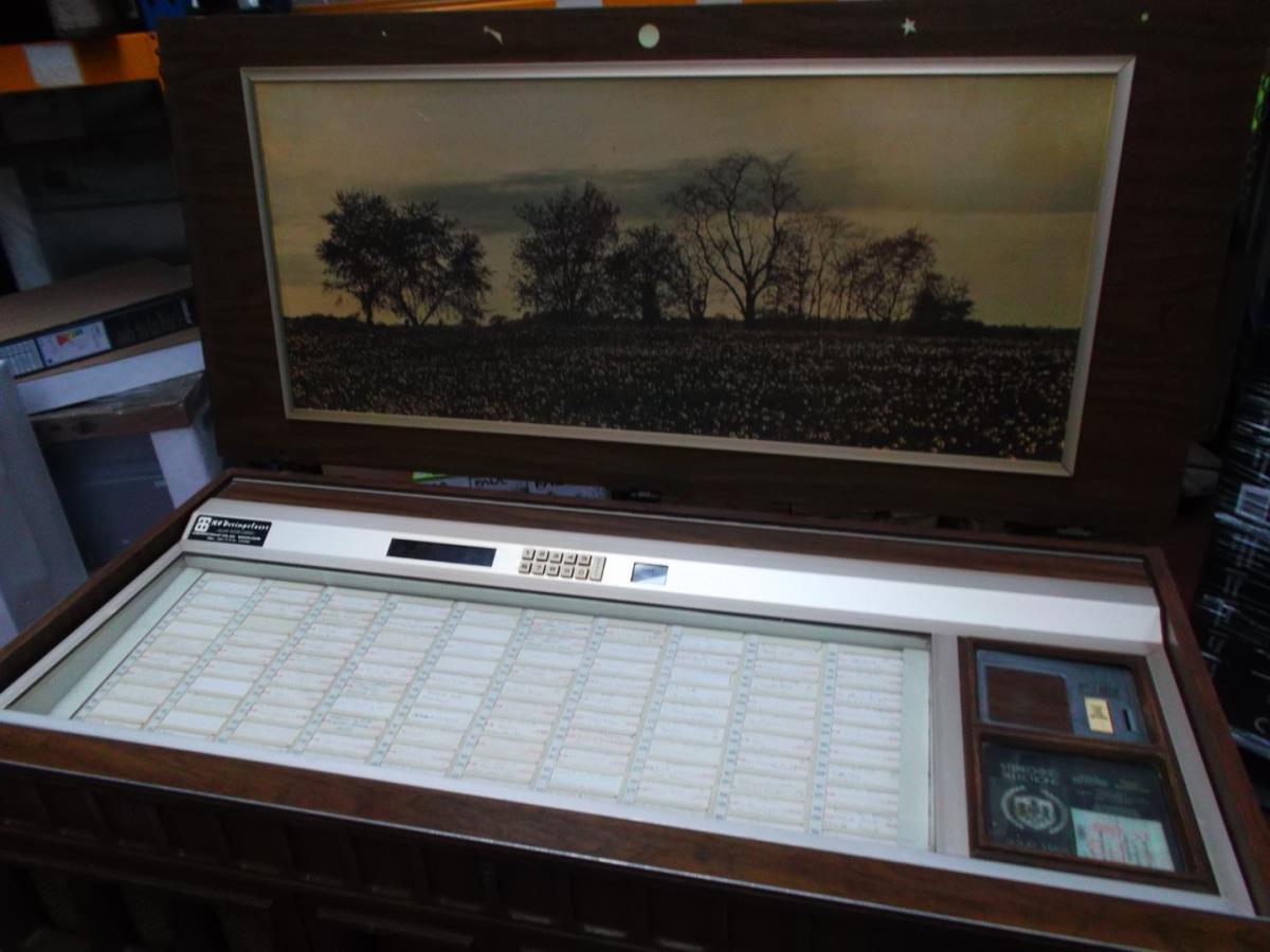 Jukebox op singles,houten kast,jaren 70,verzamelobject,schilderij binnen in