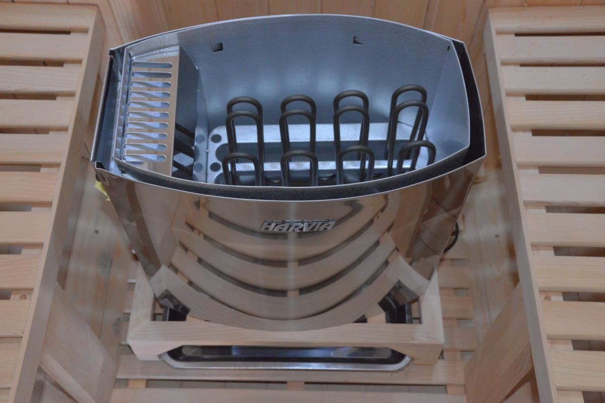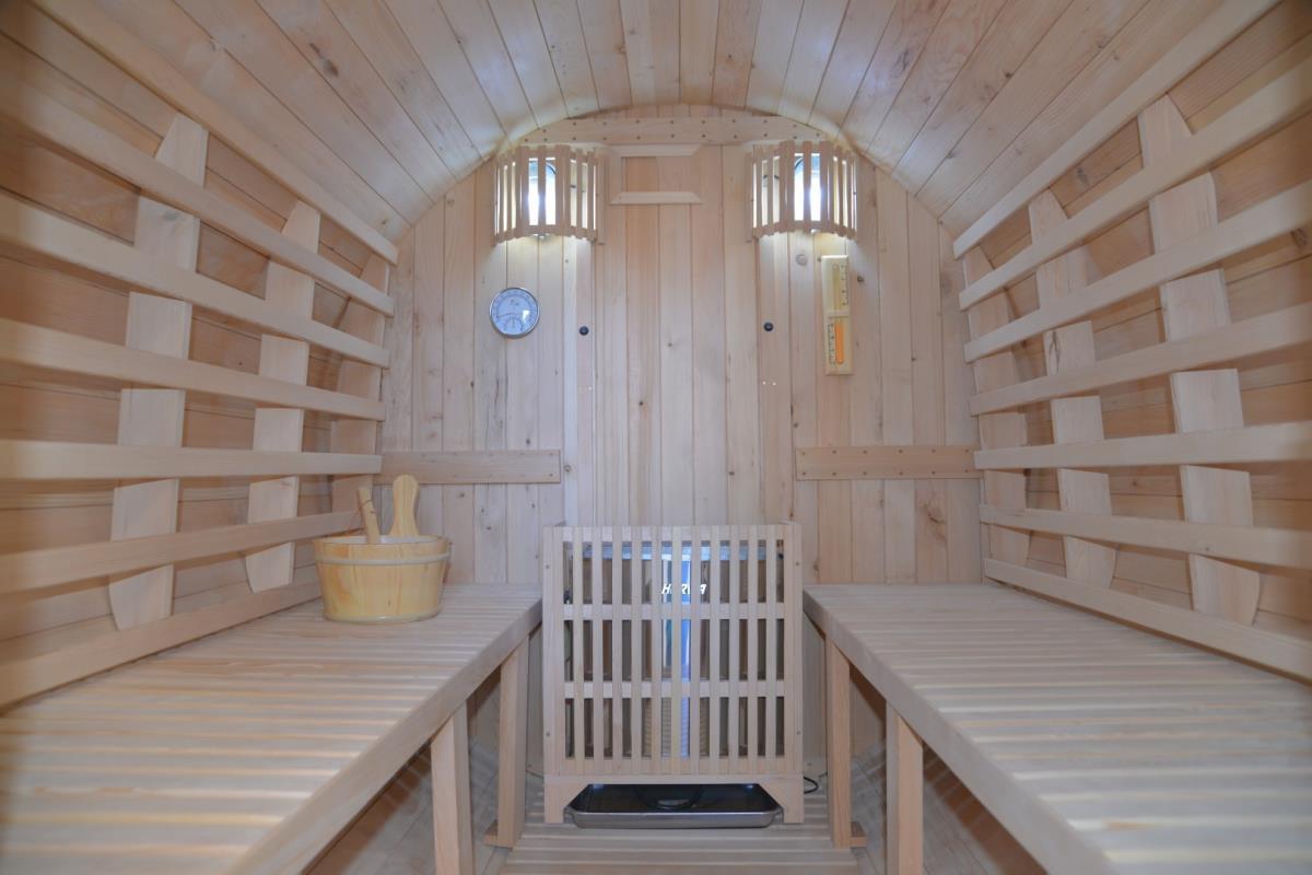 1x Buitensauna Barrel: getint glas, houtsoort: Canadian Hemlock; geschikt voor 4-6 personen, inclusief: thermometer, hygrometer, glazen zandloper, glazen sauna deur, 6KW kachel 'Harvia' op hout, afmeting: 2200x196 cm (LxH) Gewicht: Circa 500kg