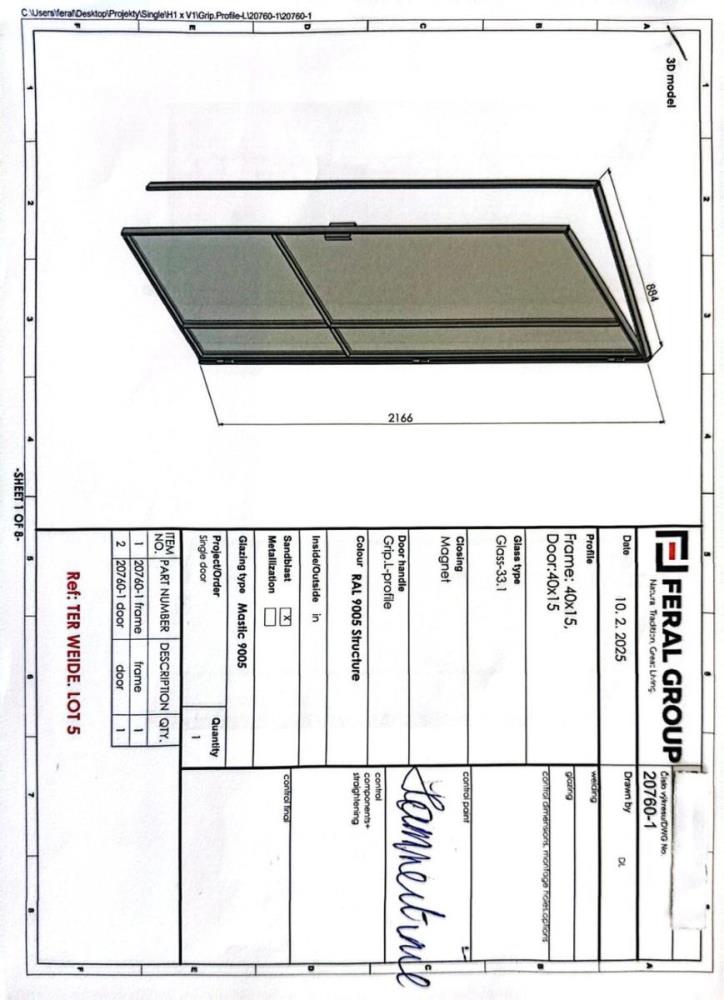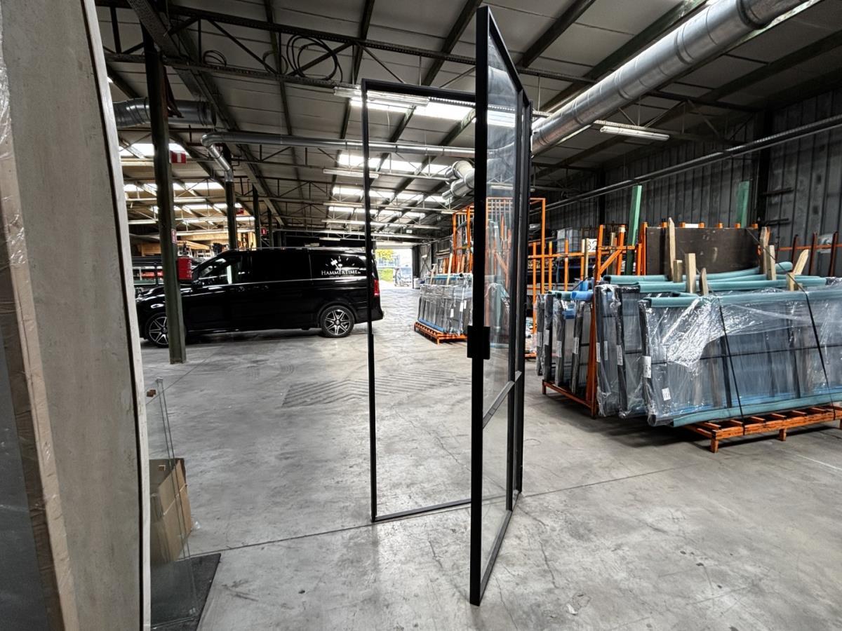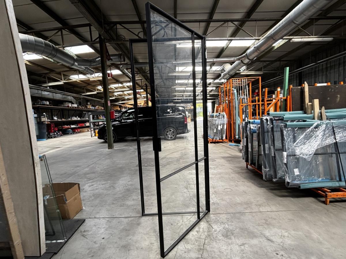Stalen binnendeur, 4 onderverdelingen. Opgebouwd uit kokerprofielen 40 x 15mm. Heldere veiligheidsbeglazing. Afmeting H2166 x B884. Gepoederlakt in Ral 9005 zwart, afgemastikeerd aan beide zijden. Verkoopprijs 1950€