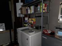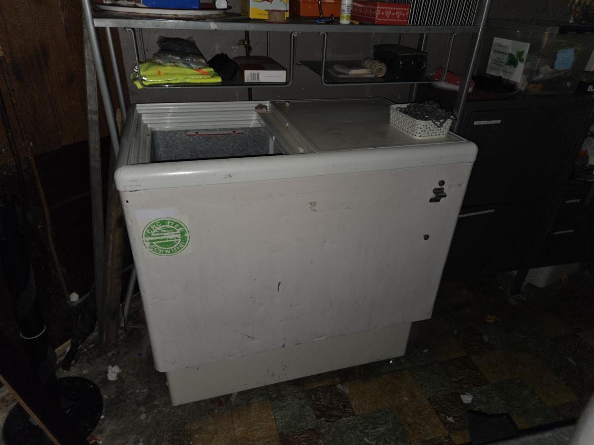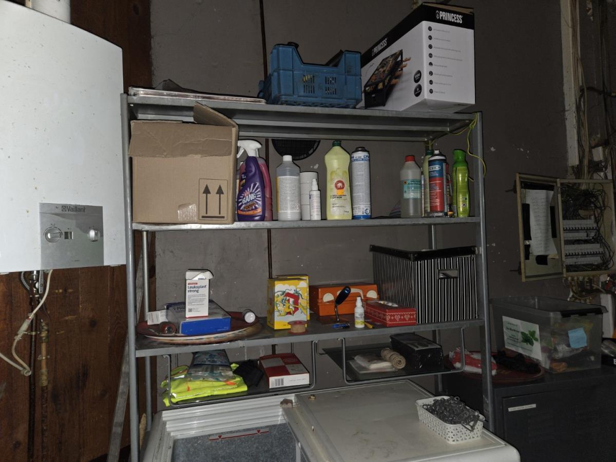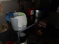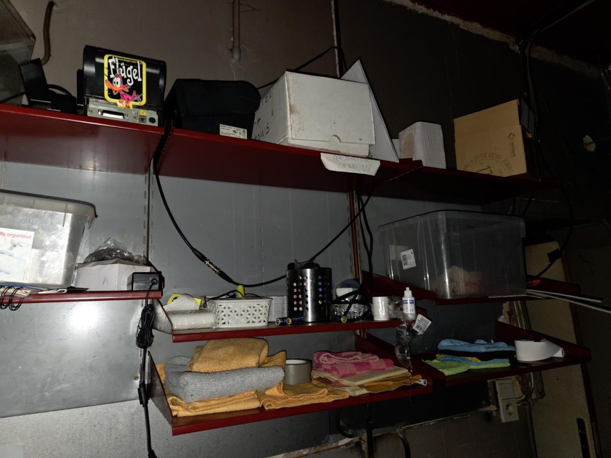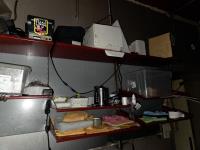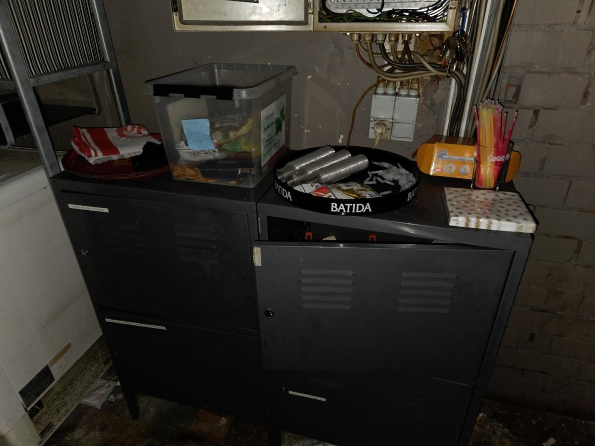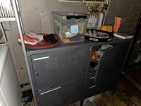 bu 2 metalen lockerkasten met inhoud, Metalen rek met inhoud, drankenkoeler, RVS Spoeltafel, Metalen wandschappen met inhoud.