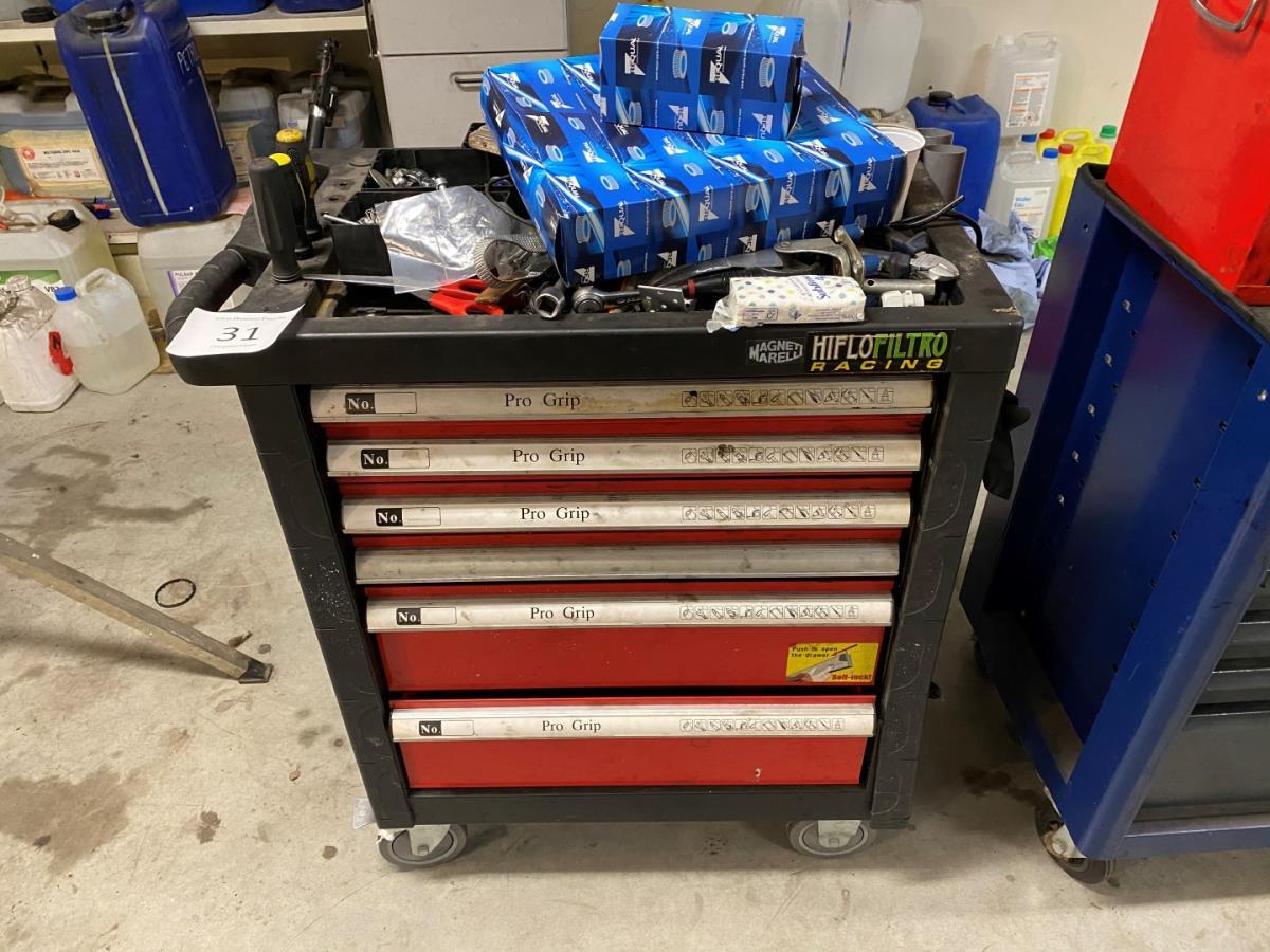 vv 6 lades met inhoud wo; doppensleutelsets, tangen, steeksleutels, schroevendraaiers, inbussleutels, startkabels, moeren en bouten, filters, …