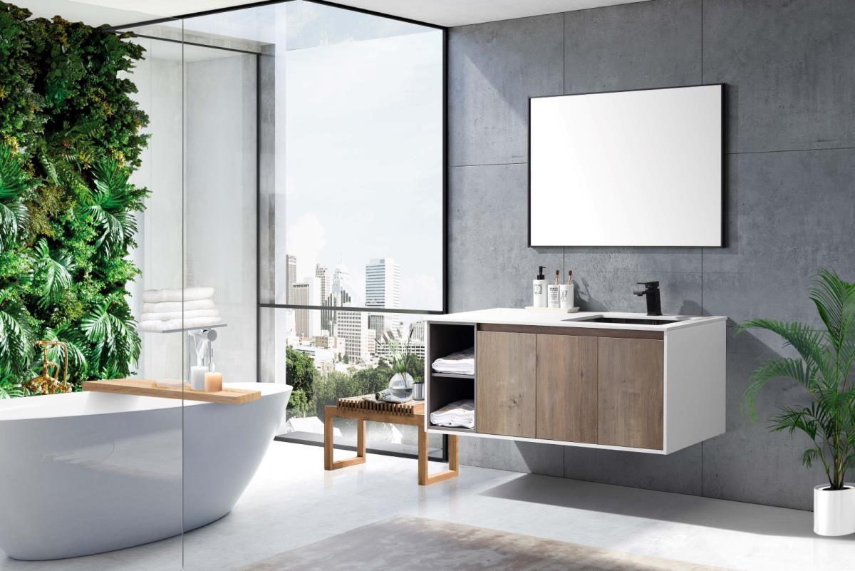 1 st. Design Badkamermeubel 120 cm - Kleur: melamine en white - Ophangmeubel 120 cm (119x57x48 cm) - De onderkast van de badkamerkast bevat 3 deuren en is voorzien van een softclose systeem en 2 legplanken - Marmerenblad (120x57x19 cm) - Porselein wastafel - bevestigingsbeugels inclusief - Spiegel en kraanset niet incl. YTG99-120 R