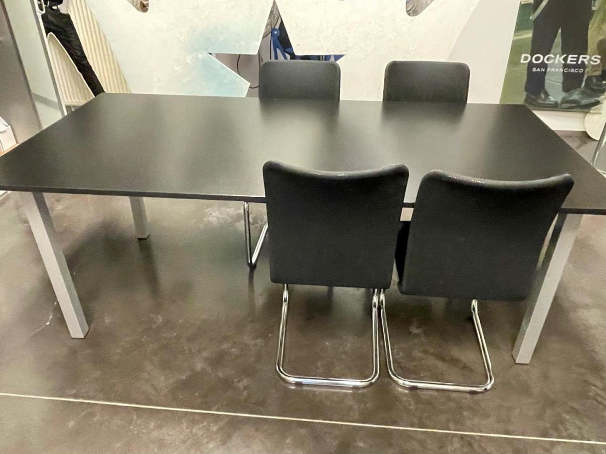 bu: tafels, stoelen, wandkast, kledingrek