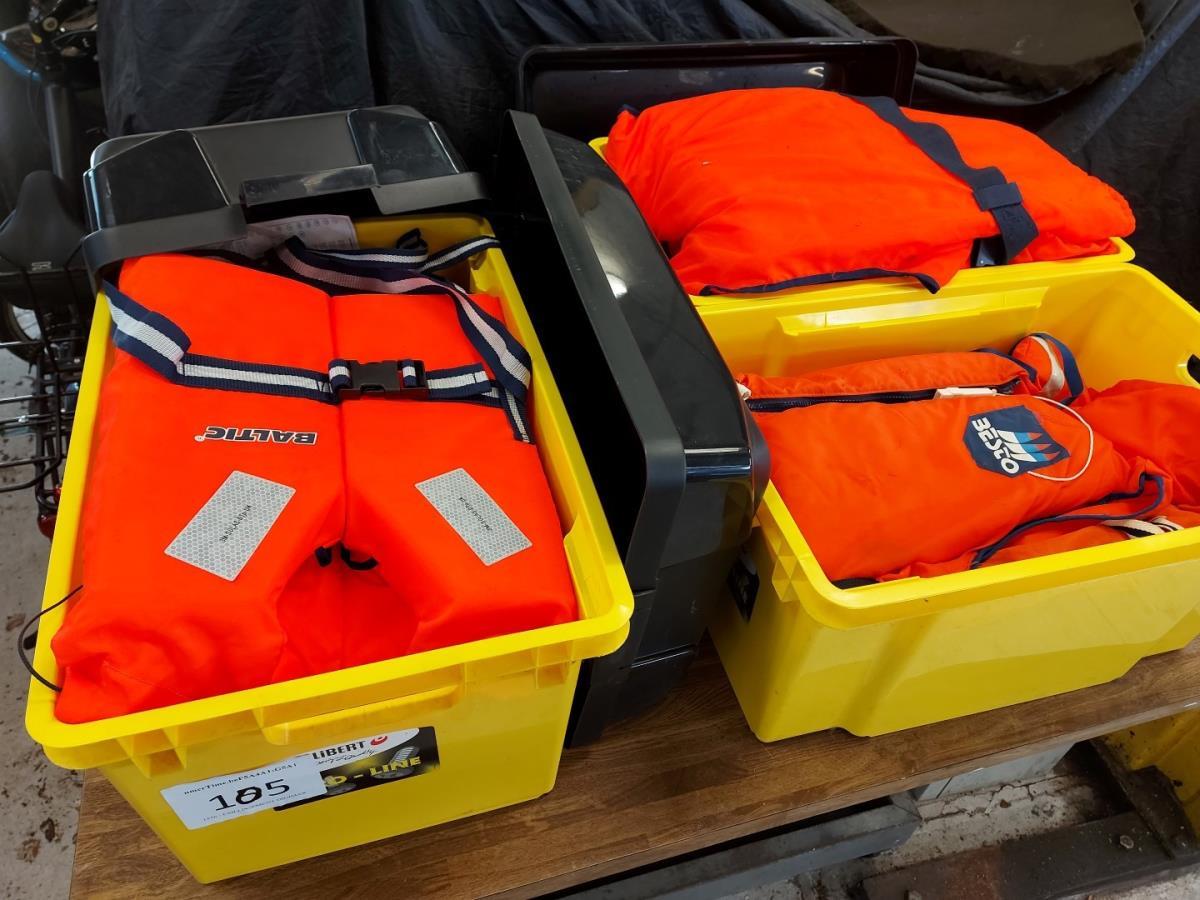 Numéro du lot 105: 3 PVC opbergbakken met diverse reddingsvesten