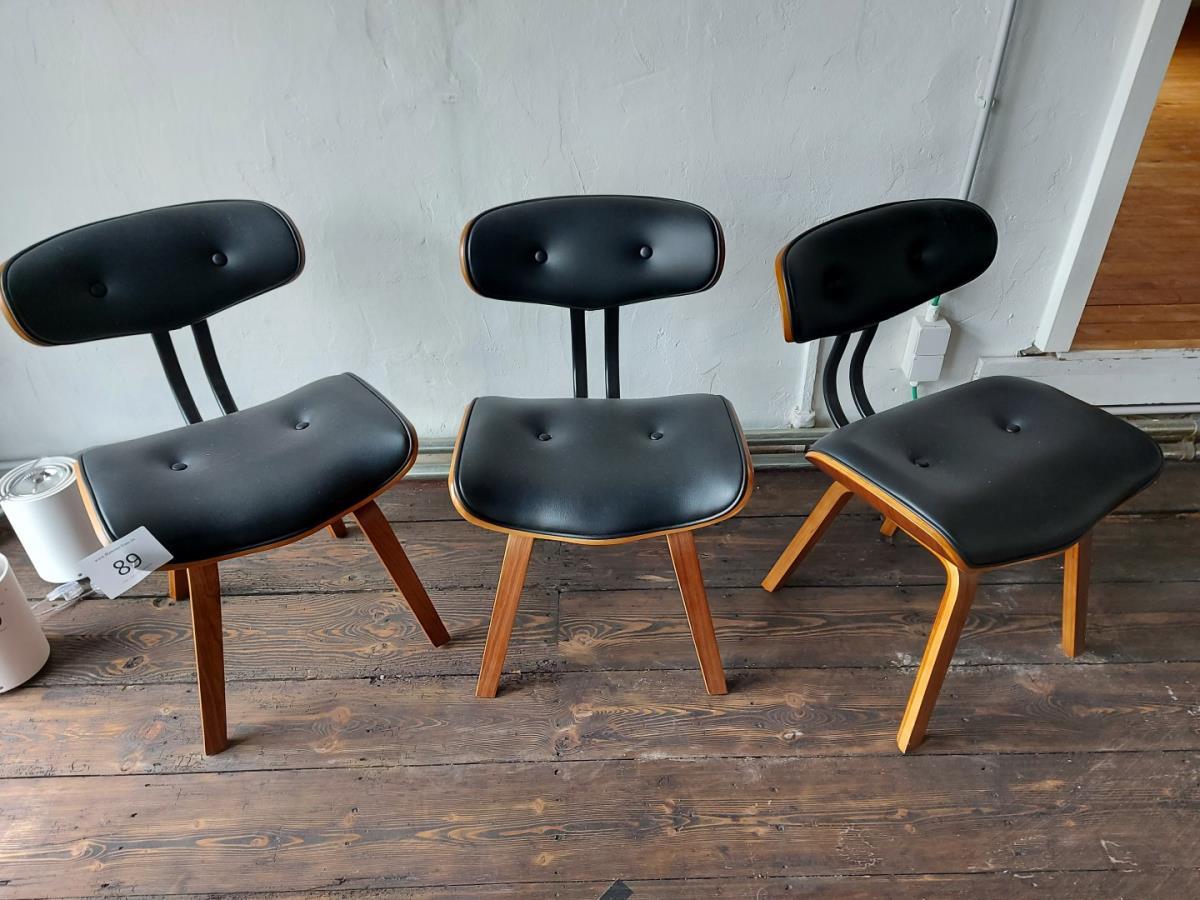 Numéro du lot 89: 3 Houten stoelen met zwart kunstlederen zit en rugleuning