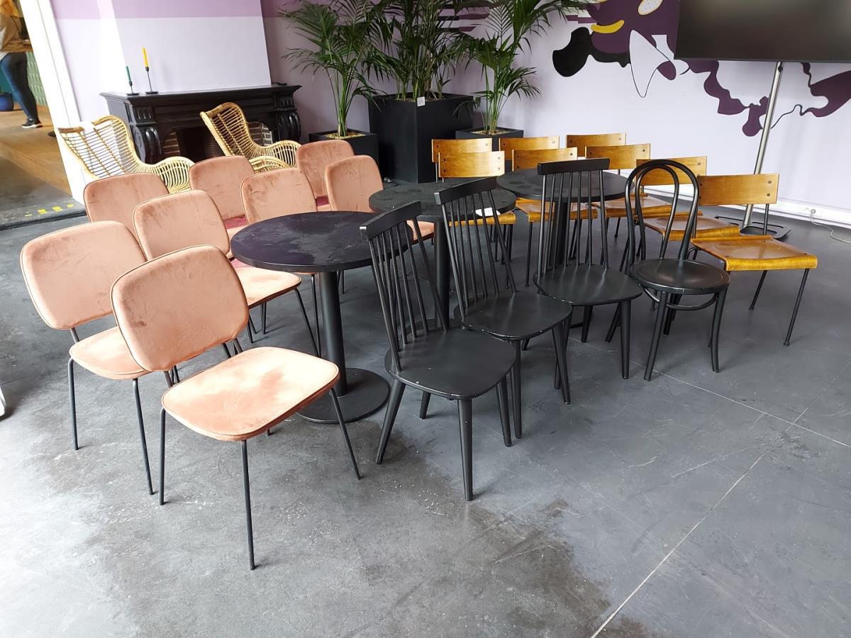 3 ronde bistro tafels, 8 stoffen bistro stoelen, 9 houten bistro stoelen, 4 houten stoelen,