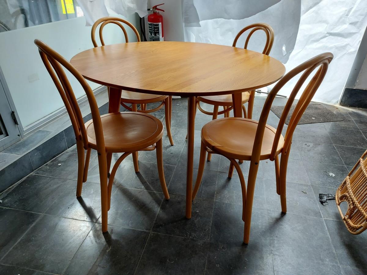 1 ronde tafel vv. 4 houten stoelen