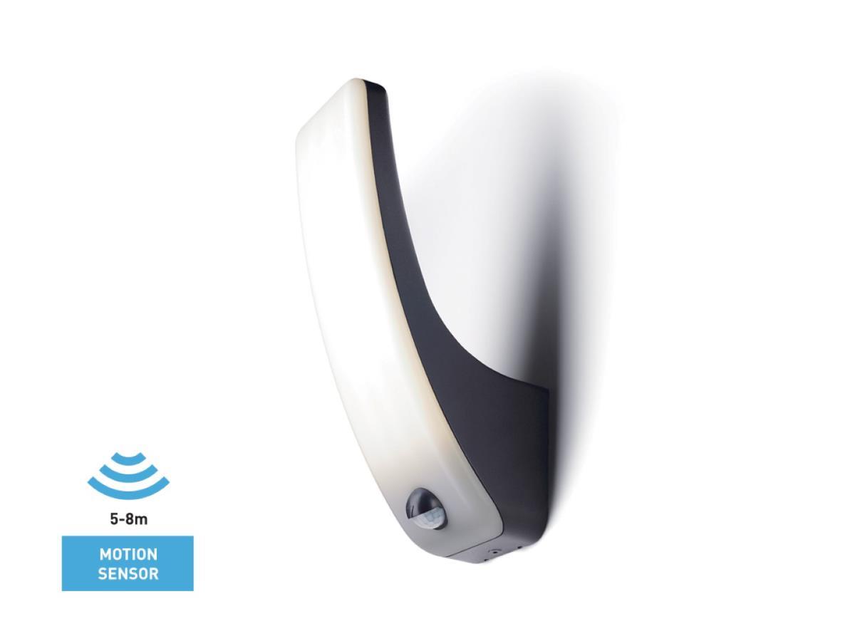 8 x 15 watt LED Wandlamp gebogen design zand zwart warm wit - lichtkleur 3000K warm wit - lichtstroom 800 lumen - SMD LED - IP54 waterdicht - materiaal aluminum en opal PC diffuser - afm 262 x 145 x 85mm - met bewegingssensor breikt 5-8m - de lichtduur is instelbaar van 4 seconden tot 4 minuten en de detectiehoek is 120 graden - voltage 220-240V - bevestiging inclusief - geschikt voor binnen en buiten - energielabel A+