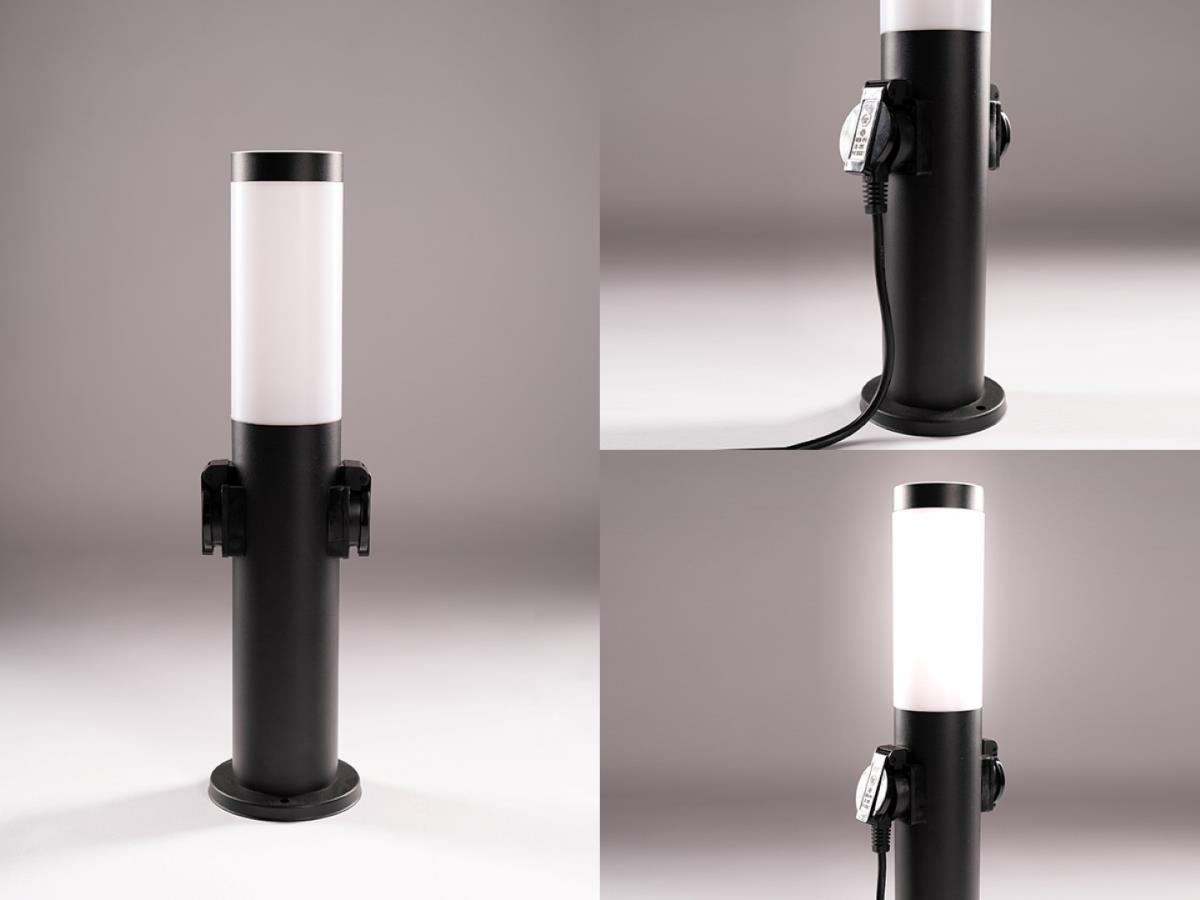 4 x Tuinlamp cilinder E27 fitting zand zwart waterdicht met 2 stopcontacten - IP54 waterdicht - afm. Ø 110 x 450mm- materiaal roestvfrij staal en PC diffuser - bevestiging inclusief - 2 x stopcontacten met deksel - bulb niet inbegrepen - geschikt voor buiten - een bulb invoer - voltage 220-240V - max 15 watt - Staande buitenlamp - SKU 00711