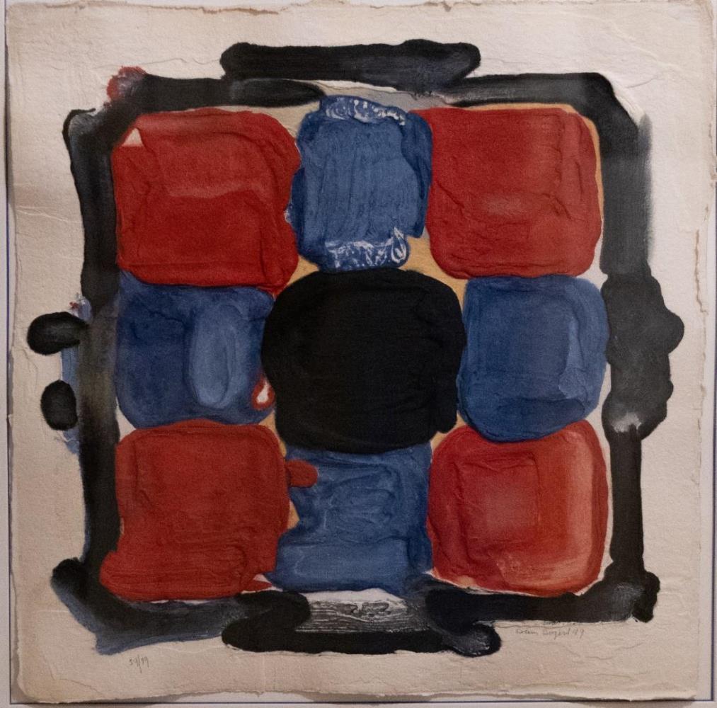 Bram Bogart (1921-2012) was een Nederlands/Belgisch abstracte kunstschilder, beeldhouwer, graficus, keramist en ontwerper. De kunstenaar zocht vernieuwing door gebruik van eenvoudige geometrische motieven en werd ook beïnvloed door Japanse kalligrafie. Bram Bogart werkte aanvankelijk nog figuratief maar ging al gauw zijn eigen weg, volstrekt los van elke stroming, beweging of groepering. Vanaf begin jaren zestig komt een grote ommekeer in het werk van Bogart door het gebruik van een gekleurde cementachtige specie. Met lijn- en standolie, pigment, dikke pasta, cement, kleurstoffen mengt alchemistisch Bogart zijn eigen verf, het materiaal voor zijn uitbeeldingen die nu puur non figuratief zijn. De werken van Bram Bogart hebben altijd een monumentaal karakter. Mede op grond van zijn revolutionaire materiaalbehandeling en innovatieve techniek rekenen kunsthistorici Bram Bogart tot een van de belangrijke representanten van de zogenaamde materieschilderkunst. Zijn werken zijn wereldwijd opgenomen in belangrijke museumcollecties, collecties van vooraanstaande particulieren en grote bedrijfscollecties.